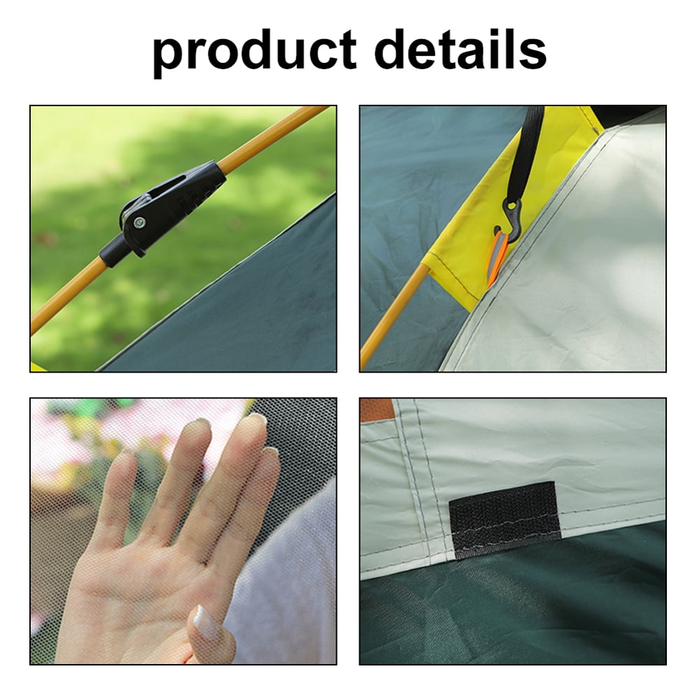 Dcenta 2/3/4 Person Camping Tent Spacious: The 4 person tent designed for a roomy and overall cozy experience. The camping tent with a center height of 4.4ft and 6.9 * 6.6ft base size, and it is a spacious backpacking tent with plenty of space. Great tent for camping Stable & Safe: Use 190T waterproof polyester fabric, To keep your items dry, the durable fabric on the outdoor tent body and the rain fly help to ensure water does not make rain infiltration of your tent for a dry trip. Ideal family tents for camping Convenient Design: Tent with 2 doors and 2 window, equipped with breathable fine mesh, to promote air circulation in the tent, not stuffy, and effectively prevents the entry of mosquitoes, makes it easy to bring electrical power inside Easy Set-Up & Carry: Portable camping tent with automatic bracket, 3 seconds quick open, no set up, convenient and time saving, greatly enhance the user experience.The carry bag weighs only 7.7lbs, and a large tent can be store in the car without taking up much space Lightweight & Portable: When you finish your trip, you can simply place components back into the zippered carry bag to pack up and transport. The good design makes a lightweight tent is suitable for outdoor, hiking, traveling, fishing, etc Dcenta 2/3/4 Person Camping Tent Color: Dark Green/Blue(optional) Material: 190T Waterproof Polyester Fabric Item Size: 6.9 * 6.6 * 4.4ft Packing List:1 * Camping Tent, 8 * Ground Nail, 4 * Windproof Rope, 1 * Storage Bag, 1 * Rainproof Cover
