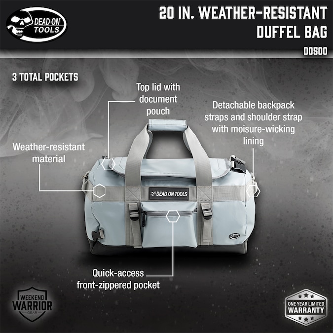 The Dead On Tools 20 in. Weather Resistant Duffel Bag is the ideal duffel for any and all of your traveling needs. This duffel features two padded backpack straps for increased comfort and functionality, while also allowing use for the traditional style carrying handles and shoulder strap. This duffel is made of weather resistant material, so don’t be afraid to toss your new duffel wherever it’ll fit. Add this duffel to your worksite storage, travel luggage, or use for any other storage needs and your items will stay secure and protected.