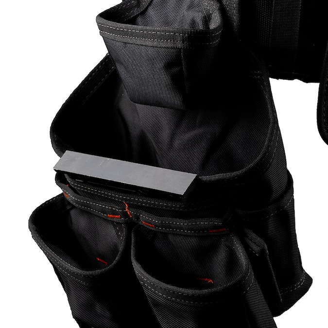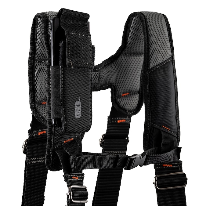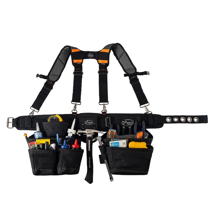 Made from an industry-leading 2-ply, 1680 denier heavyweight poly fabric for lasting durability. Pouches and suspenders can be removed or adjusted for customized tool organization. Barrel-bottom, reinforced pouches allow extra carrying capacity. Tool bag set features one steel hammer holder and an additional loop for and an additional loop for hammers or other long-handled tools, cats-paw sleeves and a tape measure clip. Infinity belt can be adjusted up to a 52” waist using thick steel grommets. LoadBear®stretch suspension technology allows the weight of the tool belt to move comfortably with your body while at work. Suspenders have moisture-wicking padding and feature a cell phone pocket that fits most smart phones.