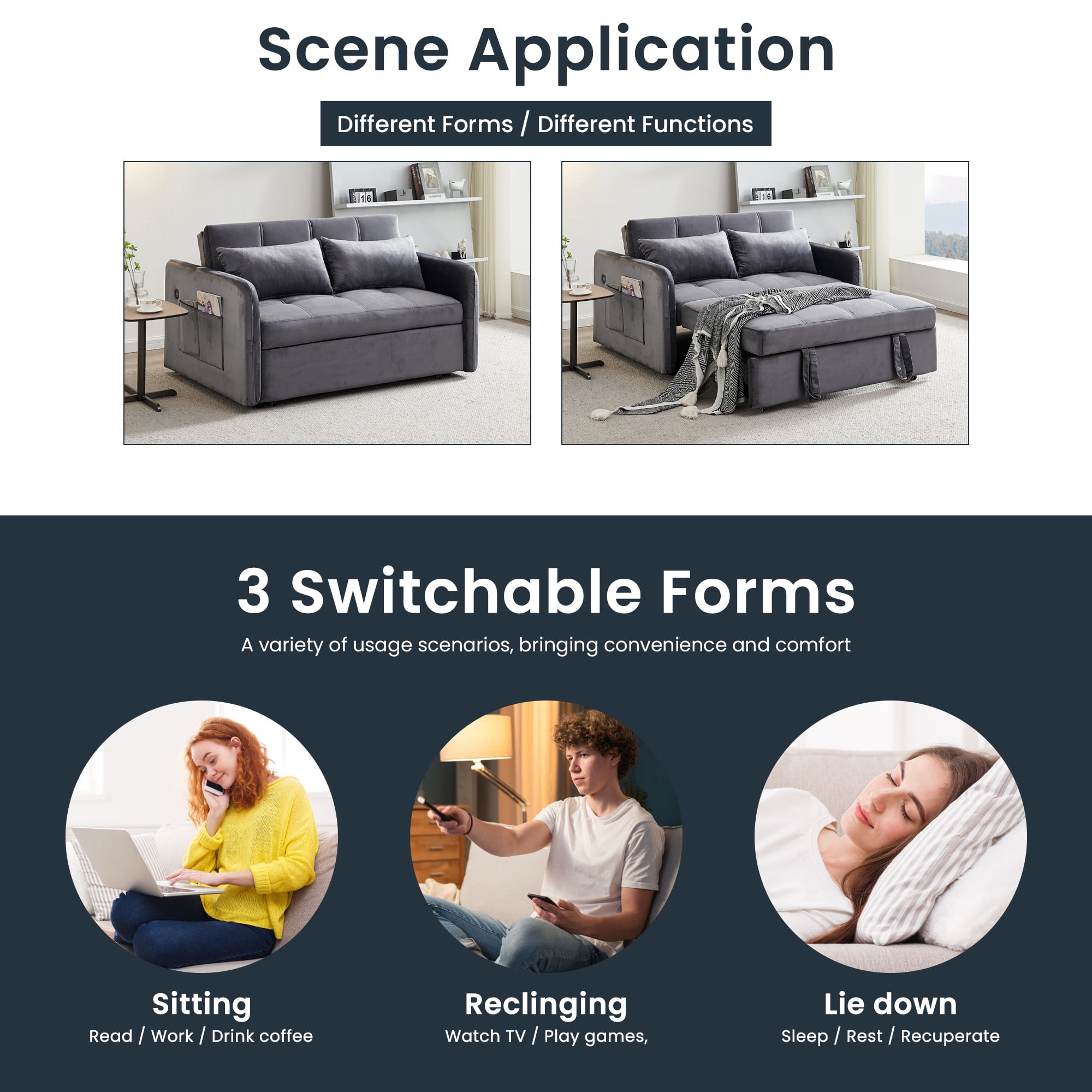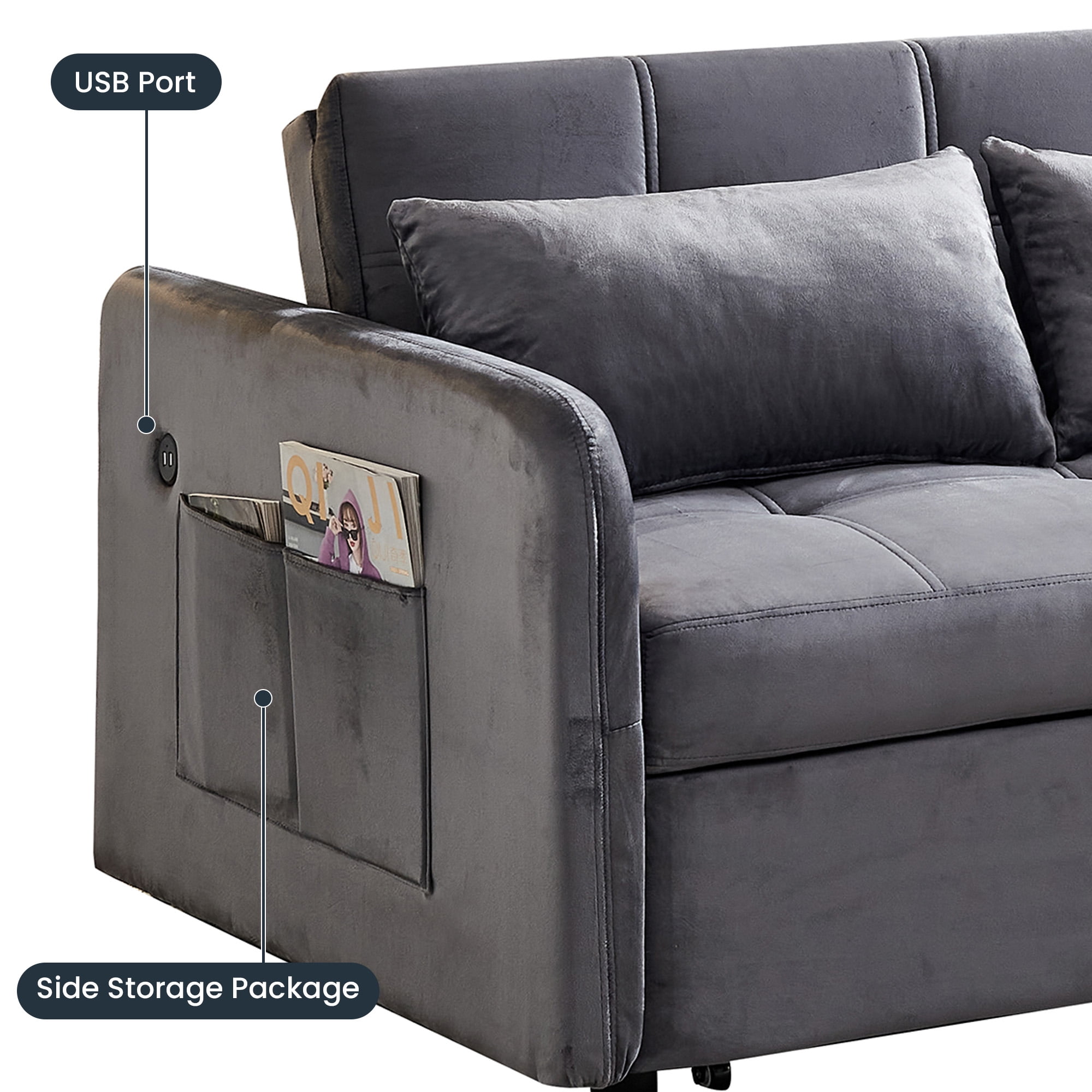 SOFA BED COUCH – It’s a multifunctional sofa bed, just put the backrest of the sofa down and pull out the front part,it can be turned into a bed. USB DESIGN – USB socket is added on the left arm(facing to the sofa) so that it’s very convenient to charge your mobile phone while you are sitting on the sofa to have a rest. COMFORTABLE SUPPORT – With high-quality foam and spring support, plus soft and smooth velvet, the sofa is comfortable, not too soft or too hard which is perfect to sit as well as to sleep on it. DIMENSION – Weight limit 500 pounds, sofa overall dimension 55.5″ W x 37.4″ D x 31.1″ H, sofa bed overall dimension 55.5″ W x 69″ D x 23.6″ H. To save your time and get suitable items, please kindly check the dimension whether they are expected. EASY ASSEMBLE – Detailed instructions and all labeled parts accessories are included, Just f ollow the instructions to assemble the parts, you only need to assemble the 4 legs and the detachable armrests on both sides. It will take 15-20 minutes. The end table wipe-clean surface, and easy to clean. PRODUCT INFORMATION: As a sofa dimension: 55.5″L x 37.4″W x 31.1″H. Unfold as a bed dimension:49”L×69”W×16.55”H. Overall Product Weight: 119.9LBS Features: Product Type: Pull Out Sofa bed Overall Dimension(As a sofa) Upholstery Material: Velvet Colors:Pink/Grey/Black/Khaki Seat Cushion Fill Material: Foam+Polyester Back Cushion Fill Material: Foam+Polyester Frame Material: Solid Wood+Plywood+Metal Wood species: Eucalyptus Leg Material: Plastic Leg Color: Black Seat Construction: Sinuous Springs Foam Density: 1.9lbs./cu.ft. Toss Pillows: Yes(two pillows) Removable Cushion Cover: No Reversible Cushions: No Storage: No Product Care: Wipe with fabric cleaner Assembly: Assembly Required: Yes Level of Assembly: Full Assembly Needed Installation Required: Yes Warranty: Commercial Warranty: Yes Product Warranty: Yes Warranty Length: One Year Full or Limited Warranty: Full PACKAGE INFORMATION: 1 x Sofa Bed 1 x User Manual:MP_MP-HLS0FV1004-K0_PUM_DL-071123