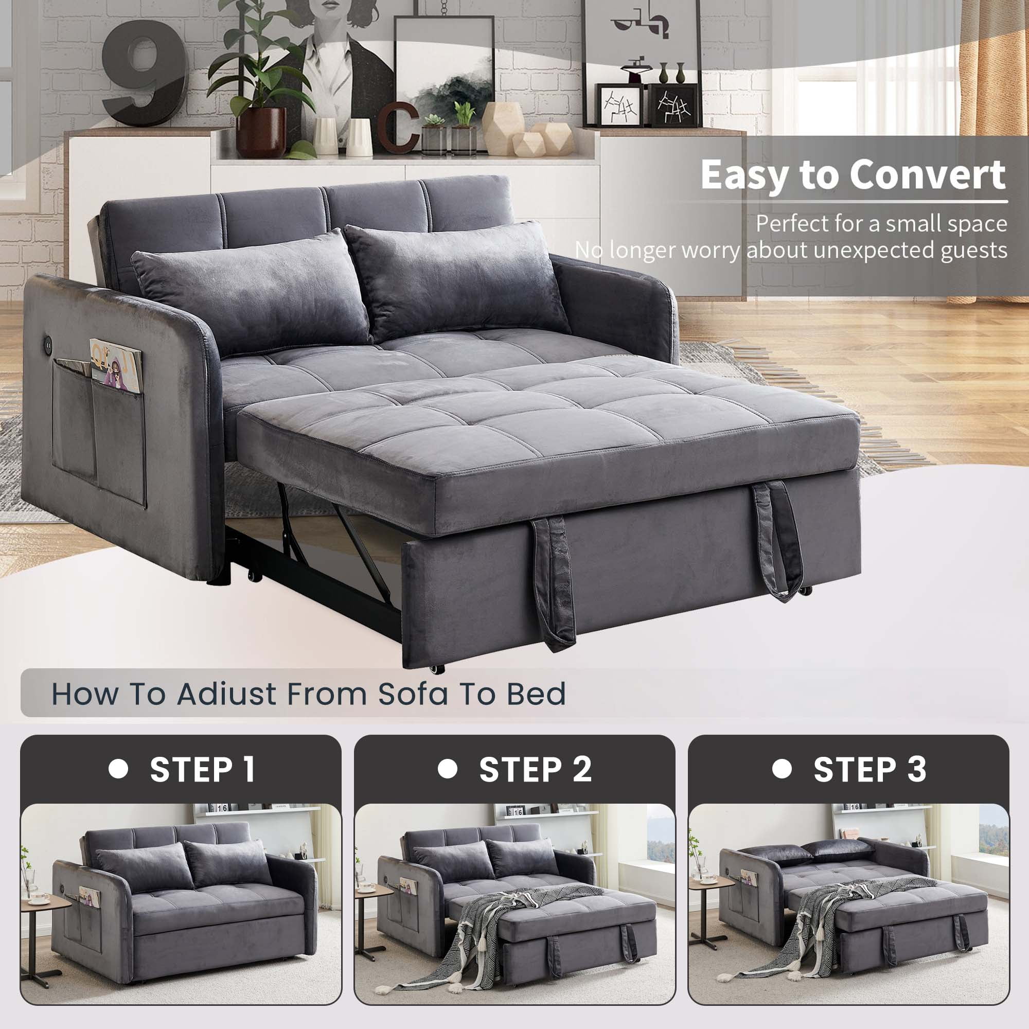 DEALTOPS 55.5″ Pull Out Loveseats Sleeper Sofa Bed with USB Ports and Side Pockets, Gray