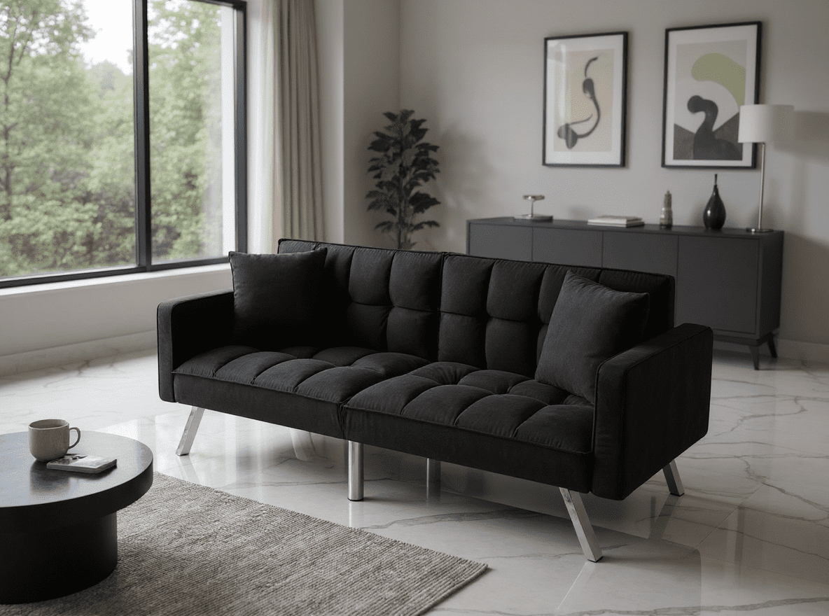 Crafted from premium velvet with a chic tufted design, this sofa bed brings both elegance and comfort. The high-density foam cushions ensure cozy seating, while the adjustable backrest offers three positions for ultimate relaxation. Easily transform it into a chaise lounge or sleeper with the pull-out bed, perfect for hosting overnight guests. Plus, the two large side pockets provide convenient storage for remotes, magazines, and more. This convertible sofa bed is the ideal blend of style, comfort, and functionality.