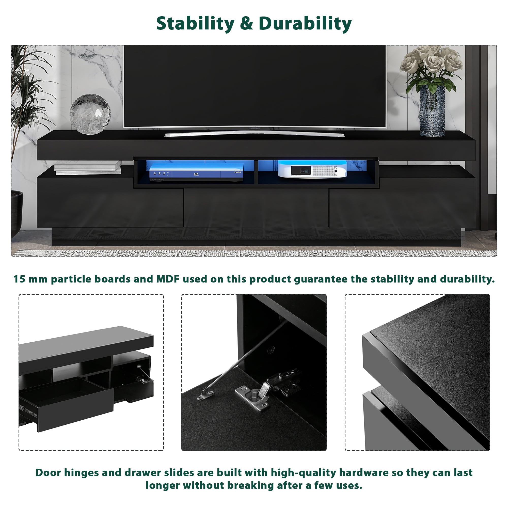 The DEALTOPS MSP-LVL2-017 Modern High Gloss TV Stand with 4 Open Shelves and 16-Color RGB LED Strip Lights for TVs up to 75” can bring you a better entertainment experience to you. Experience a TV stand that seamlessly blends uniqueness with style, featuring a design that captivates the eye. This TV stand offers a harmonious balance between open and concealed storage, providing a solution for maintaining a clutter-free living room. The built-in lighting system introduces a touch of innovation, boasting a 16-color LED lights array complete with remote color control and on or off switches to set the perfect ambiance. The high gloss waterproof surface adds not only a luxurious sheen but also ease of maintenance, making cleaning a breeze. Crafted from 15mm particle boards and MDF, this TV stand guarantees unwavering stability and durability for everyday use.
