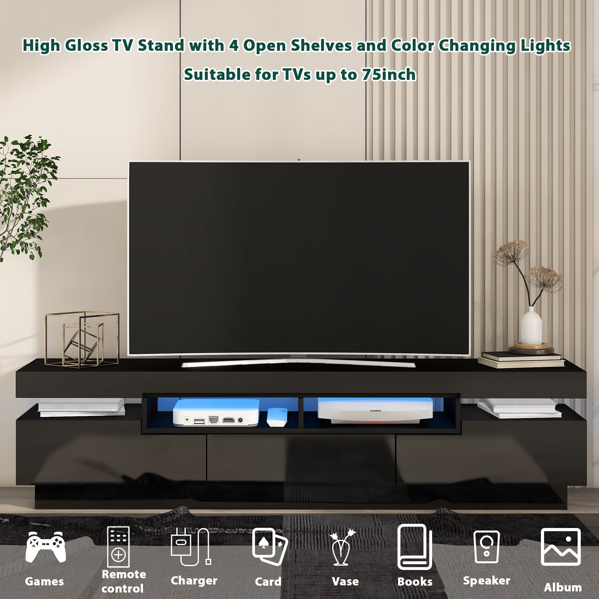 DEALTOPS Modern High Gloss TV Stand with 4 Open Shelves and 16-Color RGB LED Strip Lights for TVs up to 75” -Black