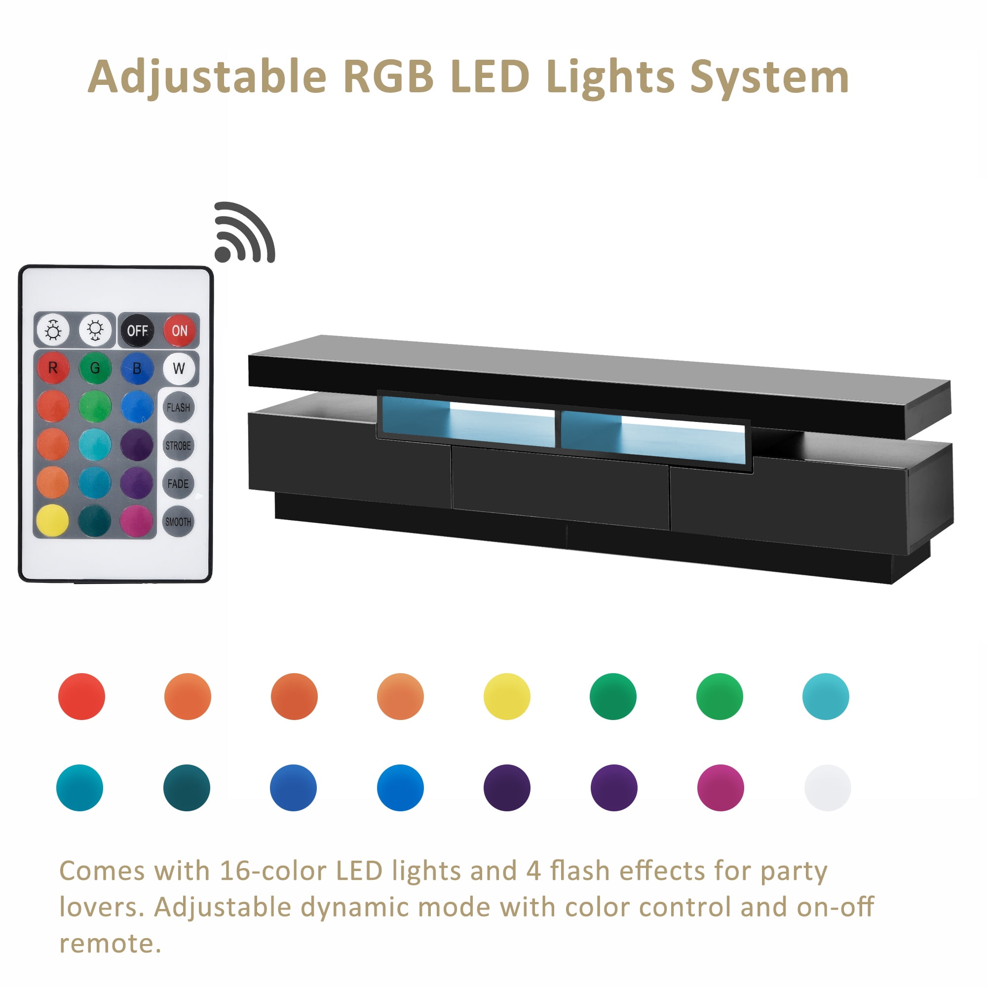 SOPHISTICATED AND SPACIOUS DESIGN – Characterized by clean lines, geometric doors, varied cabinet heights, and a robust tabletop, this TV stand stands out with its distinctive charm. The lustrous UV front material adds an understated yet opulent touch to your living room. Its slightly lower height enhances your viewing experience while lounging on the sofa, providing optimal comfort for movie nights. DYNAMIC LED LIGHTING – Elevating the viewing and entertainment experience, the TV stand incorporates a 16-color LED strip beneath the tabletop. This feature delivers a diverse range of lighting effects, with four modes including gradient, breathing light, fast blinking, and slow blinking. Equipped with a remote control, signal receiver, and electric pressure converter, these accessories of the TV stand enhance the visual allure and ambiance of your living space. VERSATILE FUNCTIONALITY – Boasting four open storage shelves for DVDs and game consoles, a user-friendly pull-out drawer, and four concealed storage cabinets, this TV stand offers convenience for stowing away small essentials such as remote controls, books, chargers, and more. These hidden compartments contribute to a clutter-free living room ambiance. PREMIUM CRAFTSMANSHIP – Crafted from durable MDF and particle board, this TV stand ensures both reliable TV support and an aesthetic that aligns with your preferences. The door hinges and drawer slides are fashioned with high-quality hardware, promising long-lasting performance and resistance to wear and tear. EFFORTLESS ASSEMBLY – Navigating the assembly process is a breeze thanks to straightforward step-by-step instructions. A comprehensive manual with clear illustrations and descriptive guidelines eliminates any complexities, making the TV stand’s assembly a hassle-free endeavor. PRODUCT INFORMATION: Overall: 16.5” H X 13.8” W X 67” D Overall Product Weight: 84.92 LBS Features: Product Type: TV Stands; TV Console Table Color: White/Black Frame Material: Wood Top Material: Particle Board Base Material: Particle Board Base Color: White Drawers Included: Yes Numbers of Drawers: 1 Cabinets Included: Yes Numbers of Cabinets: 2 Doors Included: Yes Numbers of Doors: 4 Shelves Included: Yes Numbers of Shelves: 3 Built-in Lighting: Yes Supplier Intended and Approved Use: Residential Use Weight Capacity: 330 LBS Assembly: Assembly Required: Yes Level of Assembly: Full Assembly Needed Installation Required: Yes Warranty: Commercial Warranty: Yes Product Warranty: Yes Warranty Length: One Year Full or Limited Warranty: Full