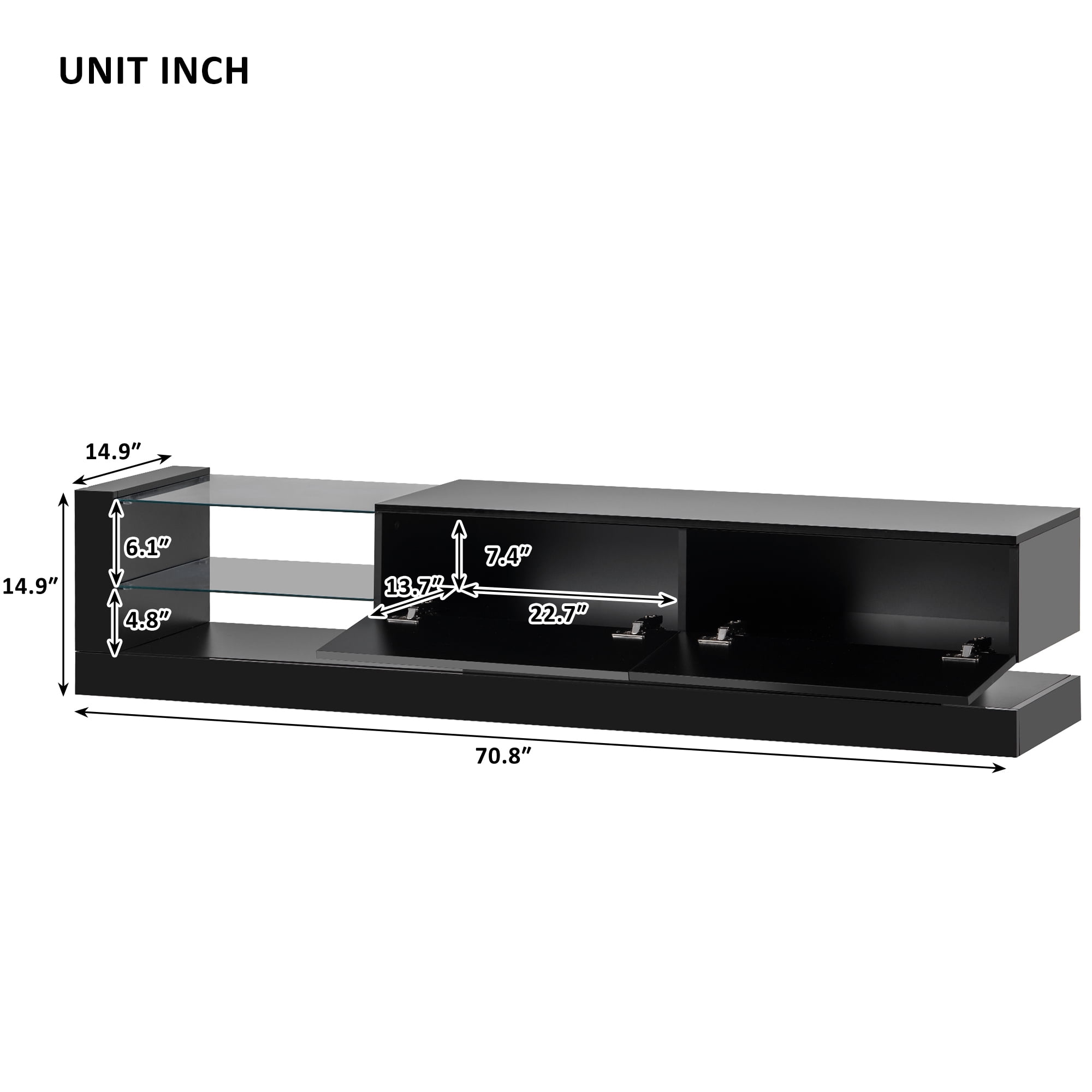 SLEEK MINIMALIST DESIGN – Infusing modern aesthetics with clean lines, this TV stand embodies simplicity. Its sleek profile is further enhanced by tempered glass accents, exuding an avant-garde and liberating ambiance. Experience a harmonious blend of style and functionality that elevates your living space. VIBRANT 16-COLOR LED LIGHTING – Elevate your entertainment experience with the integrated 16-color LED strip lights. Positioned beneath the front doors, these lights create captivating visual effects. With four distinct modes – gradient, breathing, fast blinking, and slow blinking – you can effortlessly set the mood. This feature comes complete with a remote control, signal receiver, and electric pressure converter, adding an extra layer of convenience to your setup. GENEROUS STORAGE CAPACITY – Unclutter your living area with ease using this TV stand’s well-designed storage features. Featuring dual drop-down door cabinets and two layers of glass shelves, it offers ample room for organizing DVD players, game consoles, TV accessories, and even decorative pieces. The space beneath the glass shelves presents a delightful nook for displaying smaller items. PREMIUM CRAFTSMANSHIP – Crafted from robust 15 mm MDF boards and 4 mm tempered glass, this TV stand meets the demands of daily use while ensuring enduring stability. The addition of UV highlight stickers on the TV stand’s sides, top, and front surfaces bring a smooth and radiant finish. Embrace a high-quality unit that seamlessly combines durability and refined aesthetics. EASY TO ASSEMBLE – The assembly process is completed with simple step-by-step instruction. Equipped with a detailed manual instruction, which has straight forward illustrations and descriptions, there’s no difficult for you to understand the assembly process of the TV stand. PRODUCT INFORMATION: Overall: 14.9” H X 14.9” W X 70.8” D Overall Product Weight: 72.16 LBS Features: Product Type: TV Stands; TV Console Table Color: Black/White Frame Material: Wood Top Material: MDF Base Material: MDF Base Color: White Built-in Lighting: Yes Drawers Included: No Cabinets Included: Yes Numbers of Cabinets: 2 Doors Included: Yes Numbers of Doors: 2 Shelves Included: Yes Numbers of Shelves: 2 Legs Included: No Drawers Slide Material: Metal Supplier Intended and Approved Use: Residential Use Weight Capacity: 319 LBS Assembly: Assembly Required: Yes Level of Assembly: Full Assembly Needed Installation Required: Yes Warranty: Commercial Warranty: Yes Product Warranty: Yes Warranty Length: One Year Full or Limited Warranty: Full