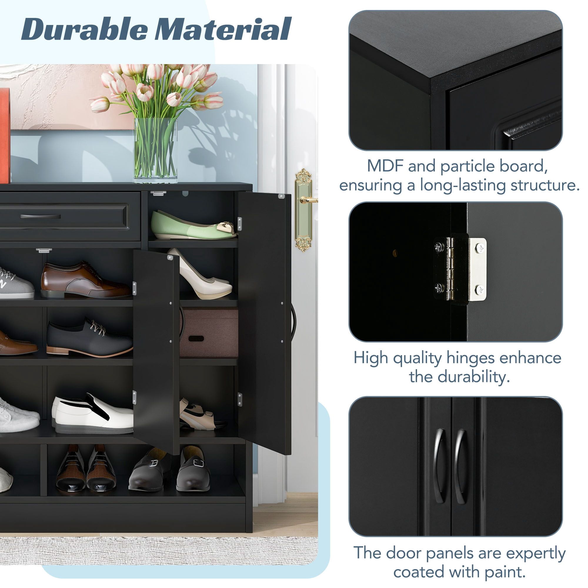CONTEMPORARY ELEGANCE – Boasting a timeless silhouette coupled with a flawlessly smooth monochromatic finish, this shoe cabinet seamlessly harmonizes with any interior decor. The door panels are exquisitely adorned with tasteful groove lines, infusing an element of refined sophistication. OPTIMAL SPACE UTILIZATION – Unveiling an array of storage cabinets in varying dimensions with adjustable shelves in, this shoe cabinet offers a personalized organizational experience. You can adjust the shelving effortlessly to accommodate footwear of diverse sizes or to accommodate a myriad of items. GENEROUS STORAGE CAPACITY – With multiple capacious compartments and intelligently designed open sections, this shoe cabinet adeptly houses approximately 20 shoes of assorted sizes and styles. The drawer proves to be an invaluable repository for shoelaces and keys alike, further enhancing its organizational prowess. ROBUST CONSTRUCTION – Meticulously crafted from enduring MDF and particle board, this shoe cabinet boasts a durable framework. Reinforce the backboard with supplementary fasteners for enhanced stability. The door panels showcase a paint finish, rendering the shoe cabinet effortlessly sleek while facilitating easy maintenance. EFFORTLESS ASSEMBLY – Installing the shoe cabinet is a hassle-free experience, thanks to the detailed and user-friendly step-by-step installation instructions included, this ensures a smooth and enjoyable assembly process. PRODUCT INFORMATION: Overall: 39.4” H X 11.8” W X 47.2” D Overall Product Weight: 94.8 LBS Features: Product Type: Shoe Cabinets; Shoe Rack Color: Black/White Frame Material: Wood Top Material: Particle Board Base Material: Particle Board Drawers Included: Yes Number of Drawers: 1 Cabinets Included: Yes Numbers of Cabinets: 3 Shelves Included: Yes Numbers of Shelves: 8 Adjustable Shelves: Yes Drawer Slide Material: Metal Supplier Intended and Approved Use: Residential Use Shoes Capacity: 20 Pairs Weight Capacity: 150 LBS Assembly: Assembly Required: Yes Level of Assembly: Full Assembly Needed Installation Required: Yes Warranty: Commercial Warranty: Yes Product Warranty: Yes Warranty Length: One Year Full or Limited Warranty: Full