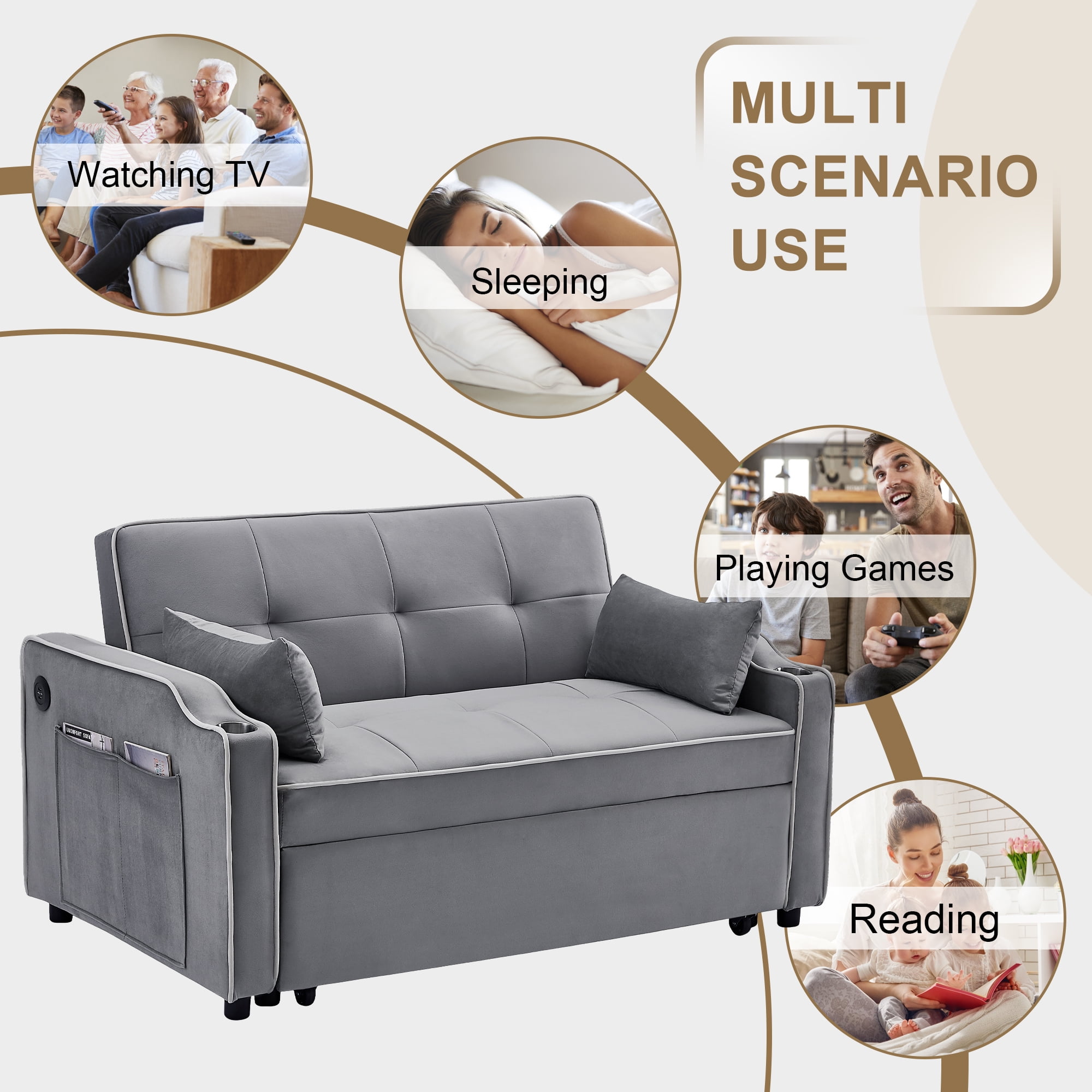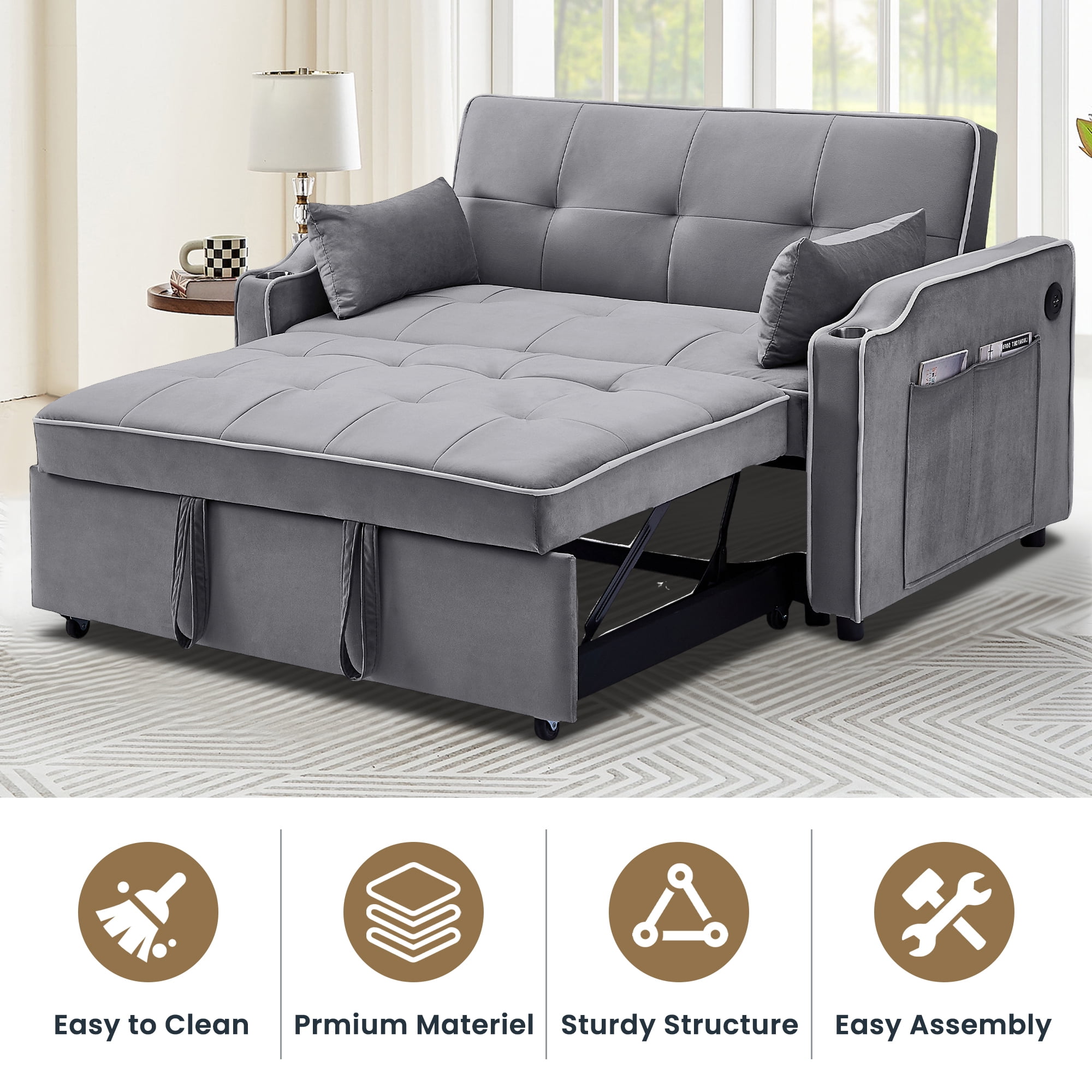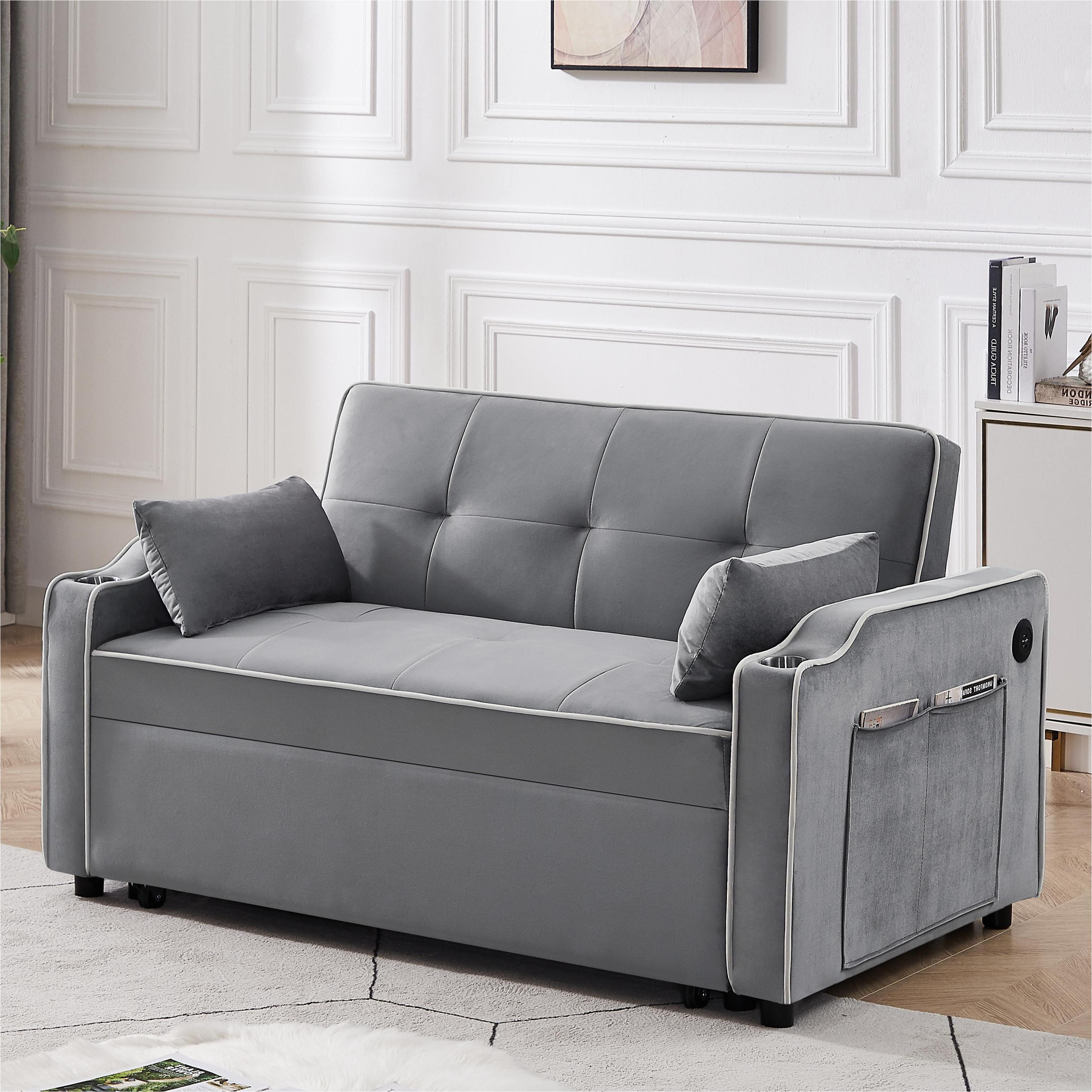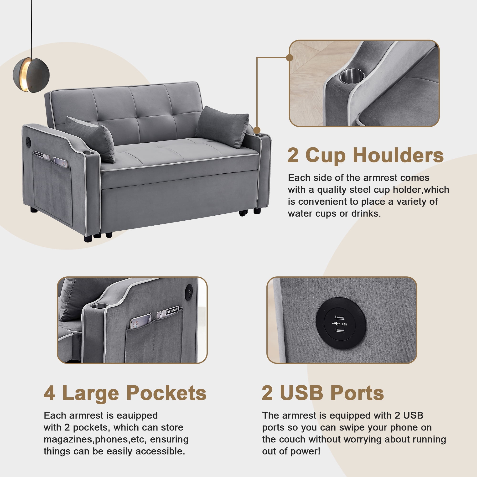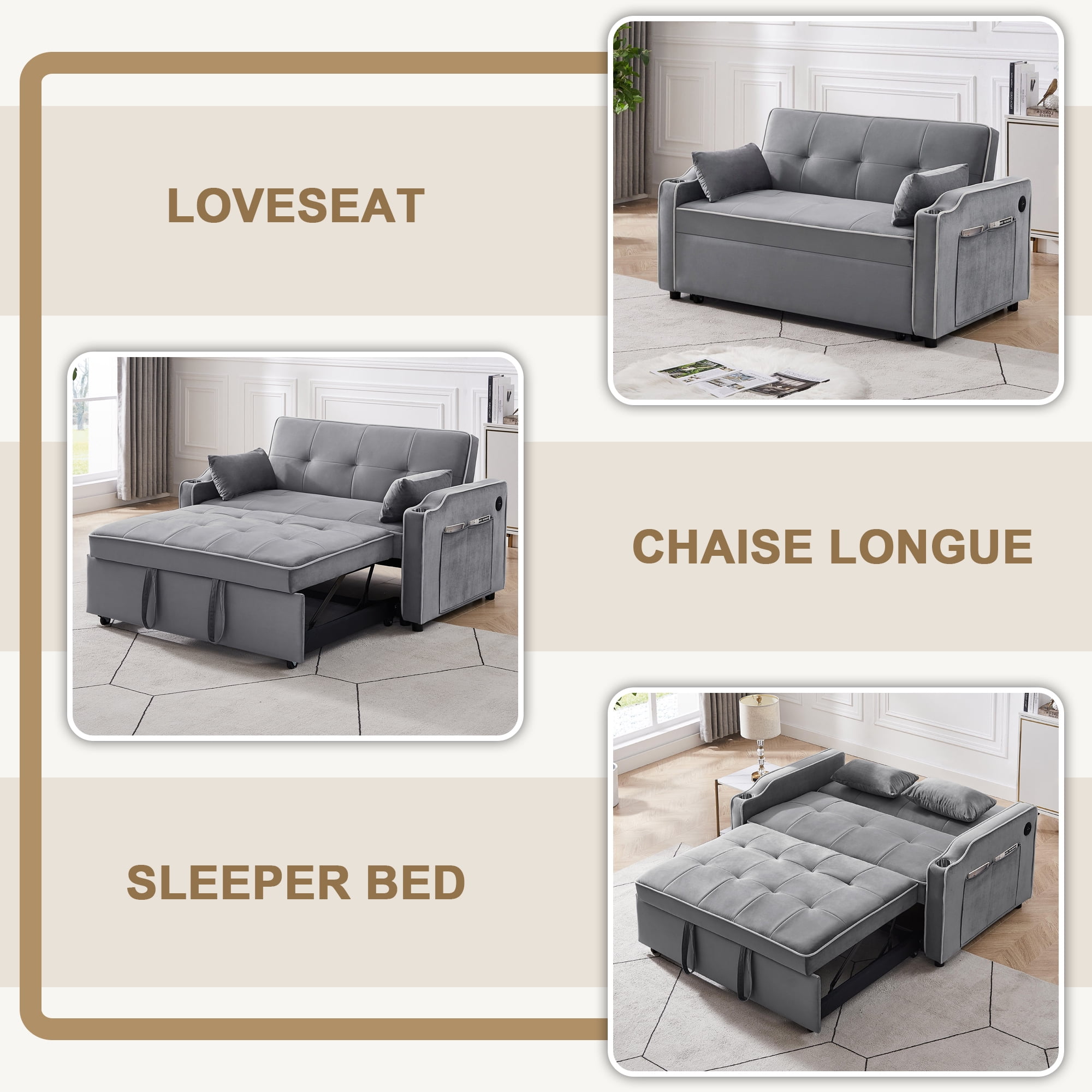 Features: USB PORTS AND CUP HOLDERS – The armrest is thoughtfully outfitted with 2 USB ports, 2 cup holders, and roomy side pockets, creating a hub for your essentials. Now you can charge your devices or enjoy a drink without fretting about battery life. No more back-and-forth trips – perfect for unwinding with a book, sipping a beverage, or a quick nap after a busy day. 3 RECLINING ANGLE BACKREST – Enjoy the flexibility of adjusting the backrest to 3 distinct angles: 105°, 135°, and 180°. The built-in mechanical design ensures effortless adjustments. By partially pulling out the sleeper couch, you’ll transform it into a spacious reclining sofa, allowing your legs to unwind comfortably. This upgraded design lets you fully enjoy activities like watching TV, reading, or gaming, whether seated, reclined, or somewhere in between. 3-IN-1 PULL-OUT SOFA BED – Elevate your space with this velvet loveseat that effortlessly converts into a pull-out sleeper couch or a spacious chaise lounge in mere seconds. A swift tug of 2 straps is all you need for this seamless transformation. Ideal for those surprise visits from guests, making it a stellar choice for guest rooms, home offices, or living rooms, particularly in compact apartments. PREMIUM COMFORT – The surface of the futon sofa bed boasts plush velvet fabric that’s both inviting to touch and resistant to wrinkles and fading. The seat cushion is generously filled with high-density sponge, delivering not just comfort but also impressive resilience that keeps it from sagging even after prolonged use. Topped with 2 soft pillows, this setup not only provides enhanced support but also exudes an added touch of elegance. STURDY BUILD & EFFORTLESS ASSEMBLY – From the tufted cushion design to the sleek lines, this sofa cama para sala radiates a modern charm. Crafted from solid wood and robust rubber wood legs, its load capacity reaches up to 500 LBS, comfortably accommodating 2 adults. With its quality steel structure, the couch stands steadfast without a worry about tipping over. And rest assured, setting up our living room sofas is a breeze. PRODUCT INFORMATION: Products Size: 55.2″X32.48″X32.3″ Sleeper Bed: 70”X44.1” x18.5” Assembled Length (in.): 55.2″ Assembled Width (in.): 32.48″ Assembled Height (in.): 32.3″ Weight (lbs.): 116.6 Features: Product Type: 3 in 1 Convertible Sleeper Sofa Pull Out Couch Bed Main Color: Grey; Black Main Material: Velvet Filler: Foam Use Case: Primary Living Space Wood Type: Eucalyptus Upholstery Material: Velvet Frame Material: Wood Arm Style: Square Arms Seats: 2 Seat Motion functionality: Manual-Push Back Seat Plushness: Soft Frame Material: Solid Wood + Plywood + Metal Weight Capacity: 500LBS Clean: Just wipe off the dirt on it. Assembly: Assembly Required: Yes Level of Assembly: Full Assembly Needed Installation Required: Yes Warranty: Commercial Warranty: Yes Product Warranty: Yes Warranty Length: One Year Full or Limited Warranty: Limited Package Information: 1 x Futon Sofa Bed 1 x bag tools 1 x User Manual