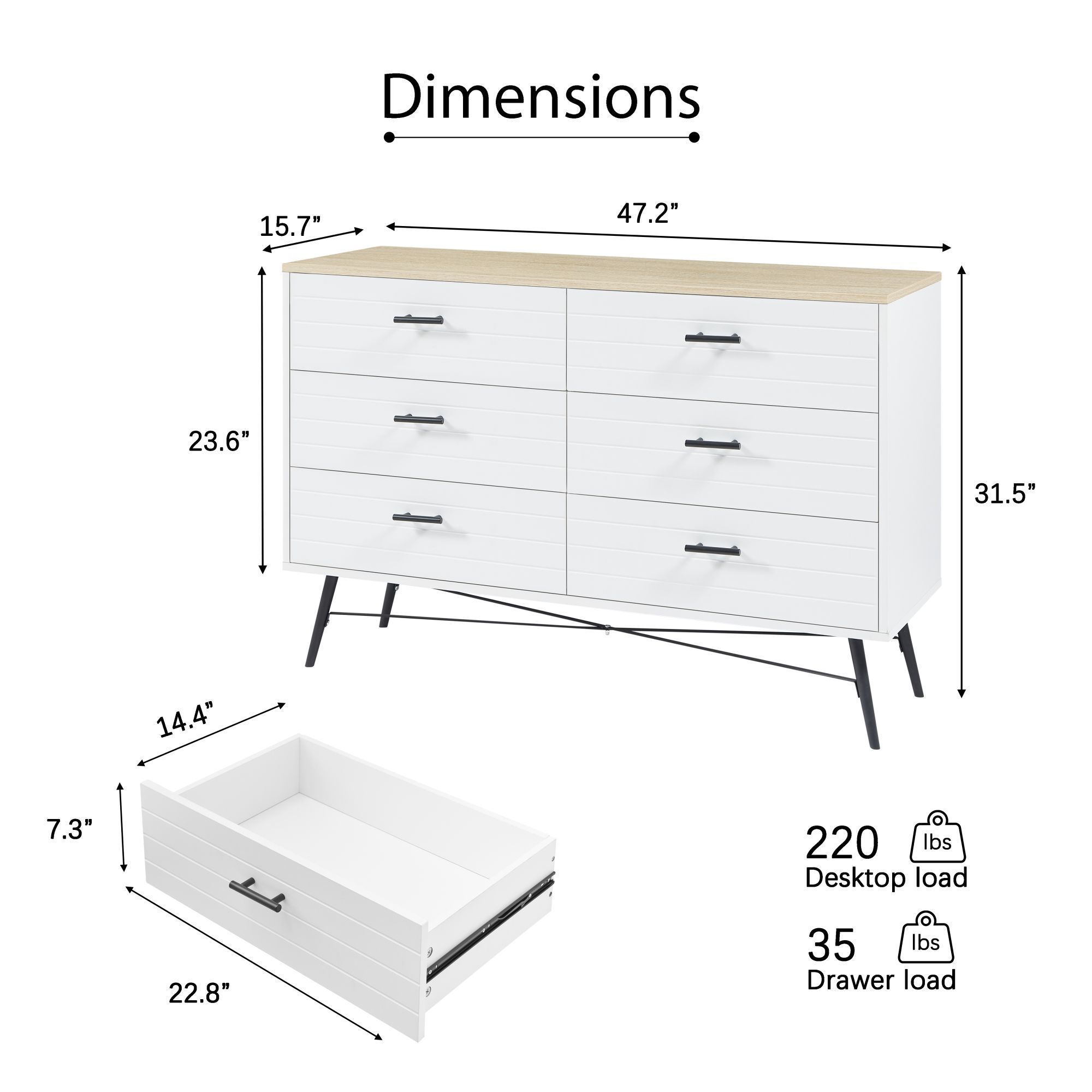FEATURES: Generous Storage Capacity – Featuring six deep drawers, each 14.4 inches in depth, this dresser provides ample space for organizing your belongings. The spacious top surface is ideal for displaying a TV, photo frames, or other decorative items. Versatile Design – The modern and minimalist design of this drawer makes it adaptable to various settings. Use it as a vanity in the bedroom, a closet for clothes, a storage cabinet in the living room, or even as a TV stand. Enhanced Stability – Equipped with X-shaped stabilizing feet, the steel frame offers robust support and ensures the dresser remains stable and secure. Anti-tipping accessories add an extra layer of safety, preventing accidental tipping. Durable Construction – Crafted from high-quality particleboard and sturdy metal feet, this dresser promises lasting durability and stability. It resists water and scratches, ensuring a long lifespan. User-Friendly Assembly – The dresser comes with detailed instructions and all the necessary tools for easy assembly. Each piece is clearly labeled, making the assembly process straightforward and hassle-free. Product Information: Overall Dimension: 47.24”L X 15.75”W X 31.5”H Drawer Size: 22.8″ L x 14.4″ W x 7.3″ H Overall Product Weight: 95.68 LBS Specifications: Product Type: Dressers; Storage Cabinets Color: White/Rustic Walnut Dresser Style: Modern; Stylish Frame Material: Solid Wood Material Details: Particle Board; Metal Number of Drawers: 6 Same Drawer Size: Yes Feet Included: Yes Number of Feet: 4 Feet Material: Steel Anti-tipping Design: Yes Supplier Intended Use: Residential Use Weight Capacity of Desktop: 220 LBS Weight Capacity of Drawer: 35 LBS Assembly: Assembly Required: Yes Level of Assembly: Full Assembly Needed Suggested people of assembly: 2 Time of Assembly: 0.5 hour Warranty: Commercial Warranty: Yes Product Warranty: Yes Warranty Length: One Year Full or Limited Warranty: Full Package Information: 1 x Dresser 1 x Assembly Kit