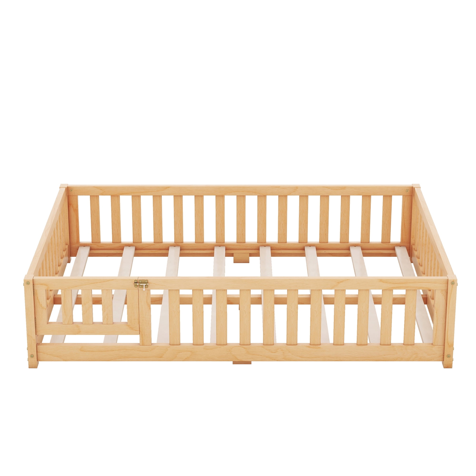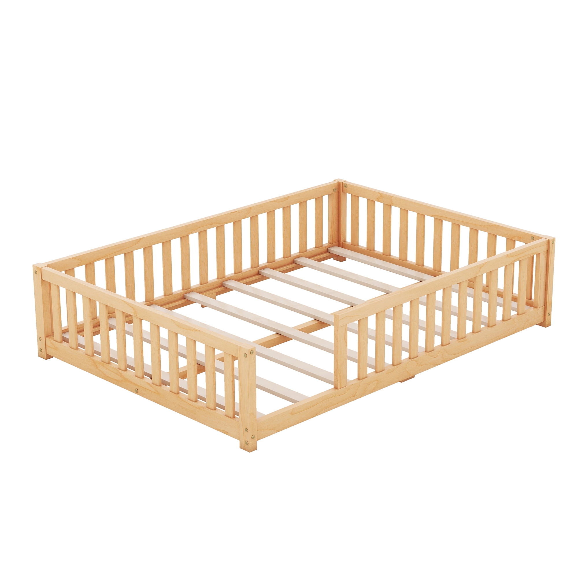 SUPERIOR QUALITY CRAFTED -This twin size floor bed is crafted from high-quality LVL rubber wood and can last for a long time use. The slats are made from Plywood. With 8 slats ensuring strong stability and durability. SAFE SLEEPING ENVIRONMENT – The Montessori floor bed low profile design keeps the sleeping space safer. It is a perfect place for both sleep and play. Your child can easily get in and out while playing. The floor design allows your kids to go in and out of bed alone to develop their independence. No need to worry about children sleeping alone. FLOOR BED WITH FENCE DESIGN – This floor bed featuring a fence not only ensures better stability but also reduces safety concerns. The low height of the floor bed reduces the risk of falling, making it a safer option for young children who may toss and turn during the night. SWITCHED DESIGN FOR THE DOOR – There is a small door attached that can be opened and closed, which increases the interest of the queen floor bed and creates a safe sleeping space. The door can be taken off if no need to meet different requirements. EASY MAINTENANCE AND EASY ASSEMBLY – Floor beds are easy to clean and maintain since they are at ground level, making it simpler to change sheets and keep the sleeping area tidy. The structure is simple, follow the installation steps in the manual, and you can easily install the kid’s bed in 20 minutes or less, and let your child experience the fun of private space as early as possible. PRODUCT INFORMATION Overall: 77.6″L x 40.8″W x 17.5″H Overall Product Weight: 49.72 lbs Package ①Dimension: 78.15″L x 18.5″W x 5.31″H. 56.76 lbs Features Product Type: Twin Size Floor Bed Color: Natural Main Material: LVL Rubber Wood Frame Material: Wood Bed Size: Twin Box Spring Required: No Mattress Included: No Estimated Time to Assemble: 30 Minutes Avoid power tools: Yes Center Support Legs:No Bed Weight Capacity: 250 lbs Imported: Yes Country of Origin: Vietnam Supplier Intended and Approved Use: Residential Use Assembly Assembly Required: Yes Level of Assembly: Full Assembly Needed Suggested Number of People for Assembly/Install: 1 Additional Tools Required (Not Included): All Tools Included Warranty Product Warranty: Yes Full or Limited Warranty: Limited Warranty Length: One Year(Manufacture Defect))