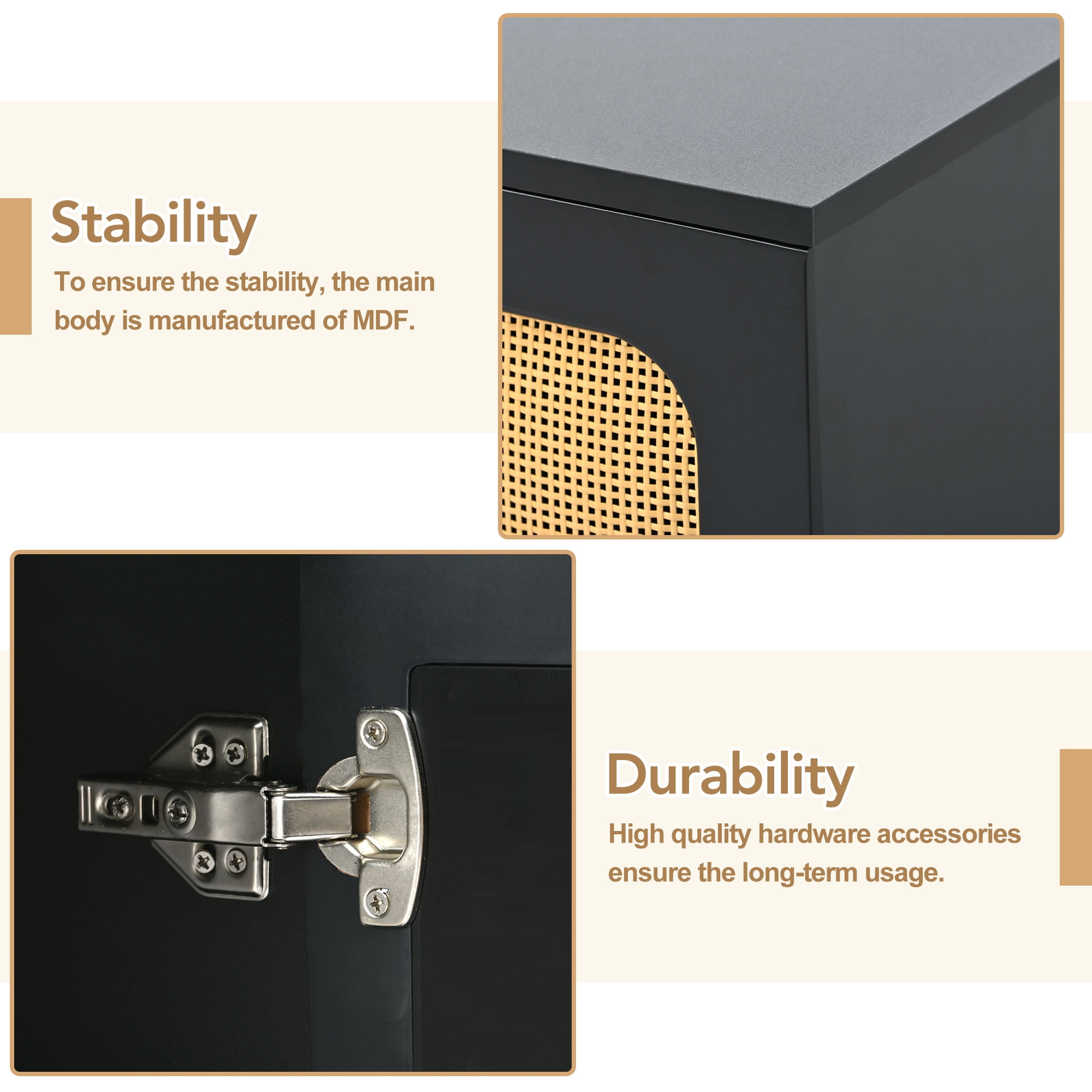 ELEGANT APPEARANCE – The TV stand rattan wooden doors and metal base are a combination of rustic and modern style, bringing visual enjoyment to your home and able to match with various home styles. Stylish wooden round handles on each cabinet door not only provide convenience for sliding and pulling the doors, but also add excellent aesthetics. MULTIFUNCTIONAL DESIGN – Thanks to its ample storage space, this TV stand is suitable for a variety of home spaces. Not only can it be used as a TV stand for TVs up to 70 inches, but it can also be used as a beautiful and functional storage cabinet in a hallway or living room. EXTRA LARGE STORAGE SPACE – This TV stand has two small cabinets and a large center cabinet with one height-adjustable shelves in each cabinet to store a variety of items of different sizes. The countertop of the TV stand can also hold decorative objects such as vases, in addition to placing points of actuality. This TV cabinet provides ample space for your TV, game consoles, media boxes, remotes, and more. It can also store other miscellaneous items in your living room. STABILITY AND DURABILITY – To ensure stability, the TV stand body is constructed from MDF. The unique metal base is stable and durable to support the weight of the cabinet securely. High-quality hardware ensures long-term use. EASY TO ASSEMBLE AND CLEAN – This TV stand comes with a manual instruction wrote detailed illustrations and descriptions. Each screw and pin has its own code to let you easily understand the assembly progress. In addition, its smooth surface is waterproof and easy to keep clean with a damp cloth. PRODUCT INFORMATION: Overall: 64.9”W x 16.9”D x 28.3”H Overall Product Weight: 79.3 LBS Maximum TV Screen Size Accommodated: 70 inches Load-bearing: 176.37 LBS Features: Product Type: TV Stand Color: White/Black Frame Material: MDF Furniture Design: Open shelving; Cabinet/Enclosed storage Drawers Included: No Legs: Yes Shelving Included: Yes Number of Shelves: 3 Adjustable Shelves: Yes Doors: Yes Number of Doors: 4 Base Material and Color: Metal; Golden Supplier Intended and Approved Use: Residential Use Exported: Yes Shelf Weight Capacity: 44 lbs for table top; 33 lbs for side shelf; 22 lbs for middle shelf Assembly: Assembly Required: Yes Level of Assembly: Full Assembly Needed Installation Required: Yes Warranty: Commercial Warranty: Yes Product Warranty: Yes Warranty Length: One Year Full or Limited Warranty: Full