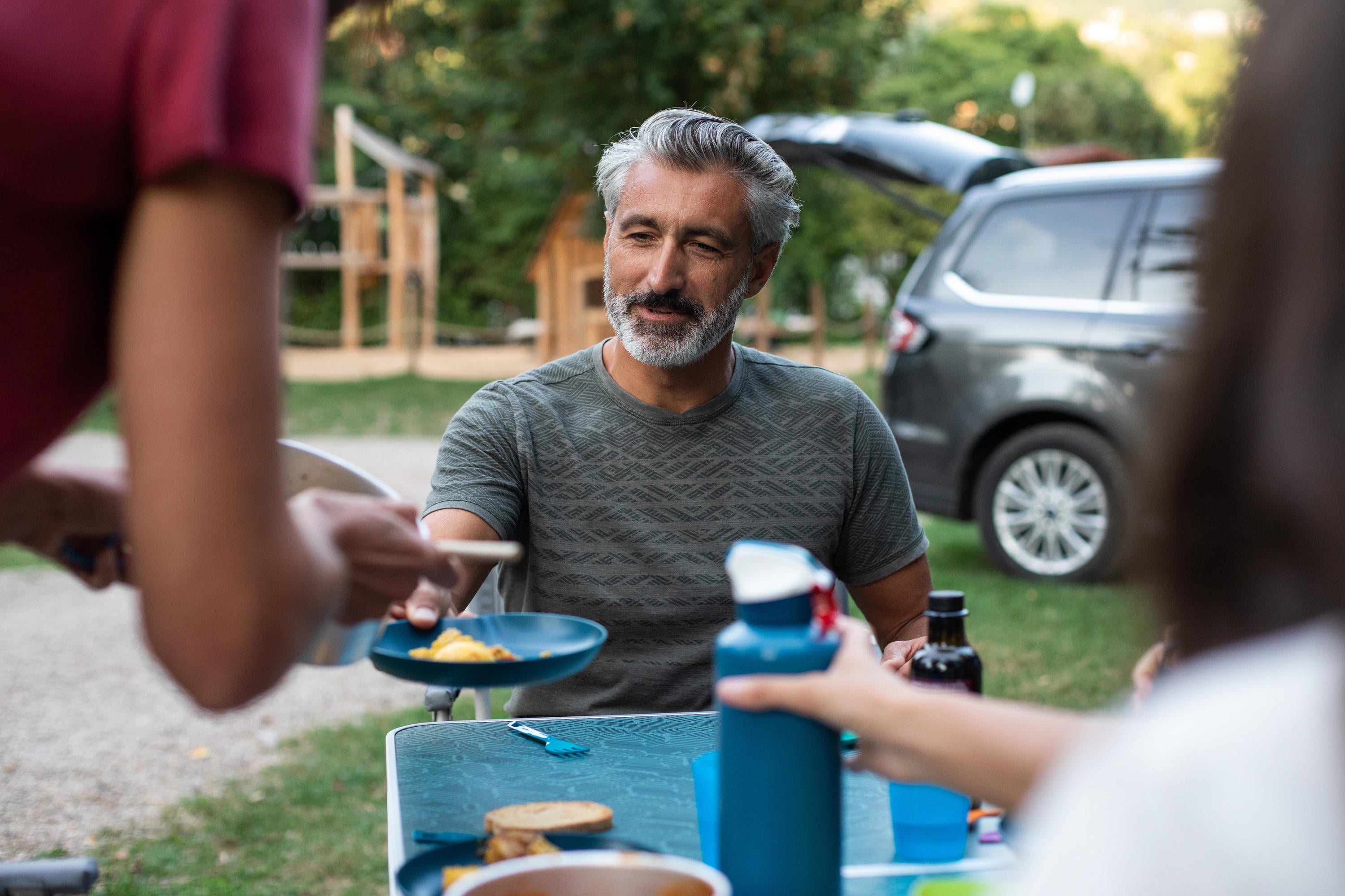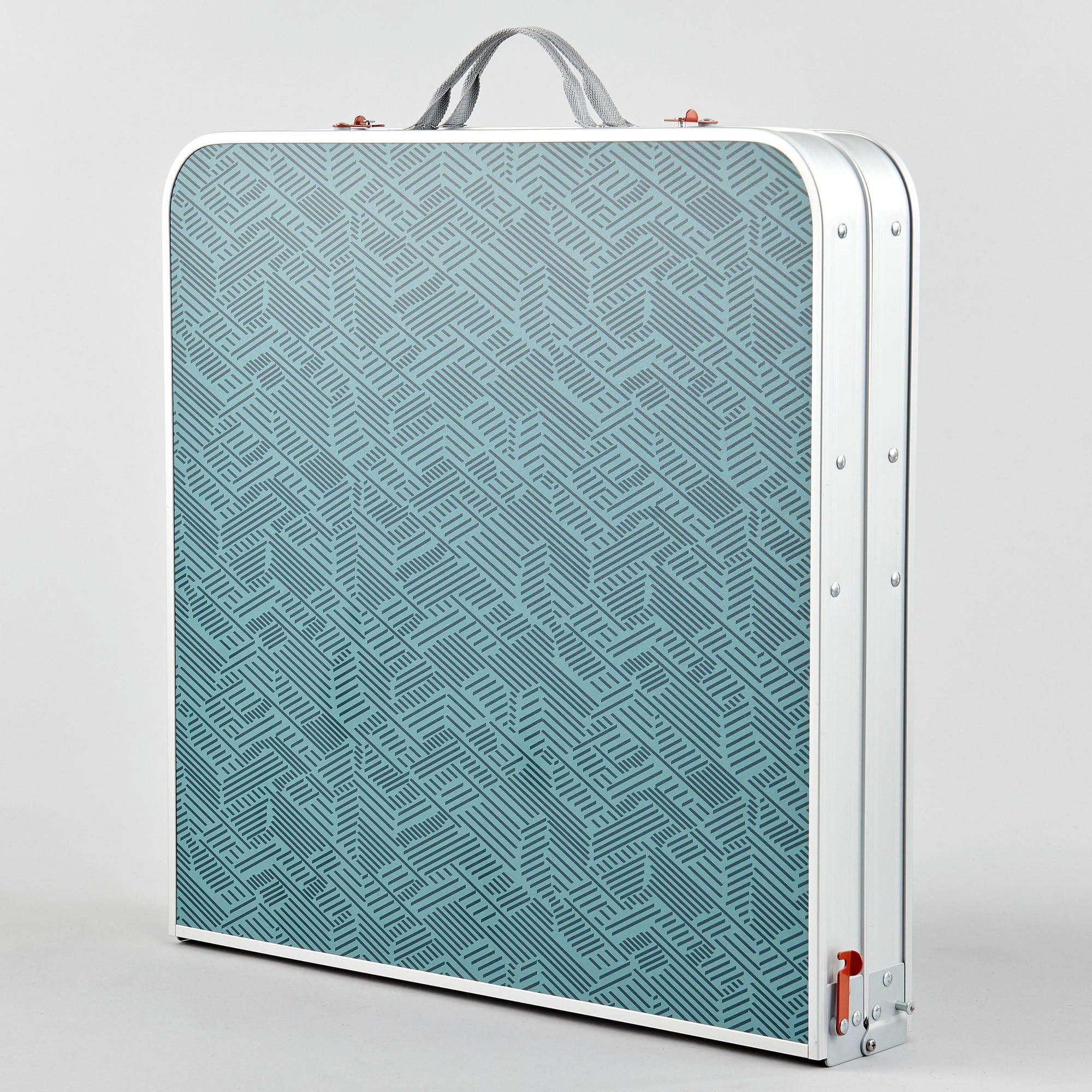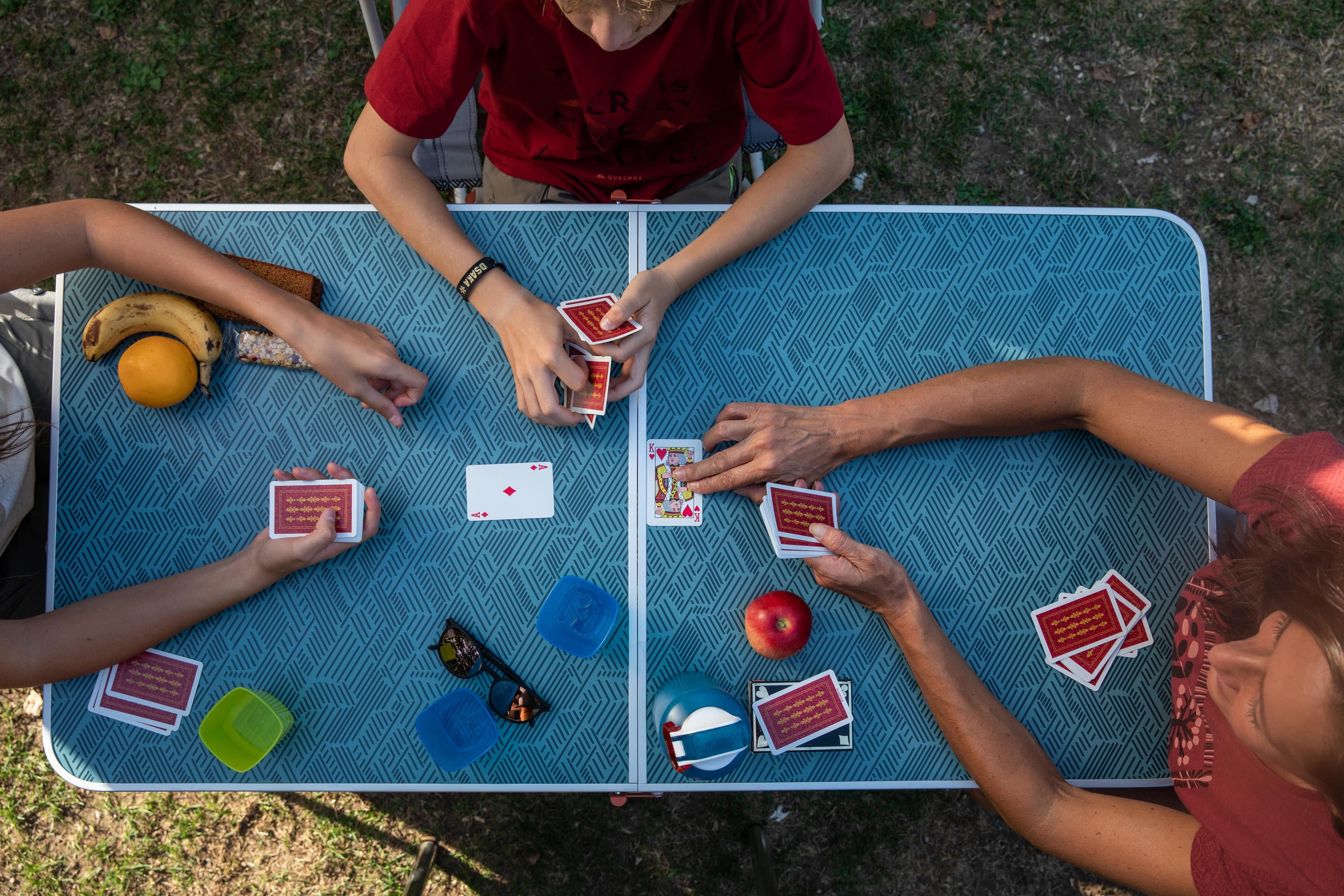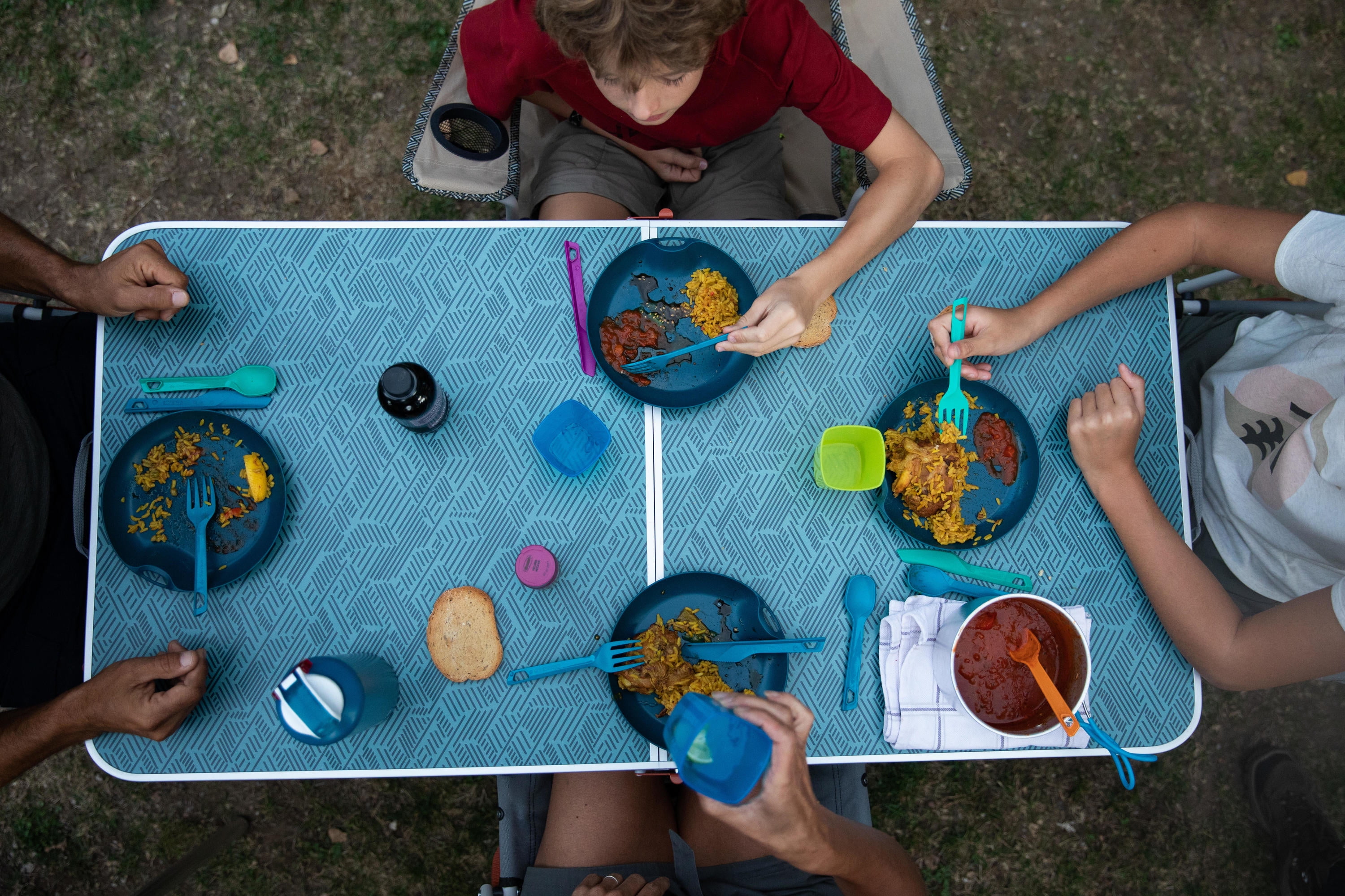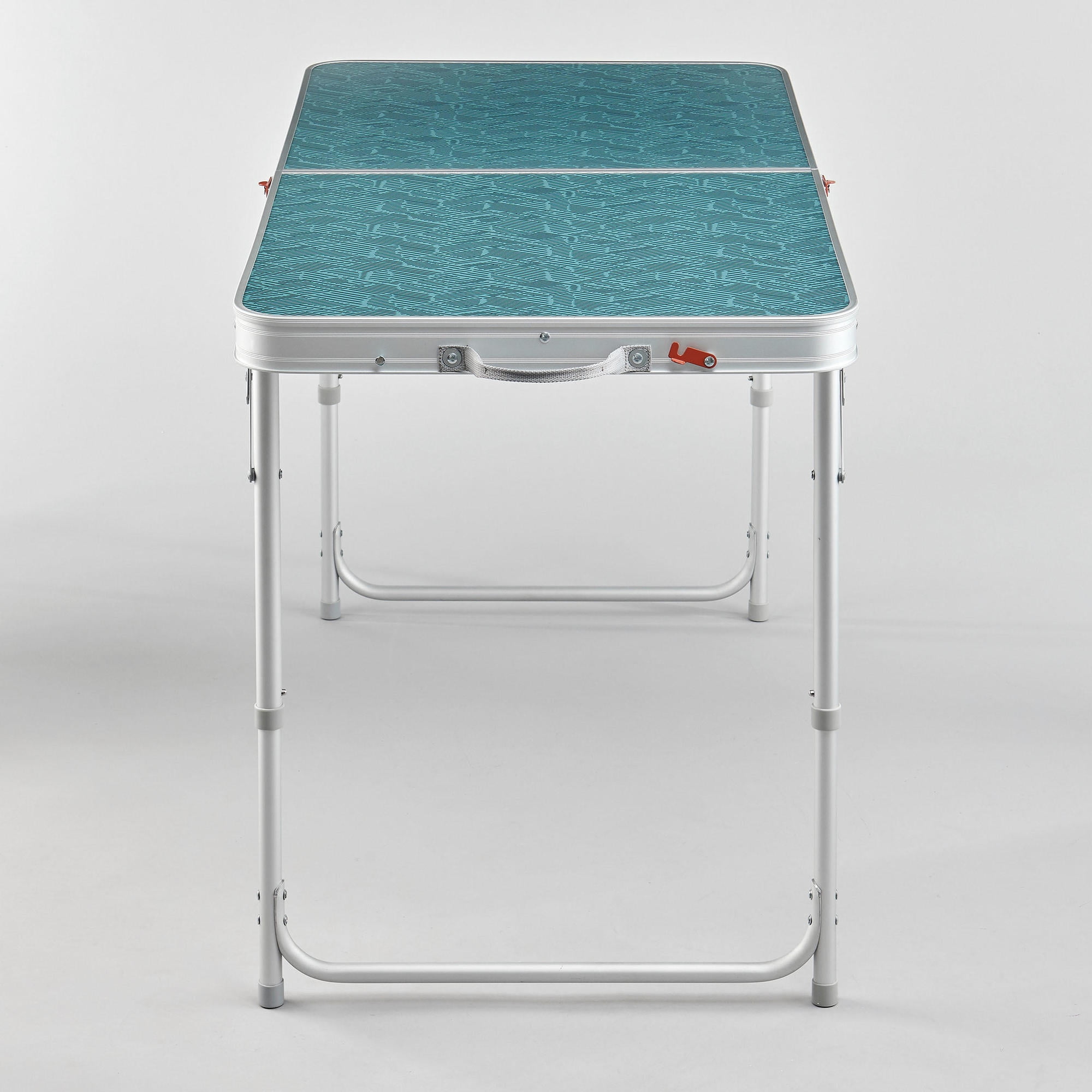 Decathlon Quechua, Camping Table, 4 chairs, Blue User comfort Height: 27.6″. Total surface: 47.2″ x 23.6″. Useful for up to 6 people. Compact design Compact when folded. Volume: 38 L. Dimensions: 23.6″ x 23.6″ x 4.1″. Easy to transport: 2 carry handles. Space under the table top for seats. Weight: 19.2 lbs. Durability Laminated table top with aluminum frame and reinforcements. Steel legs.