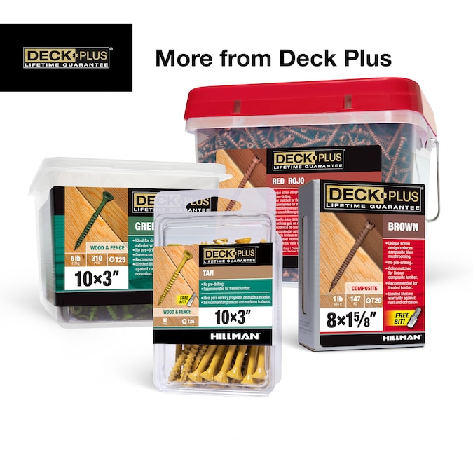 Deck Plus Wood and Fence Screws were designed to provide superior weather protection that matches the finish of your deck. Countersinking nibs under the head of the screw cut a perfect finished hole by transporting wood fibers out and sealing the surface. The epoxy coating provides superior rust and corrosion resistance with 4 layers of protection – a zinc layer, a chemical adhesion layer, an epoxy coating, and a durable protective finish.