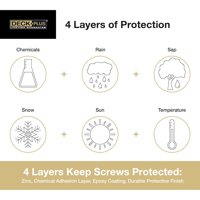 Deck Plus Wood and Fence Screws were designed to provide superior weather protection that matches the finish of your deck. Countersinking nibs under the head of the screw cut a perfect finished hole by transporting wood fibers out and sealing the surface. The epoxy coating provides superior rust and corrosion resistance with 4 layers of protection – a zinc layer, a chemical adhesion layer, an epoxy coating, and a durable protective finish.