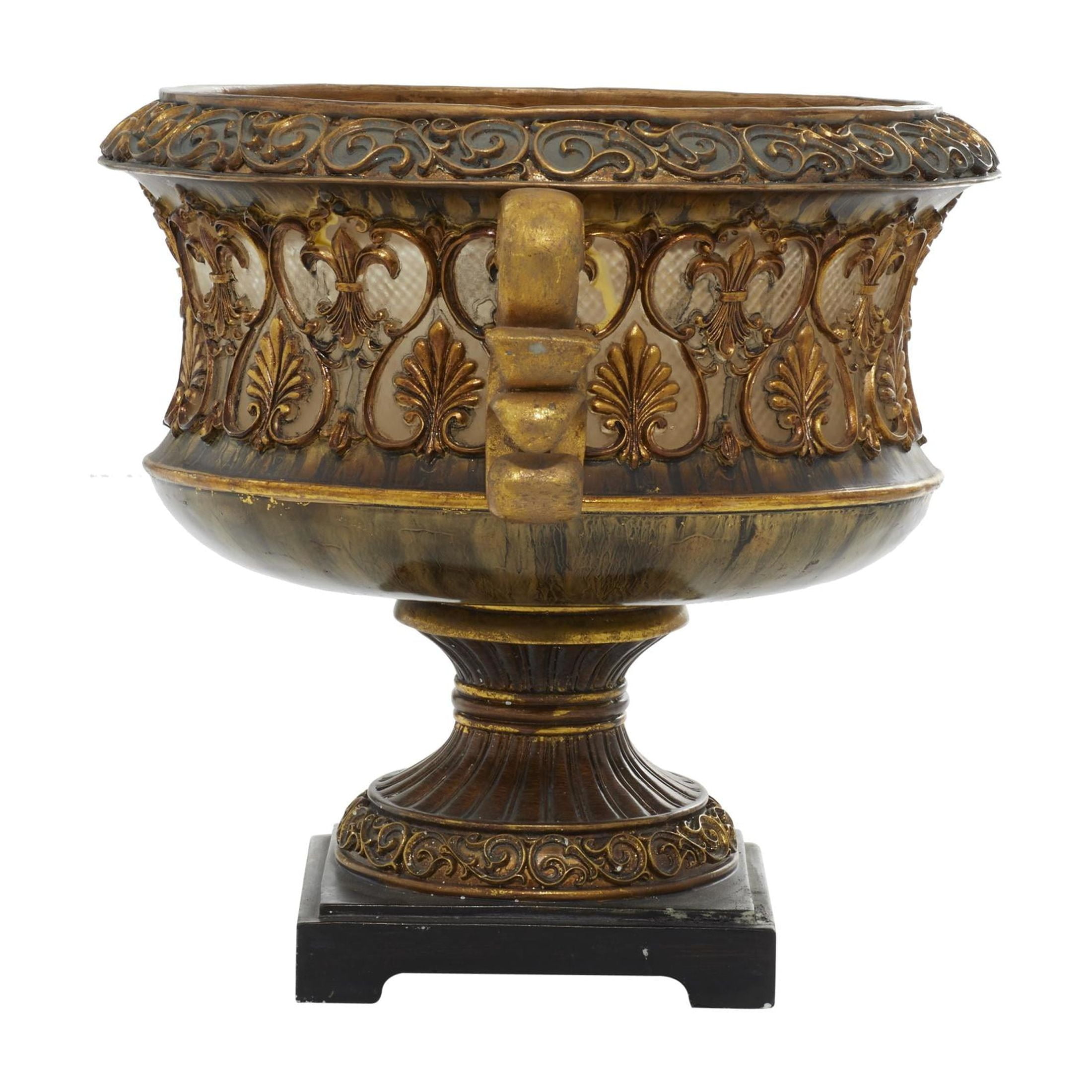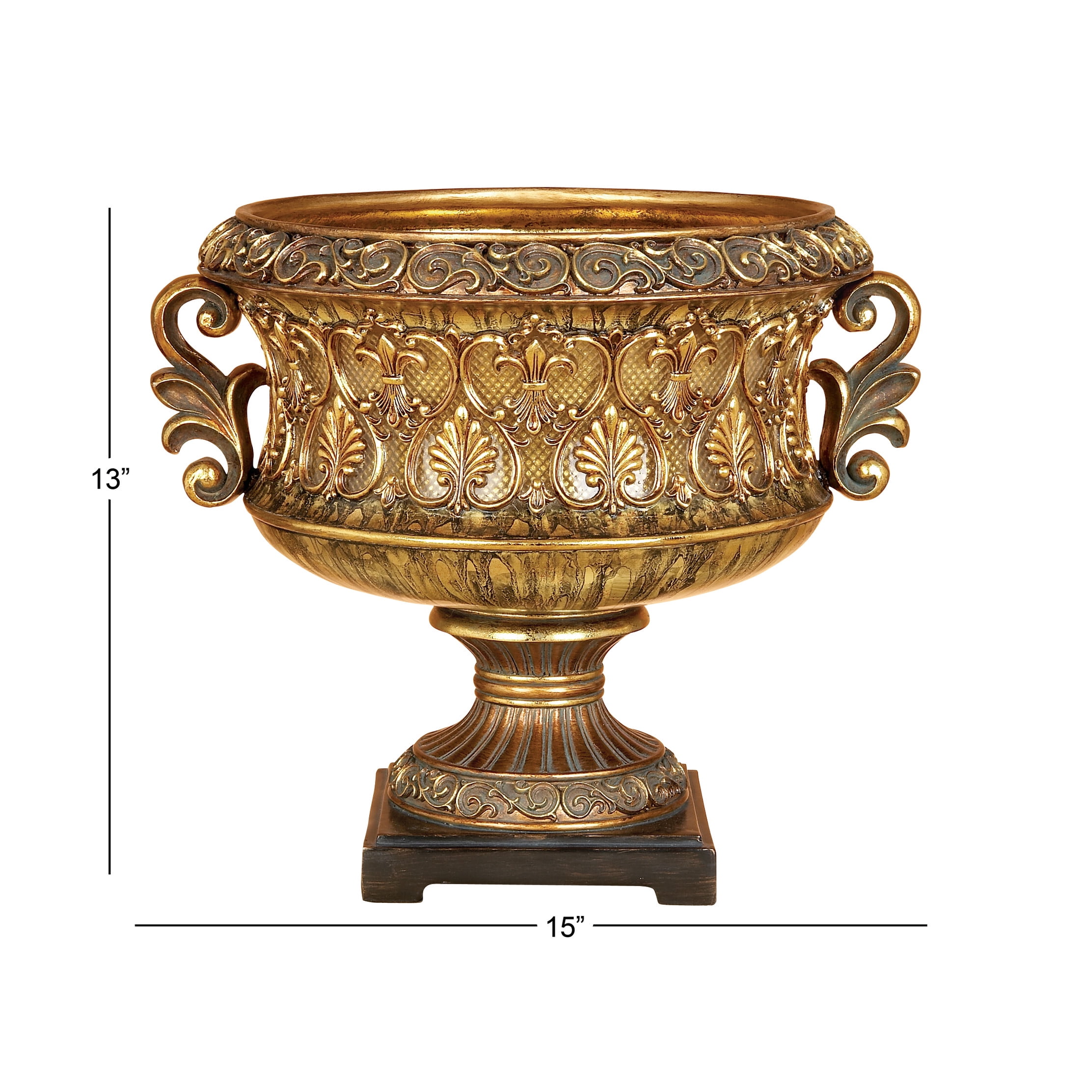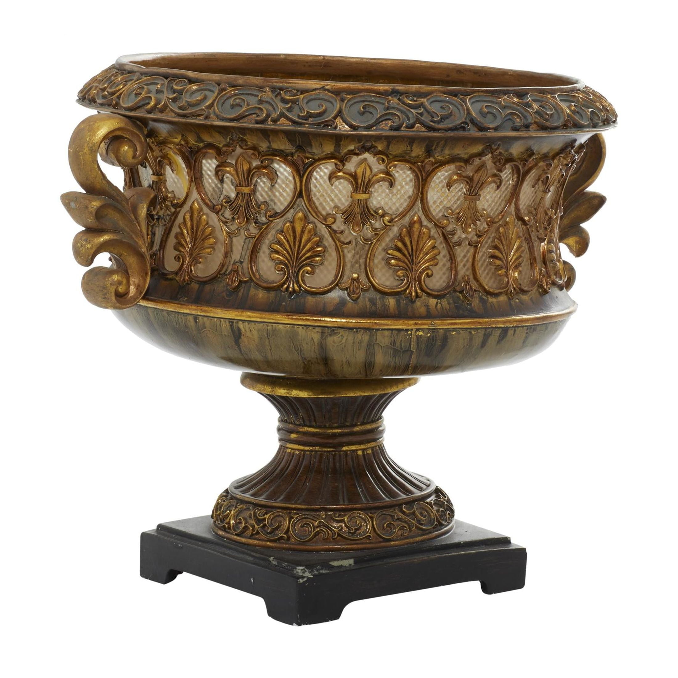 Designed with timeless sophistication, rich old-world textures and warm hues come together for a refined classic taste of luxury Gold large decorative bowl is crafted from durable polystone materials, ensuring both beauty and longevity Round fruit bowl for kitchen counter highlights a satin gold finish with distressing, complemented by a dark brown base The polystone dining table centerpiece boasts ornate sculpted details, adding elegance to any space The gold polystone decorative bowl measures 15L x 10W x 13H inches, and weighs 8.90 lbs Satin gold decorative bowl for kitchen counter showcases a rounded body on a fluted pedestal base, adorned with embossed acanthus leaves, heart-shaped scrolls, and ornate scrolled handles Wipe clean with a dry cloth Traditional kitchen decor is molded from polystione, showcasing expert craftsmanship in its design Traditional style DecMode 10″ Round Ornate Fleur De Lis Gold Polystone Decorative Bowl makes a perfect addition to any home