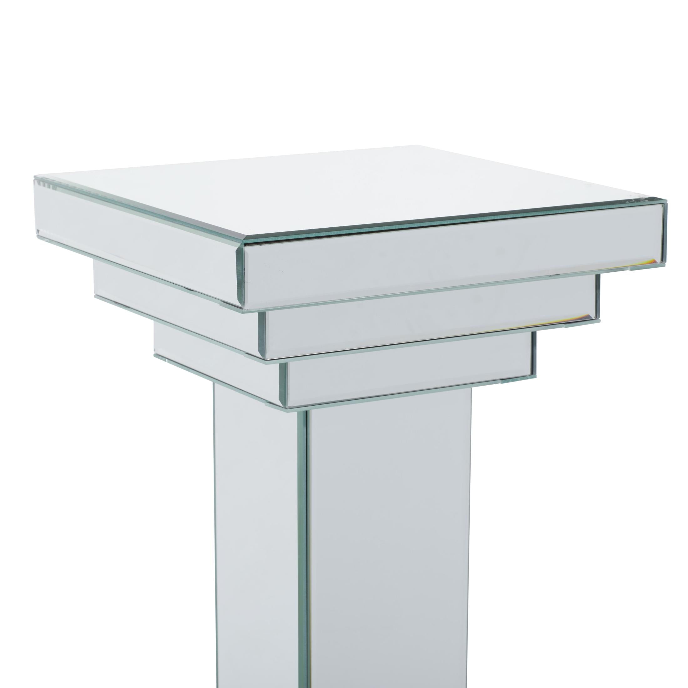 Indulge in the glamorous luxury of plush textures, dazzling details, and sleek finishes to elevate your home and add a sophisticated flair The silver side end pedestal table boasts an MDF framework covered with mirror panels from top to bottom, leaving the base untouched Square table features a mirrored silver finish that captures and reflects light, showcasing shimmering silver hues throughout its design Glass pedestal table stands tall with a square tabletop and proportionate sections, highlighting its elegant silhouette The silver glass pedestal table measures 12L x 12W x 36H inches, and weighs 44 lbs Mirrored silver living room table features a column-like design with a square top and base, offering sleek patterns and refined details Wipe clean with a dry cloth Constructed with precision, the glam small table combines an MDF framework adorned with meticulously placed mirror panels Glam style DecMode 12″ x 36″ Silver Glass Mirrored Pedestal Table, 1-Piece makes a perfect addition to any home