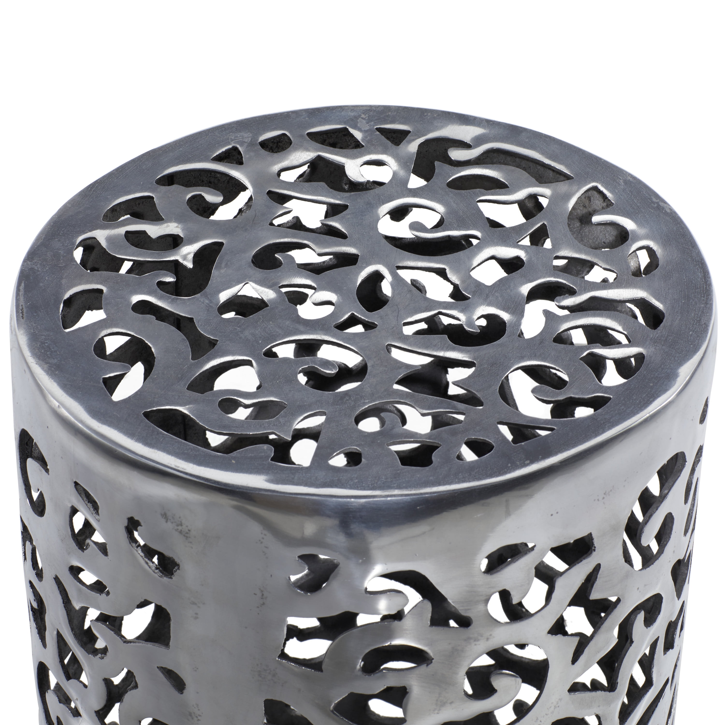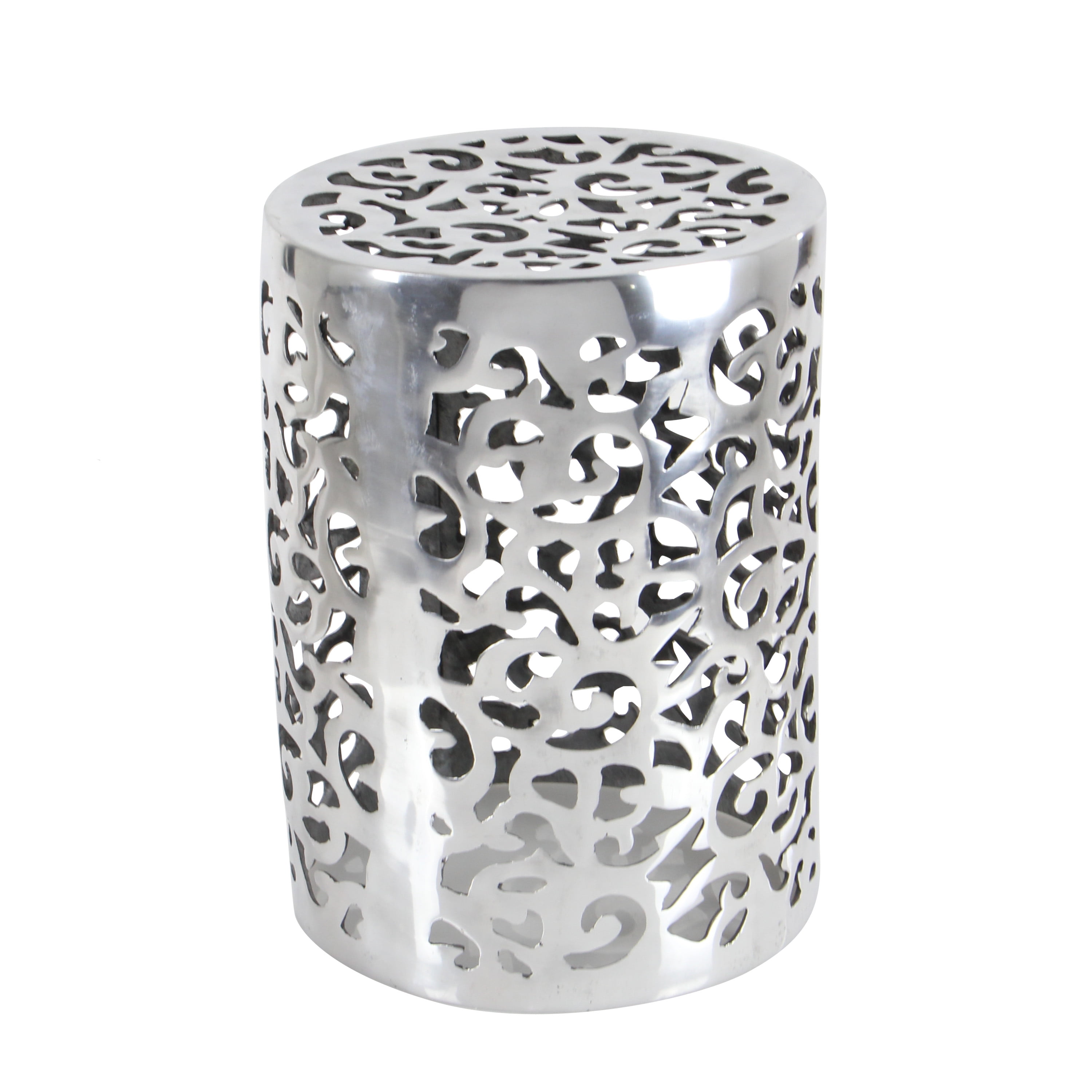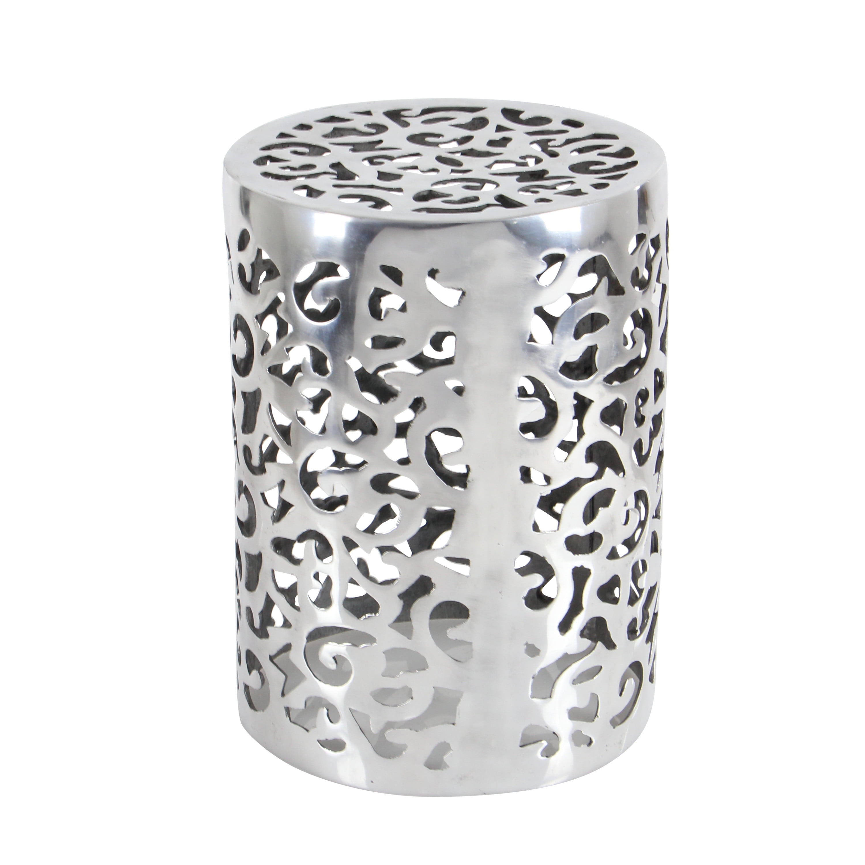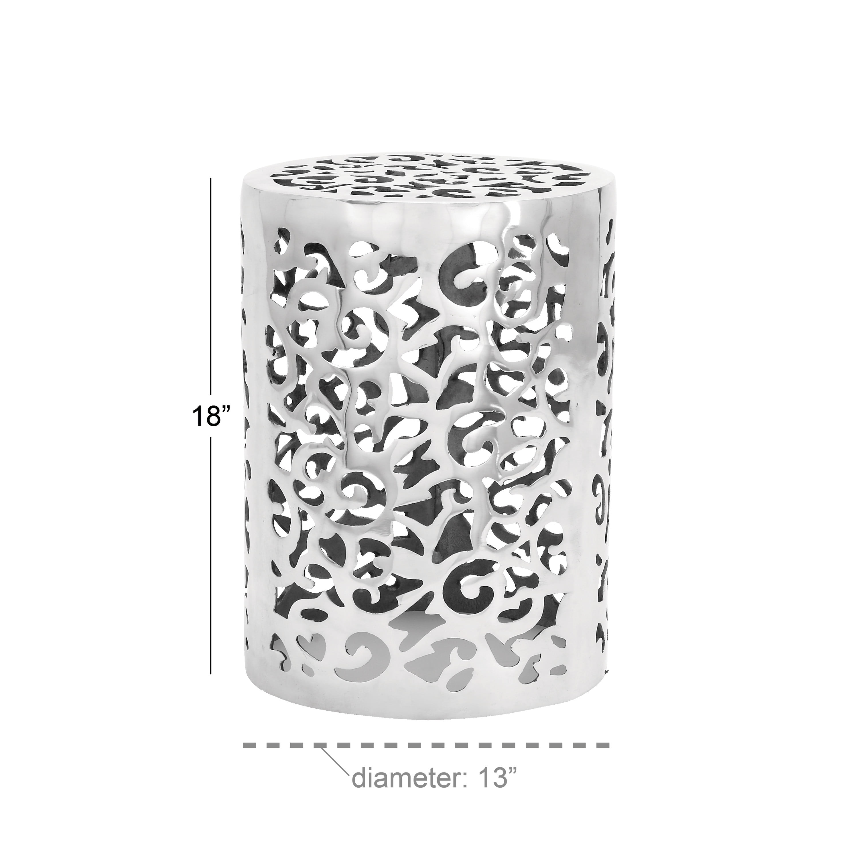 Embrace artistic expression with a style that highlights bold designs with sleek lines, neutral elements, and a minimalist aesthetic Contemporary silver accent table is crafted from aluminum for a durable design Drum accent table has an eye-catching silver finish Corner accent table features a cage design with perforated floral pattern in an open cylindrical structure for optimal storage The accent table measures 13L x 13W x 18H inches, and weighs 9.44 lbs This corner accent table has a cylindrical shape with abstract cut-out designs Wipe clean with a dry cloth This metal drum accent table is constructed from molded aluminum and given a dazzling finish Contemporary style DecMode 13″ x 18″ Silver Aluminum Scroll Accent Table, 1-Piece makes a perfect addition to any home