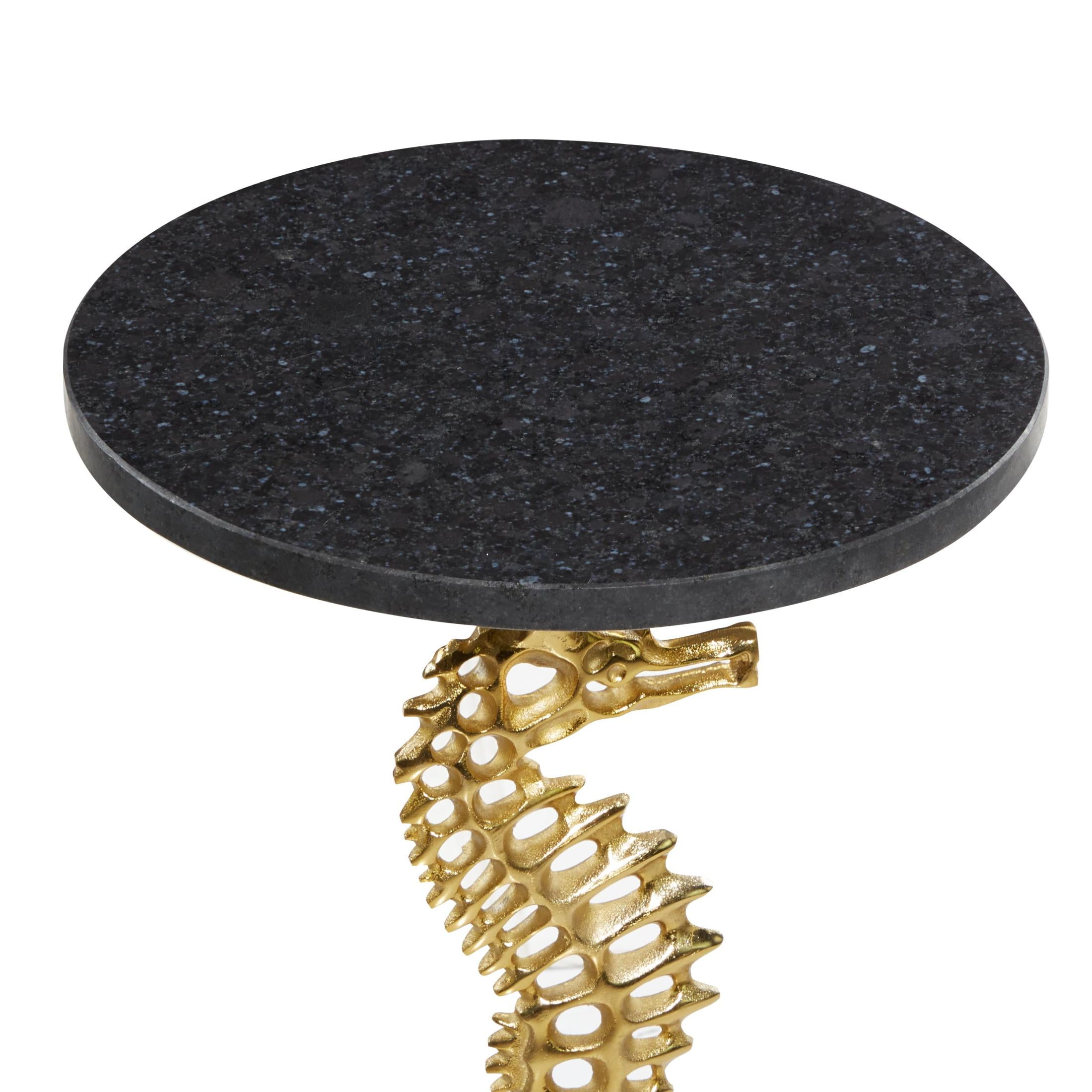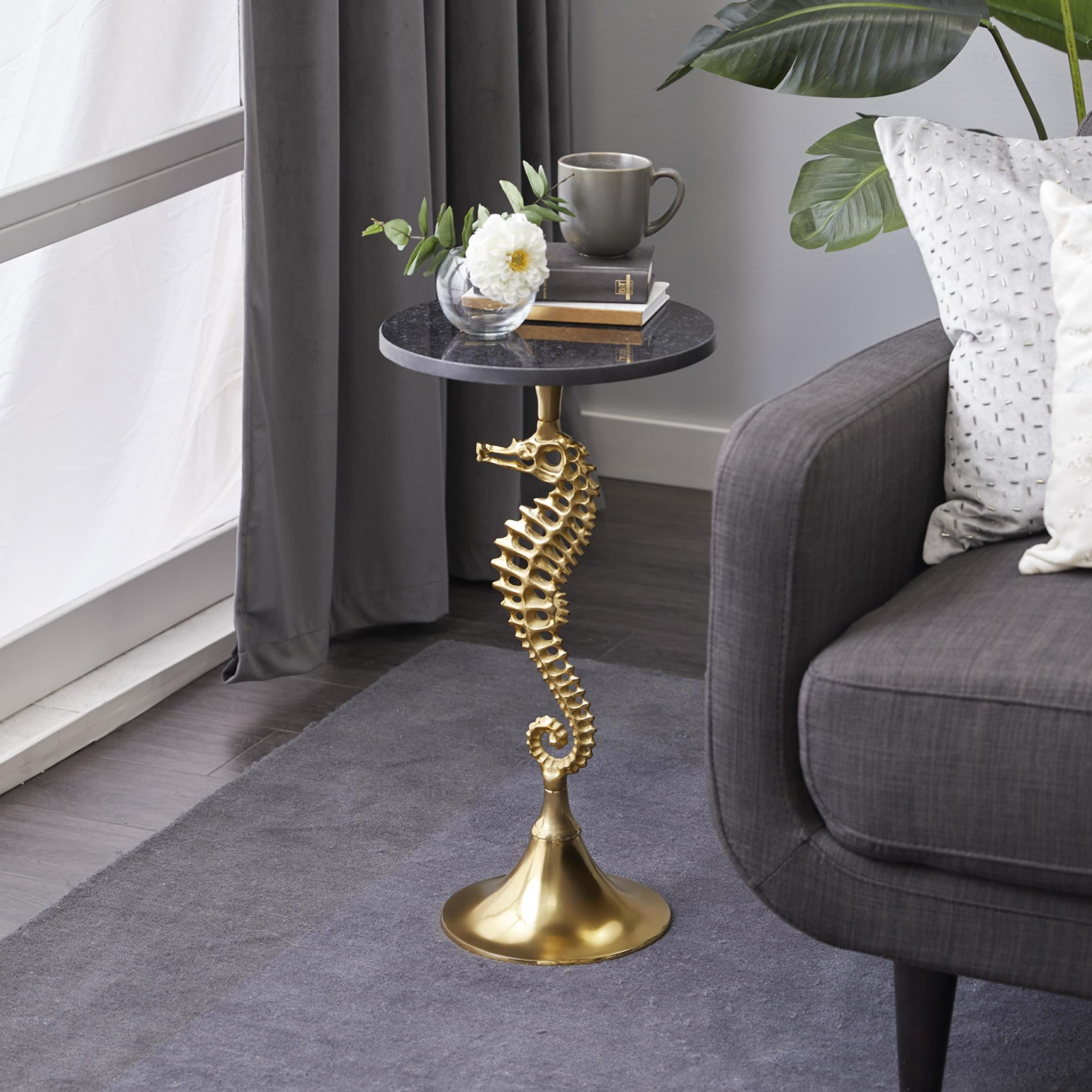 DecMode 13″ x 25″ Gold Aluminum Sea Horse Accent Table with Black Marble Table Top, 1-Piece is a unique addition to your stylish home. Bring a finishing touch to your home with an inviting appeal with this beautifully crafted accent table. A compact friendly table providing you with additional surface storage space any where in your home. Round metal accent table will complement bold color walls and furniture pieces for the perfect whimsical look. This item ships in 1 carton. Suitable for indoor use only. This item ships fully assembled in one piece. Maximum weight limit is 30 lbs. Made in India. This is a single gold colored end table. Coastal style.