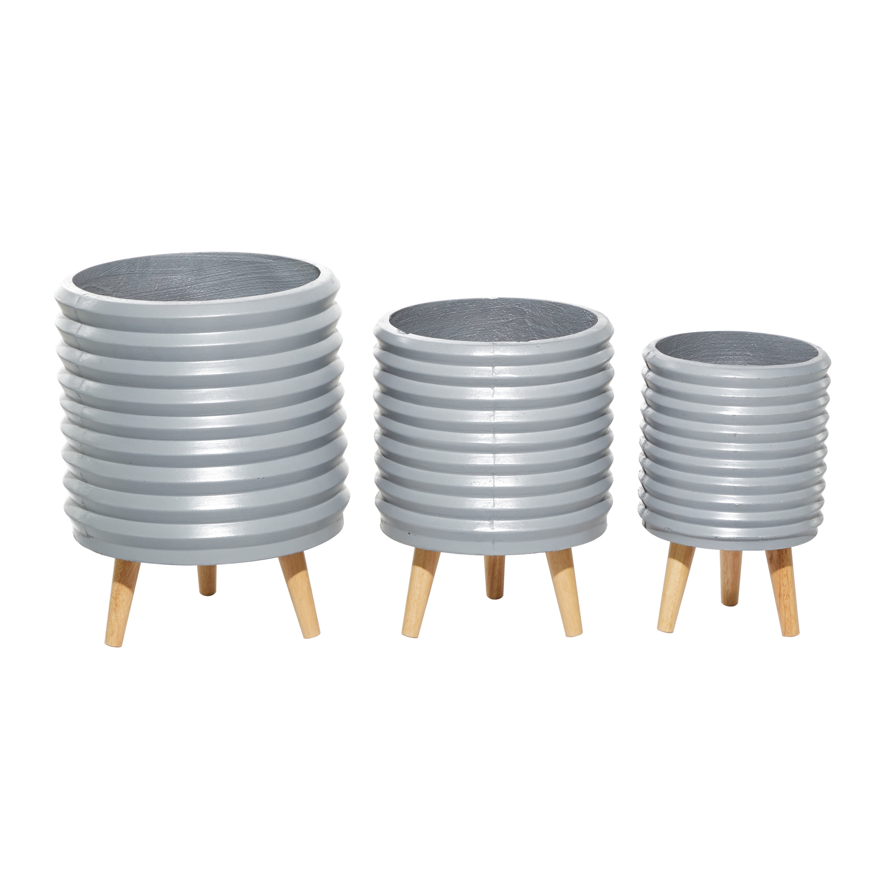 A contemporary style offers neutral elements and basic forms with a bold design Each planter is made with a light weight stonelike material called magnesium oxide These planters comes in a gray finish with light brown tripod legs Features horizontal groove patterns on the surface and rounded tapered tripod legs Each item in this set measures 14″L x 14″W x 18″H, 12″L x 12″W x 16″H, 9″L x 10″W x 14″H and weighs 36 lbs These set of planters features horizontal groove patterns on the surface with round body and tapered tripod legs Wipe clean with a dry cloth Features a cylindrical body for maximum soil holding Contemporary design DecMode 14 In. Planter, MGO, Gray, 3 – Pieces makes a perfect addition to any home