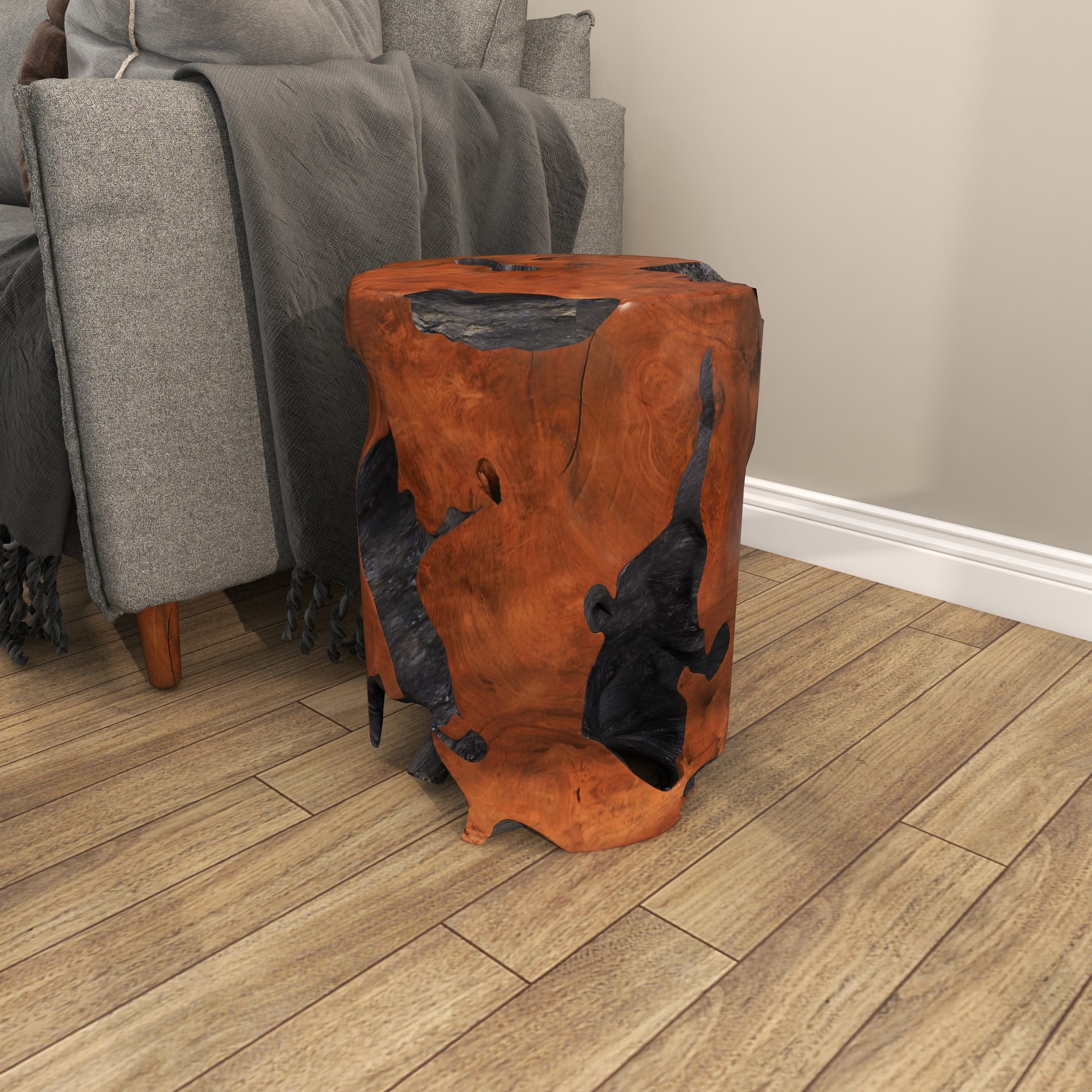 DecMode Teak Wood Handmade Live Edge Stump Stool with Charred Detailing, Brown