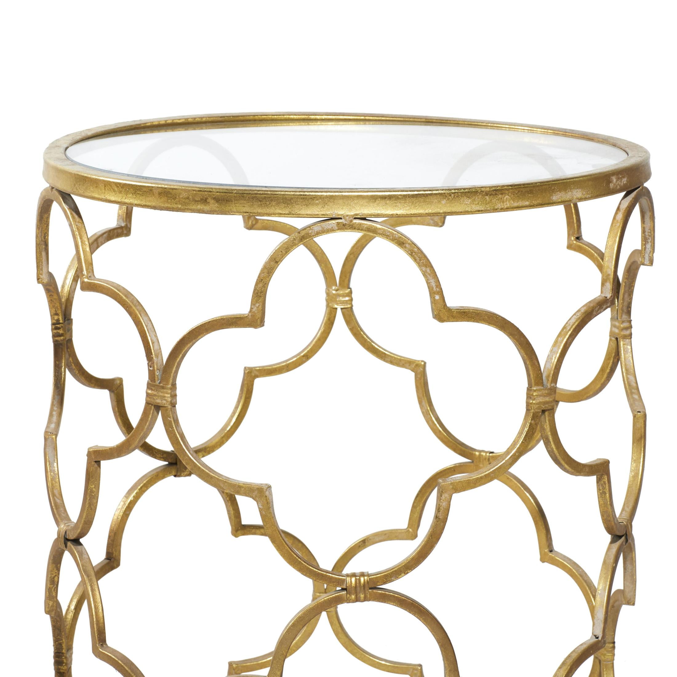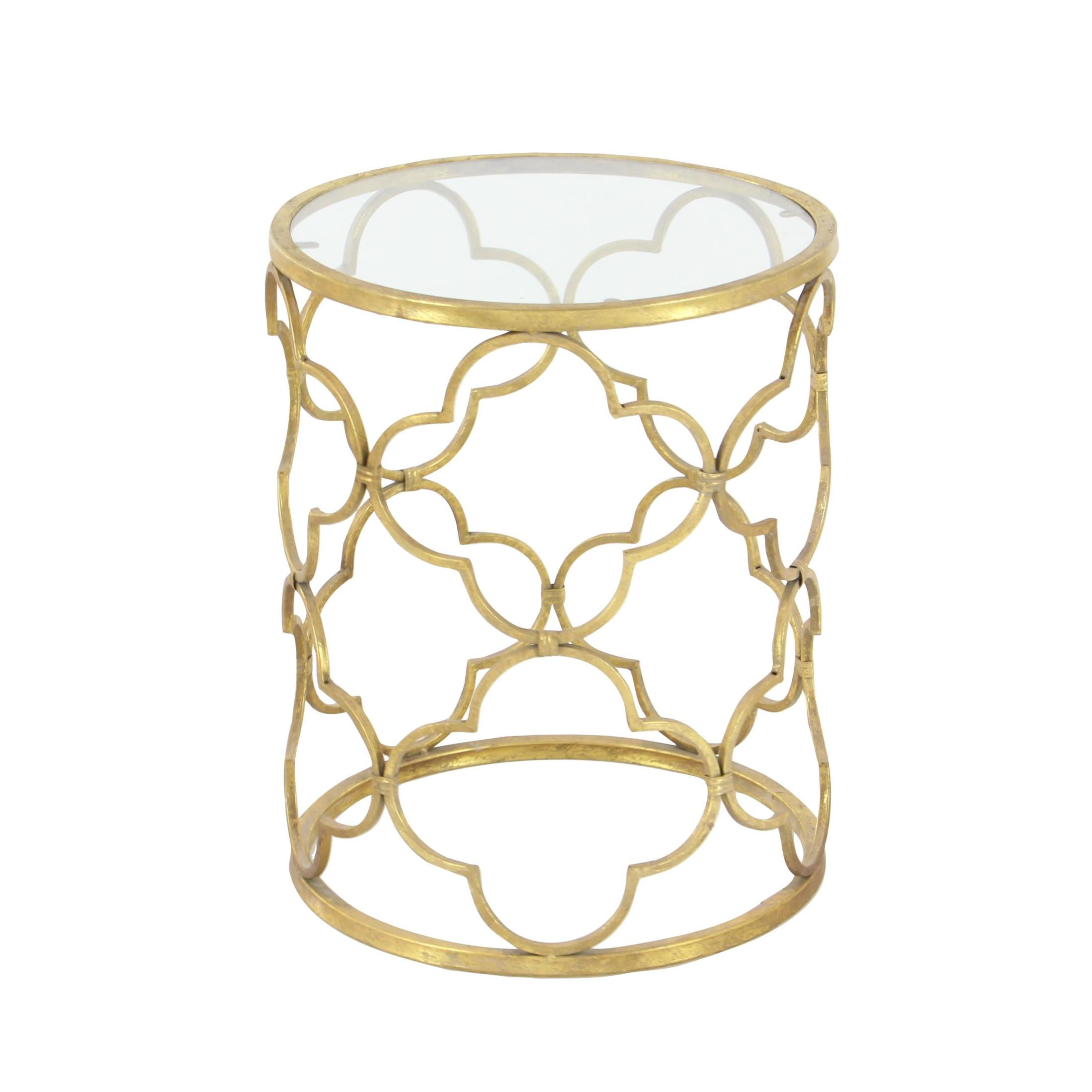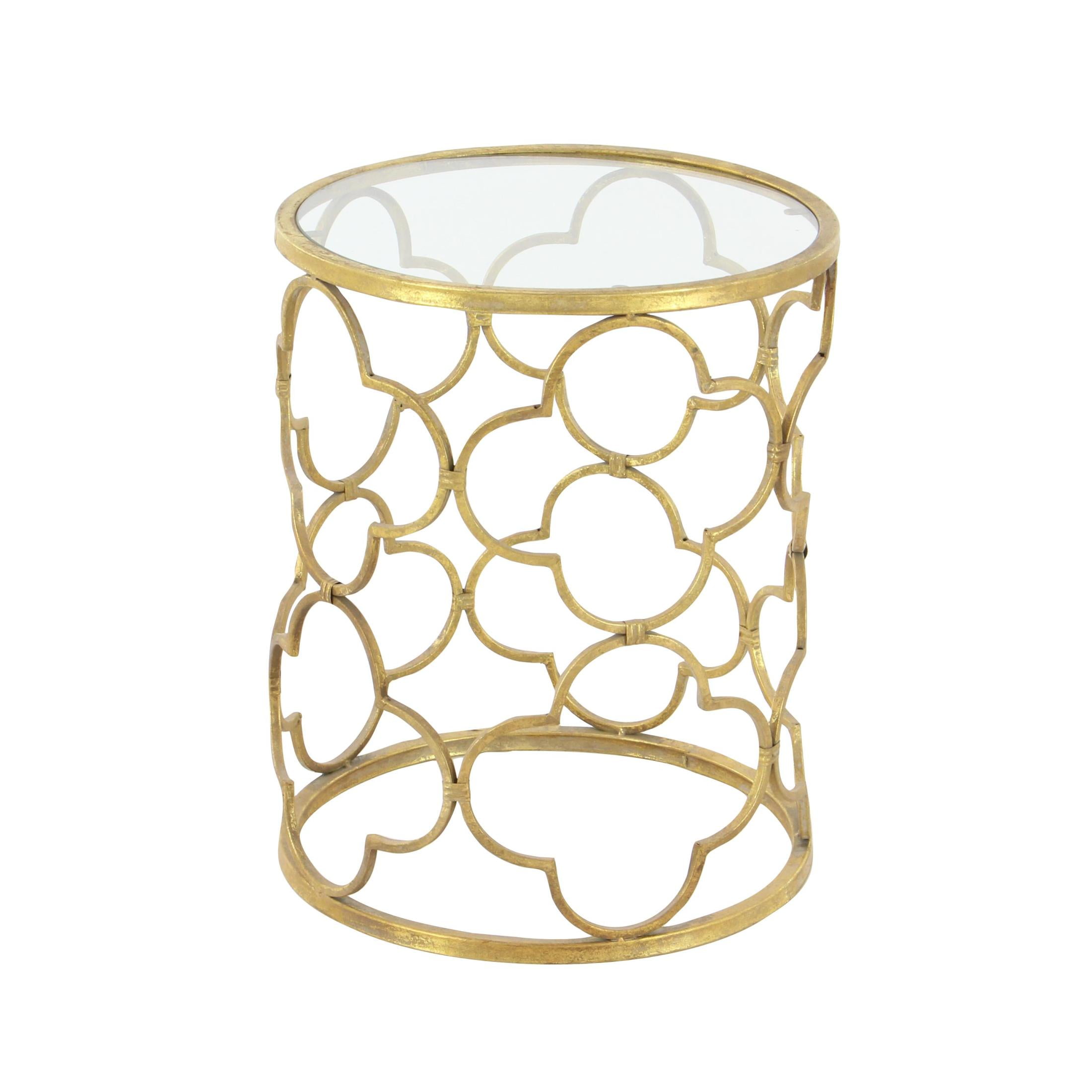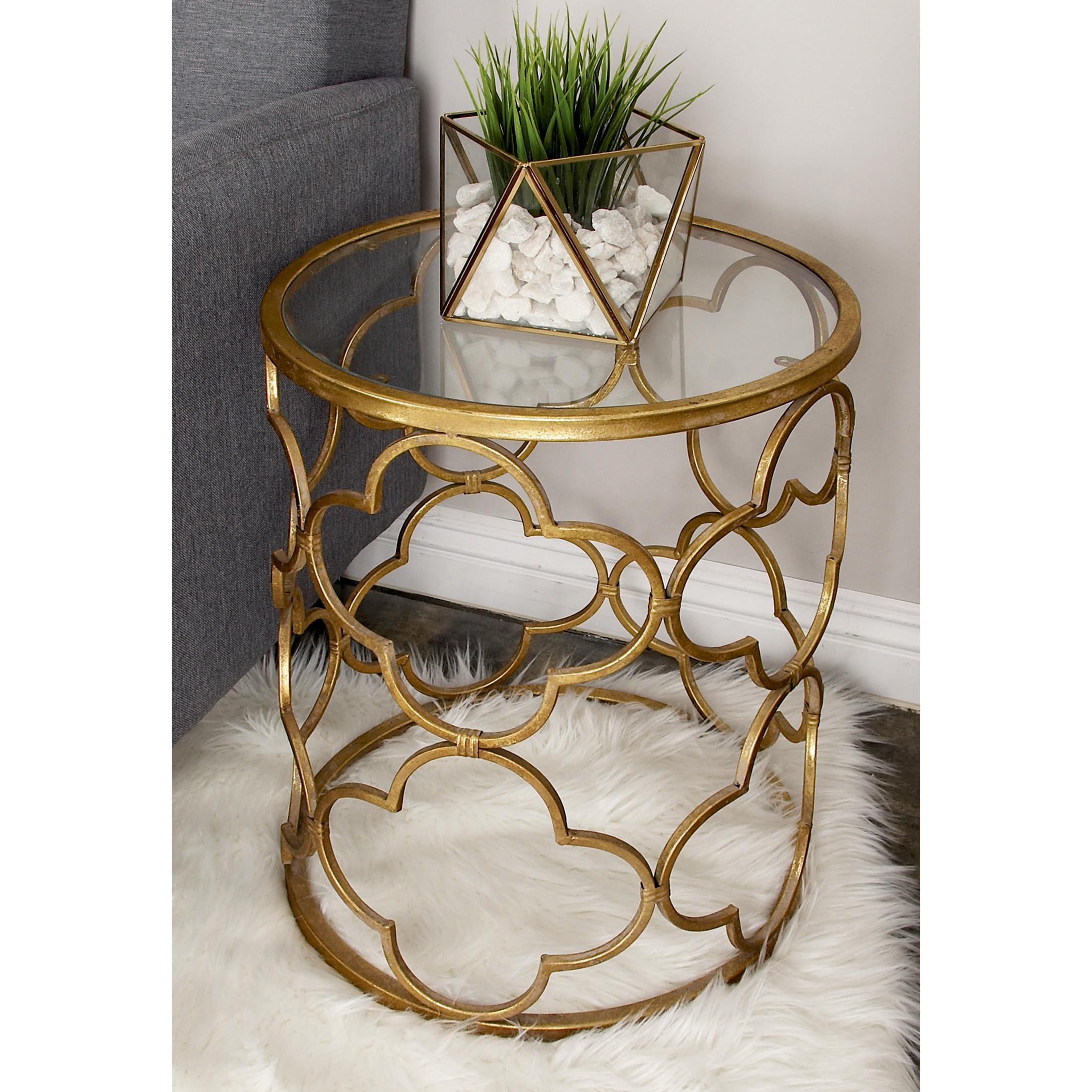 Embrace artistic expression with a style that highlights bold designs with sleek lines, neutral elements, and a minimalist aesthetic Crafted from sturdy iron and glass, this gold side end accent table offers durability with its cylindrical base showcasing a captivating lattice design Cylinder table displays a weathered gold finish with a clear glass top This iron accent table features an open-style frame that houses a striking quatrefoil metal structure beneath a round glass surface The gold metal accent table measures 16L x 16W x 20H inches, and weighs 11.03 lbs With its clear glass top and intricate quatrefoil base structure, this weathered gold living room table presents an appealing blend of shapes and textures Wipe clean with a dry cloth Each element of this contemporary large table has been carefully crafted with the clear glass top being securely attached to the welded metal frame, creating an open yet robust construction Contemporary style DecMode 16″ x 20″ Gold Metal Quatrefoil Design Accent Table with Clear Glass Top, 1-Piece makes a perfect addition to any home