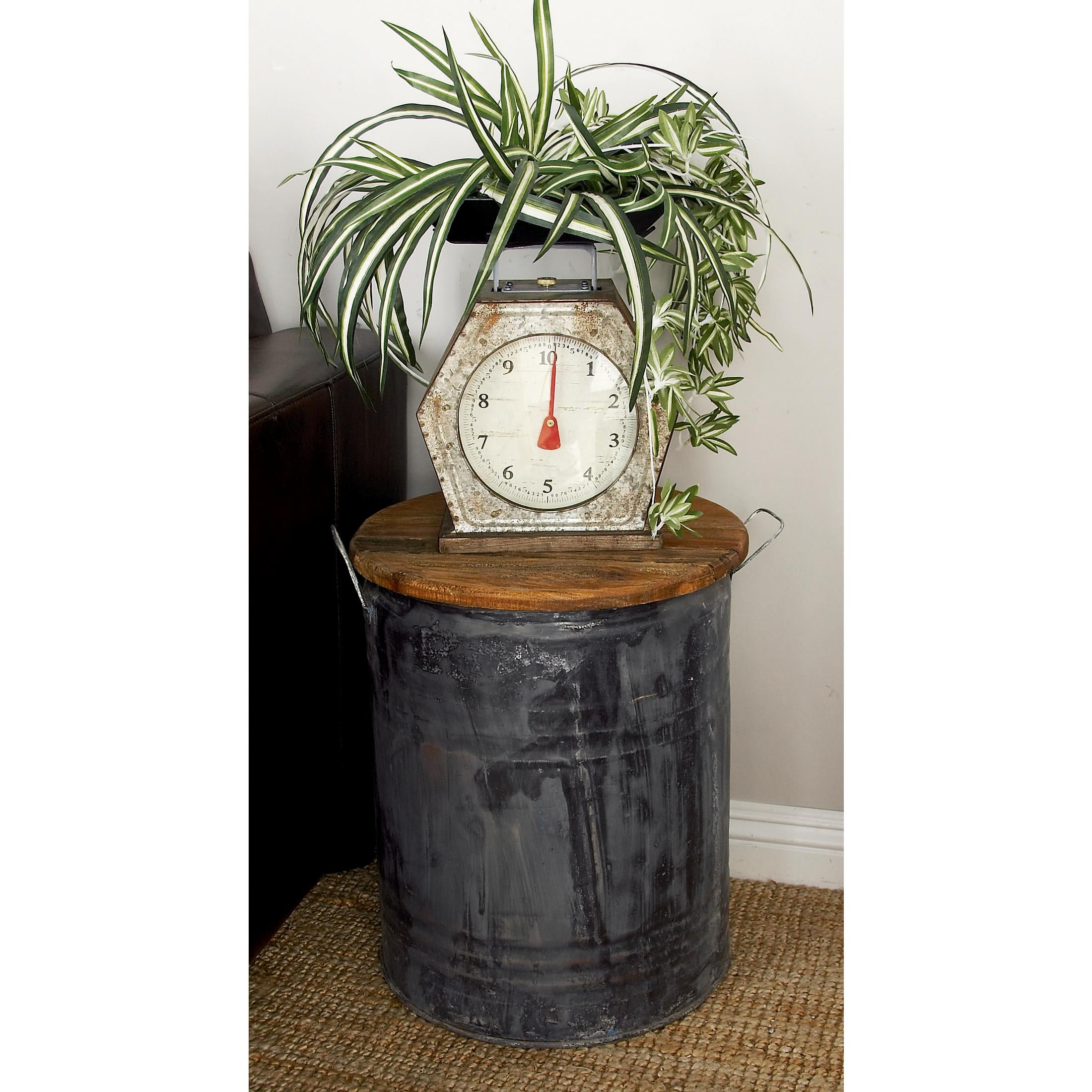 Infuse your home with cozy charm, where weathered textures, rustic finishes, and warm earthy tones create a wholesome atmosphere Crafted from sturdy mahogany wood and tin, this gray side end accent table offers both durability and aesthetic appeal Round table boasts a heavily weathered gray tin base, complemented beautifully by a dark brown wooden top This tin accent table features an ample interior space with a metal side handle and a wooden top for discreet storage The gray metal accent table measures 16L x 16W x 20H inches, and weighs 7.70 lbs Embodying a perfect blend of form and function, this weathered gray living room table sports a tarnished gray body in a cylindrical shape topped with brown wood Wipe clean with a dry cloth This farmhouse large table is meticulously constructed using slatted wood and hammered metal sheet, giving it a unique rustic charm Farmhouse style DecMode 16″ x 20″ Gray Metal Accent Table with Brown Wood Top, 1-Piece makes a perfect addition to any home