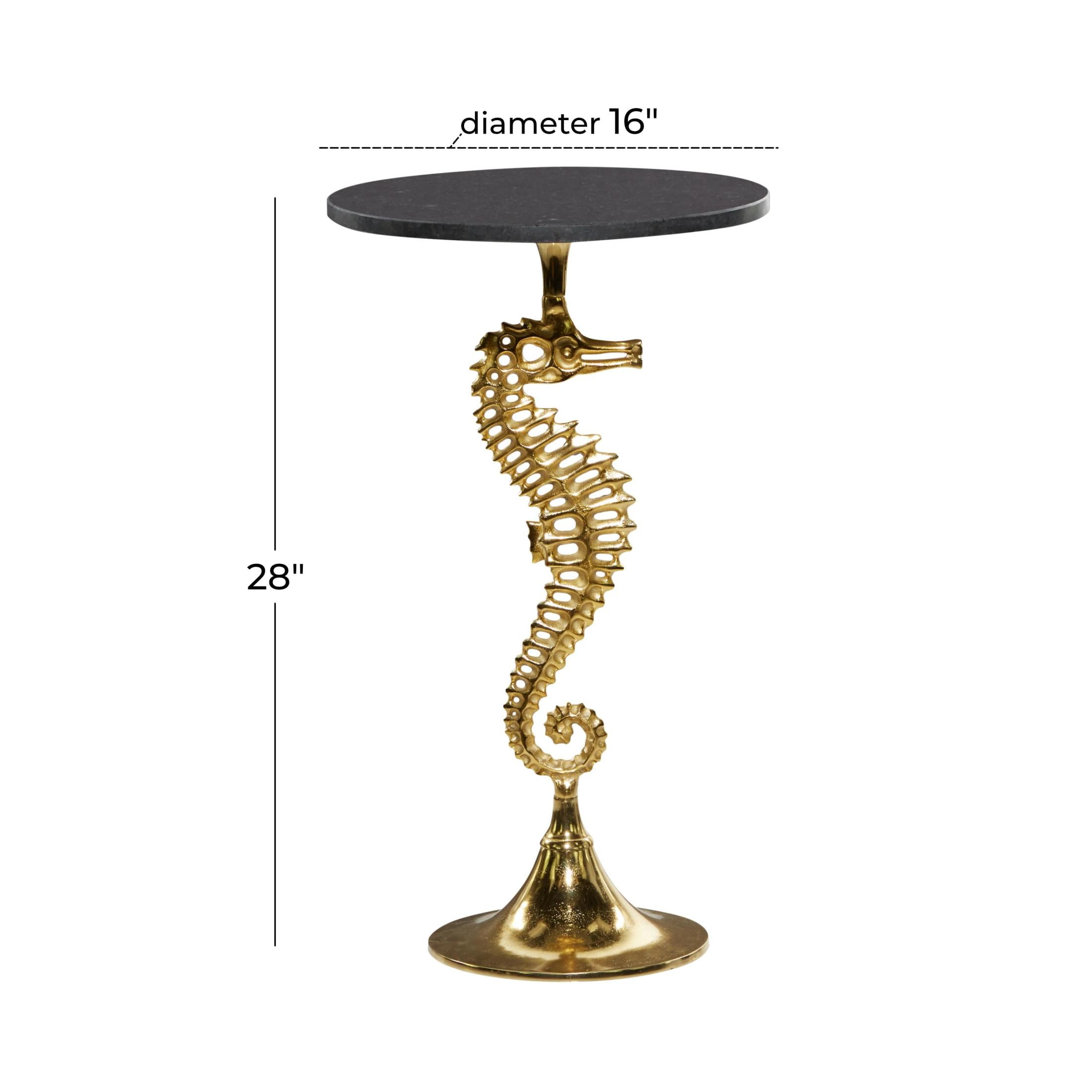 DecMode 16″ x 28″ Gold Aluminum Metal Pedestal Sea Horse Accent Table with Black Marble Tabletop, 1-Piece is a unique addition to your stylish home. Bring a finishing touch to your home with an inviting appeal with this beautifully crafted accent table. A compact friendly table providing you with additional surface storage space any where in your home. This sea horse end table serves as an excellent addition to bold color walls and furniture pieces, offering a whimsical touch to your interior decor. This item ships in 1 carton. Suitable for indoor use only. This item ships fully assembled in one piece. Marble is a product of nature and no two pieces are exactly alike. It is prone to variations in color and/or patterns in the material that add to the beauty and charm of the piece.. Maximum weight limit is 30 lbs. Made in India. This is a single gold colored end table. Coastal style.