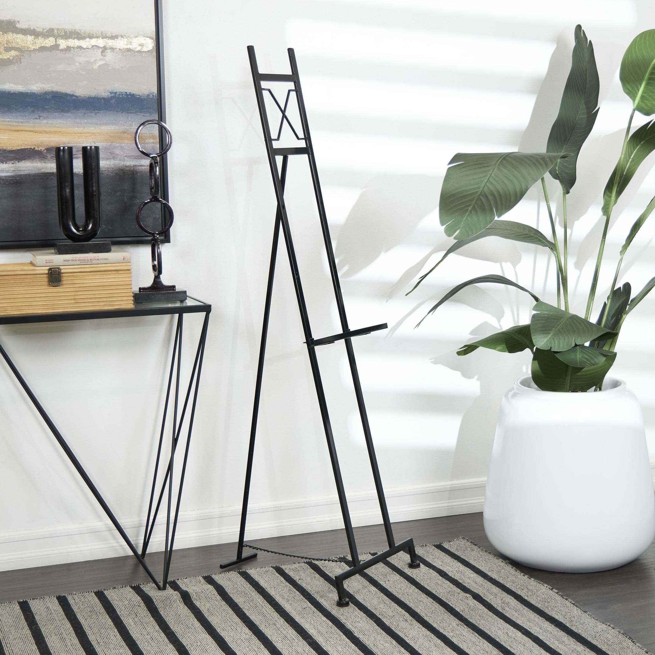 Embrace artistic expression with a style that highlights bold designs with sleek lines, neutral elements, and a minimalist aesthetic The black display easel is crafted from solid iron for a durable and lasting form The rectangle easel stand features a matte black finish with a black chain for a sleek contemporary look The iron easel features a stylish modern design with three adjustable tiers and chain support for versatile display options The black metal easel measures 15.50L x 18.50W x 57.20H inches, and weighs 4.50 lbs The matte black decorative easel showcases a tall rectangular structure with X-shaped rods at the top Wipe clean with a dry cloth This contemporary easel for decoration is constructed from solid iron welded together and attached with a chain for robust structure Contemporary style DecMode 16″ x 57″ Black Metal Large Adjustable 3 Tier Easel with Chain Support, 1-Piece makes a perfect addition to any home