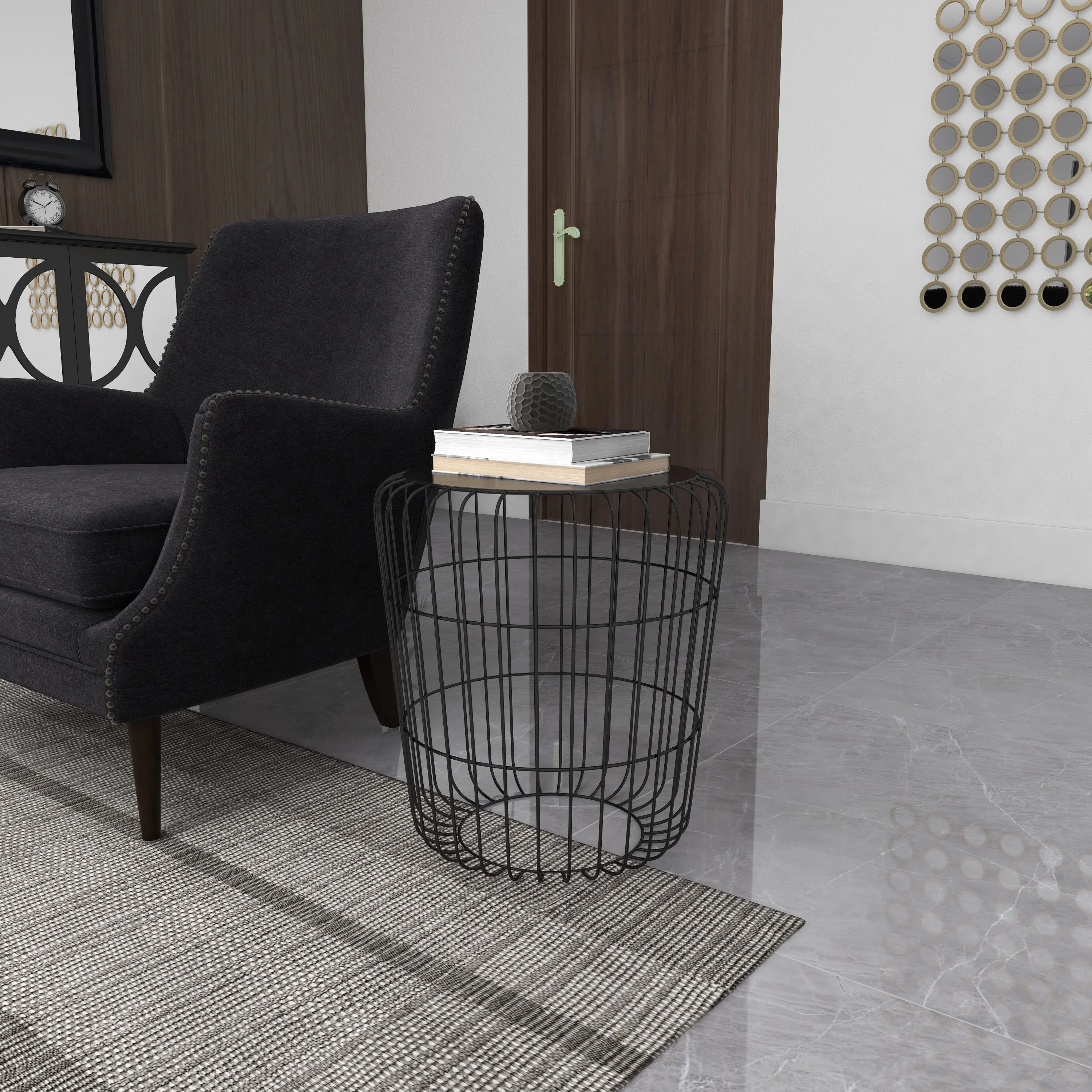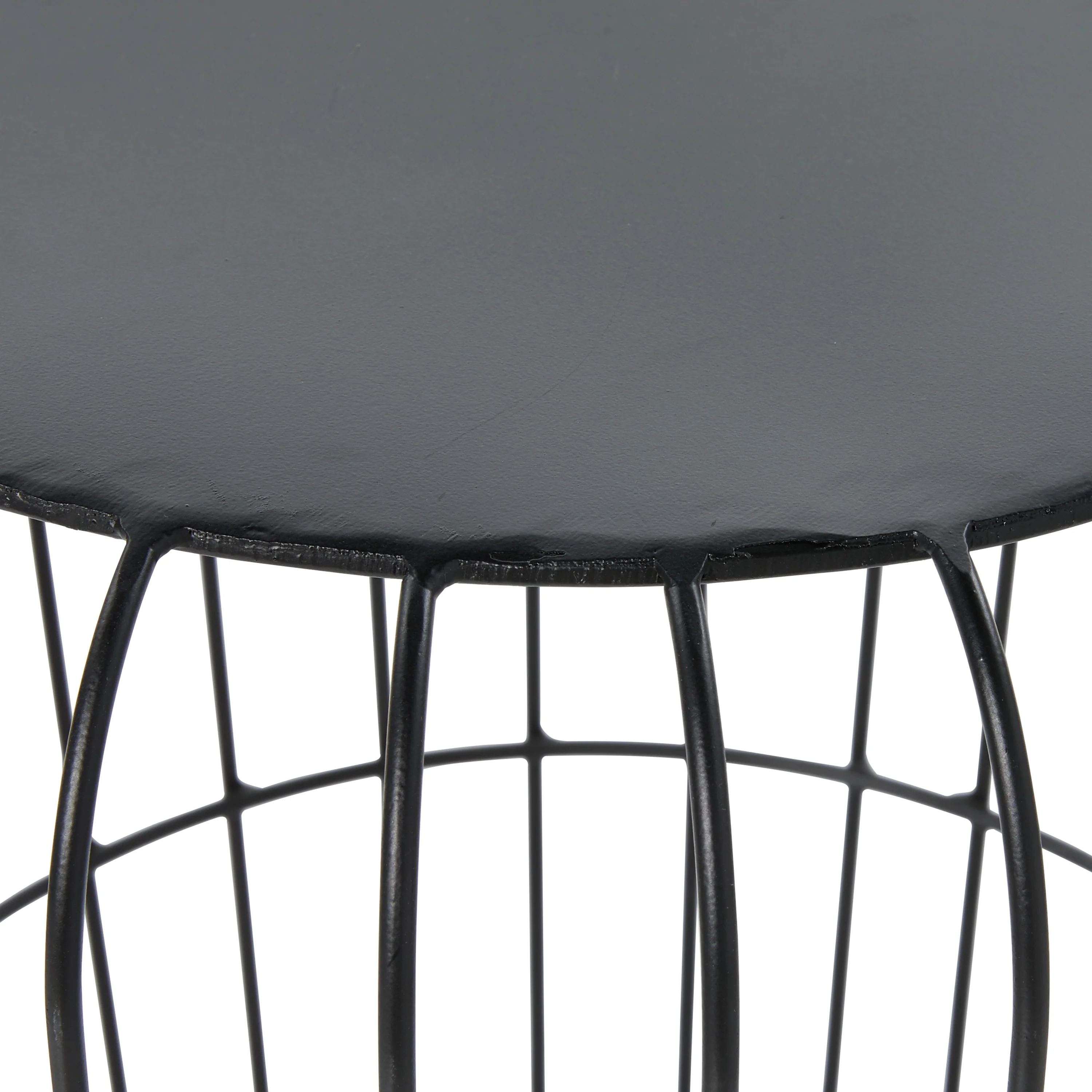 Features an industrial inspired design to make your space unique This outdoor accent table is made from a solid iron construction with protective coating making it impervious to the elements with anti-corrosive property This wire outdoor table carries a semi-matteblack tabletop and a hollow black base This round outdoor accent table highlights a cage-like base made of metal rods Item measures 18″ x 17″ x 17″and weights 8.8 lbs This rectangle ottoman bench with storage has a textured brown frame and beige cushion Wipe clean with a dry cloth This long storage ottoman bench is built with securely attached metal handles on the sides of the wooden frame Designed with an industrial theme DecMode 18″ x 17″Black Metal Industrial Outdoor Accent Table makes a perfect addition to any home