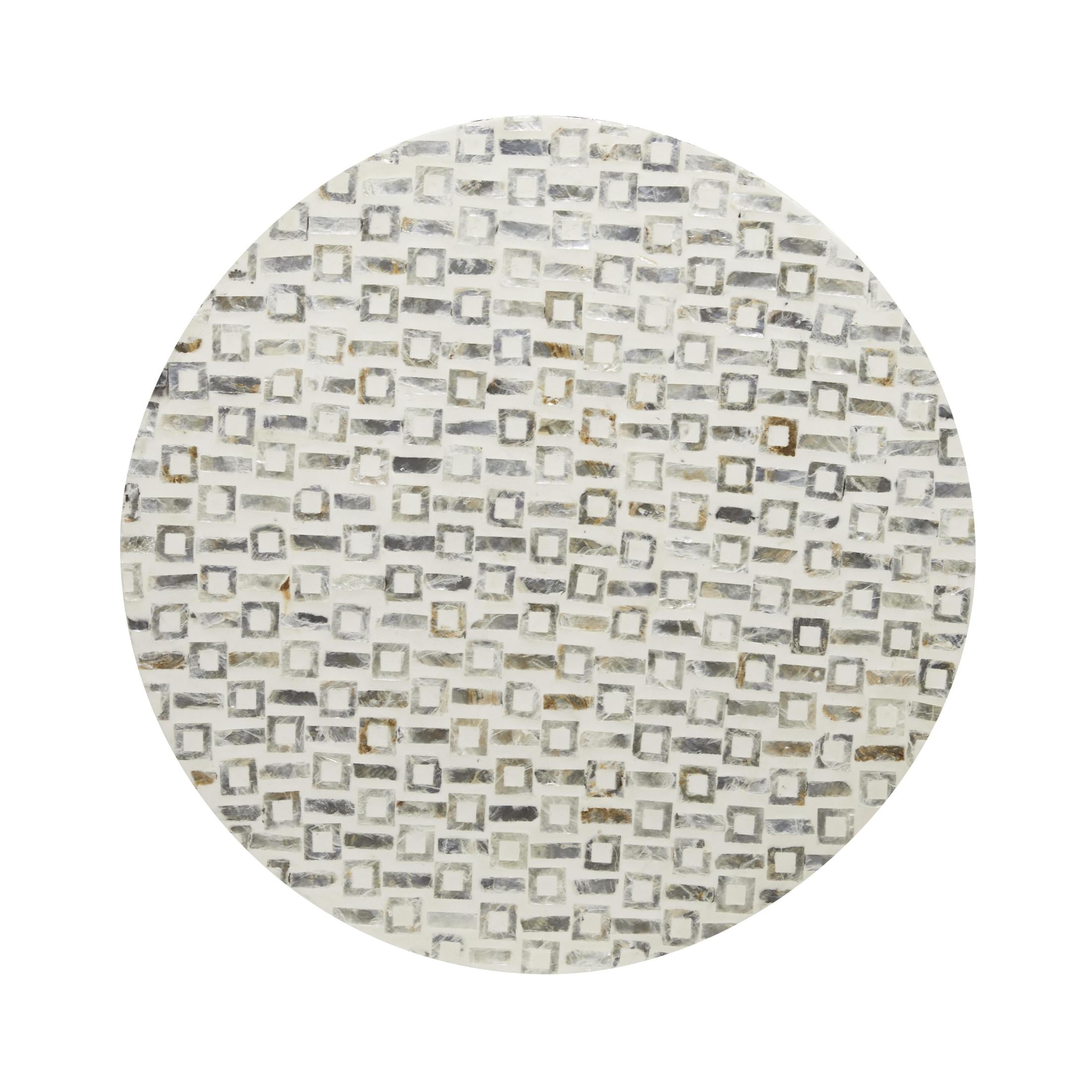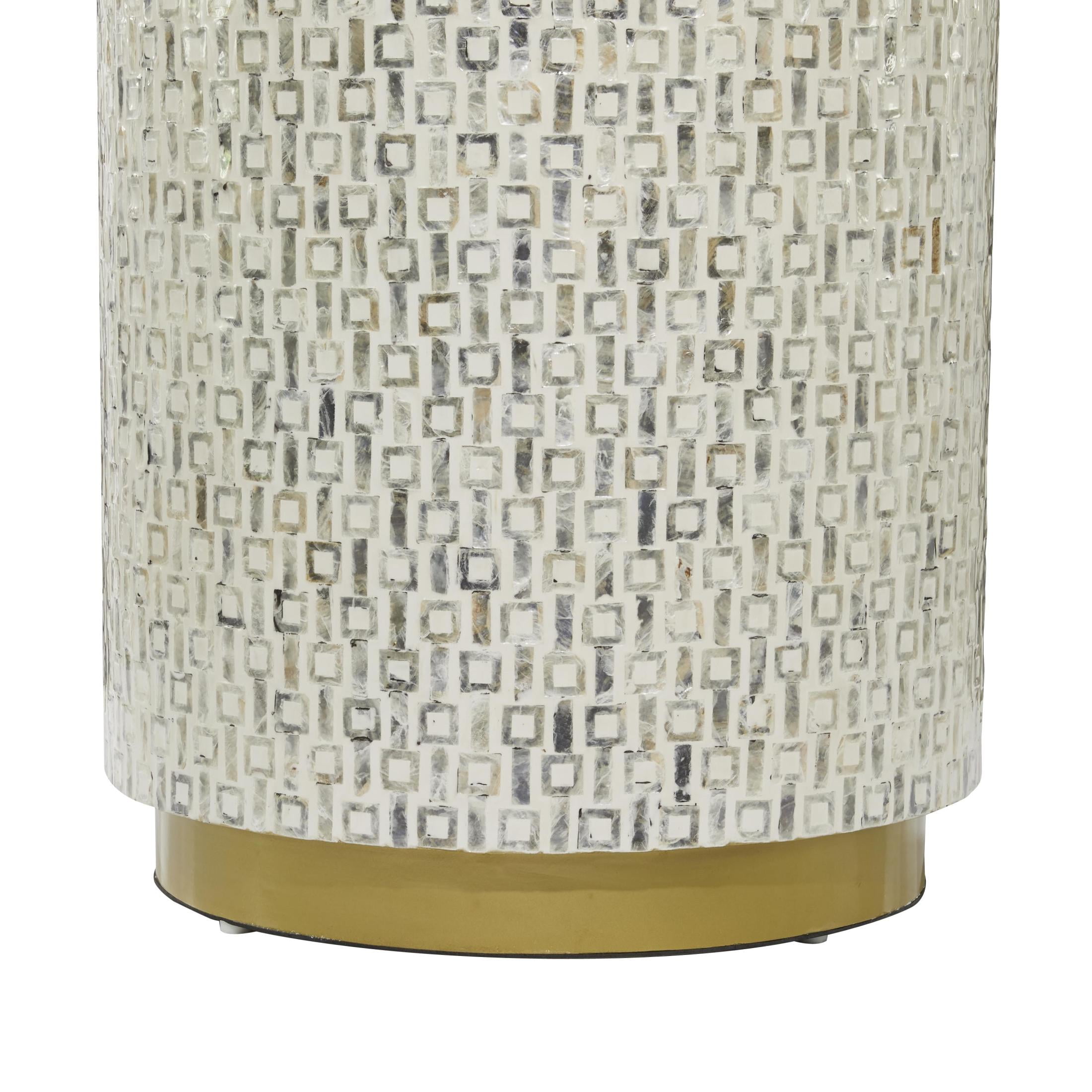 Embrace artistic expression with a style that highlights bold designs with sleek lines, neutral elements, and a minimalist aesthetic This charming side table is beautifully crafted in Vietnam and is made of quality shells and wood and mdf Features a white circular body with multicolor geometric pattern made of shells and a round gold base with anti-slip feet Accent table is designed with a round body with beautiful pearl inlays The accent table measures 17.80L x 17.80W x 22.35H inches, and weighs 20.05 lbs Designed with large round body with multicolor shells and a circular base that provides balance Wipe clean with a dry cloth Wood is beautifully carved to form a circular shape and is mounted on a flat, stable base Contemporary style DecMode 18″ x 22″ White Mother of Pearl Accent Table with Gold Base and Geometric Patterns, 1-Piece makes a perfect addition to any home