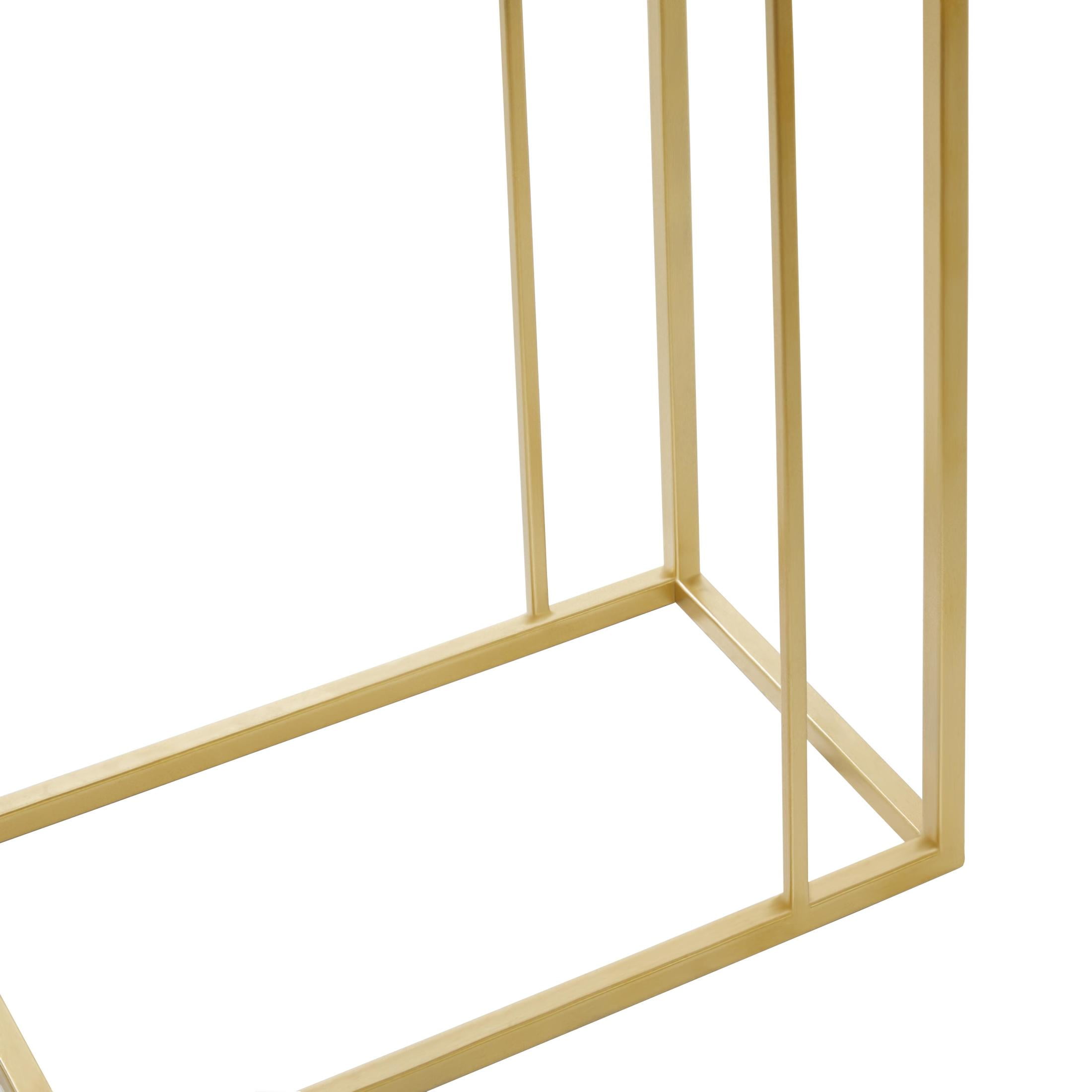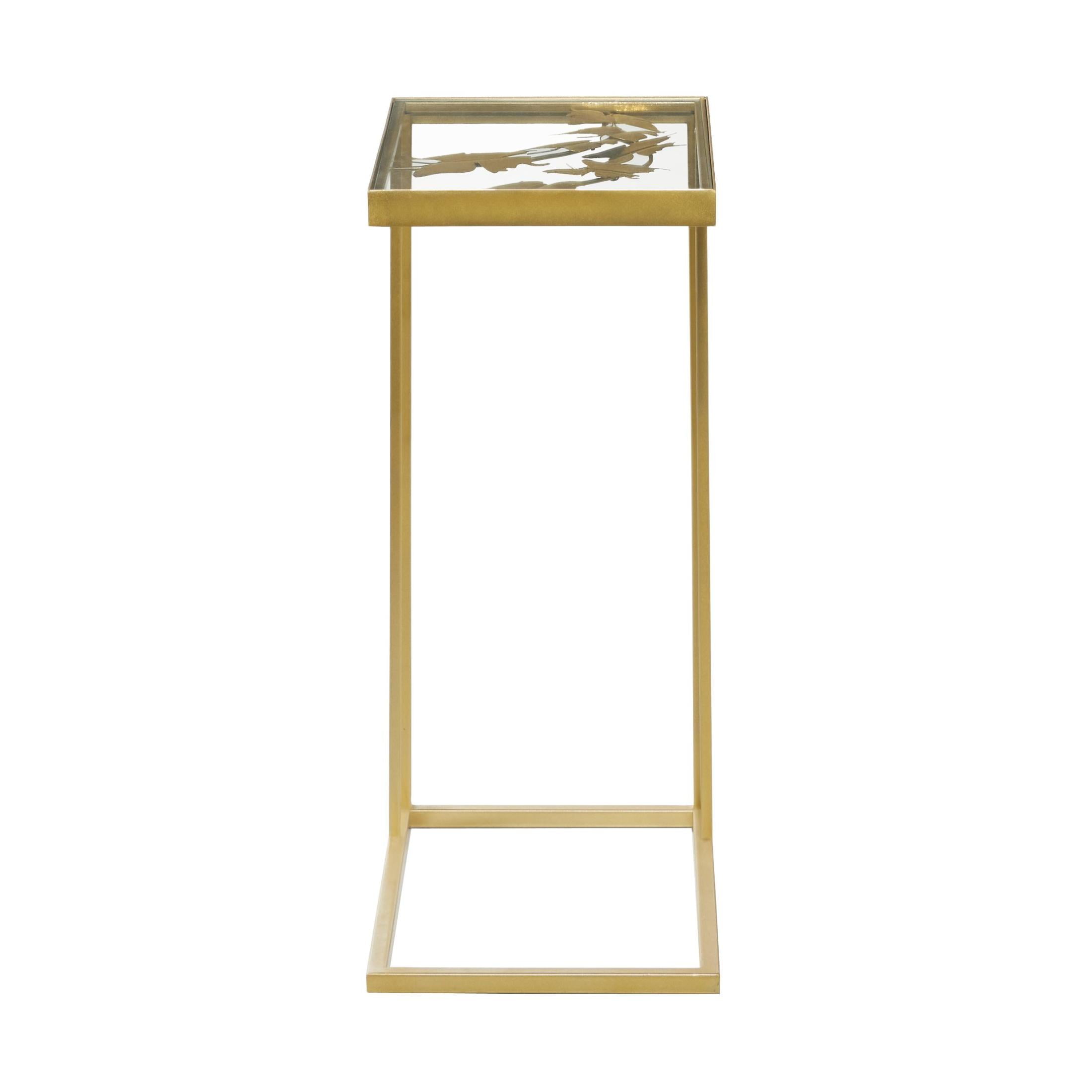 DecMode 18″ x 25″ Gold Metal Accent Table with Clear Glass Top, 1-Piece is a unique addition to your stylish home. Bring a finishing touch to your home with an inviting appeal with this beautifully crafted accent table. A compact friendly table providing you with additional surface storage space any where in your home. Its modern C-shape design makes the gold end table an ideal focal point in any living room setting such as a living room or bedroom. This accent table has a completely finished back. This item ships in 1 carton. Suitable for indoor use only. This item ships fully assembled in one piece. Maximum weight limit is 100 lbs. Made in India. This is a single gold colored end table. Contemporary style.