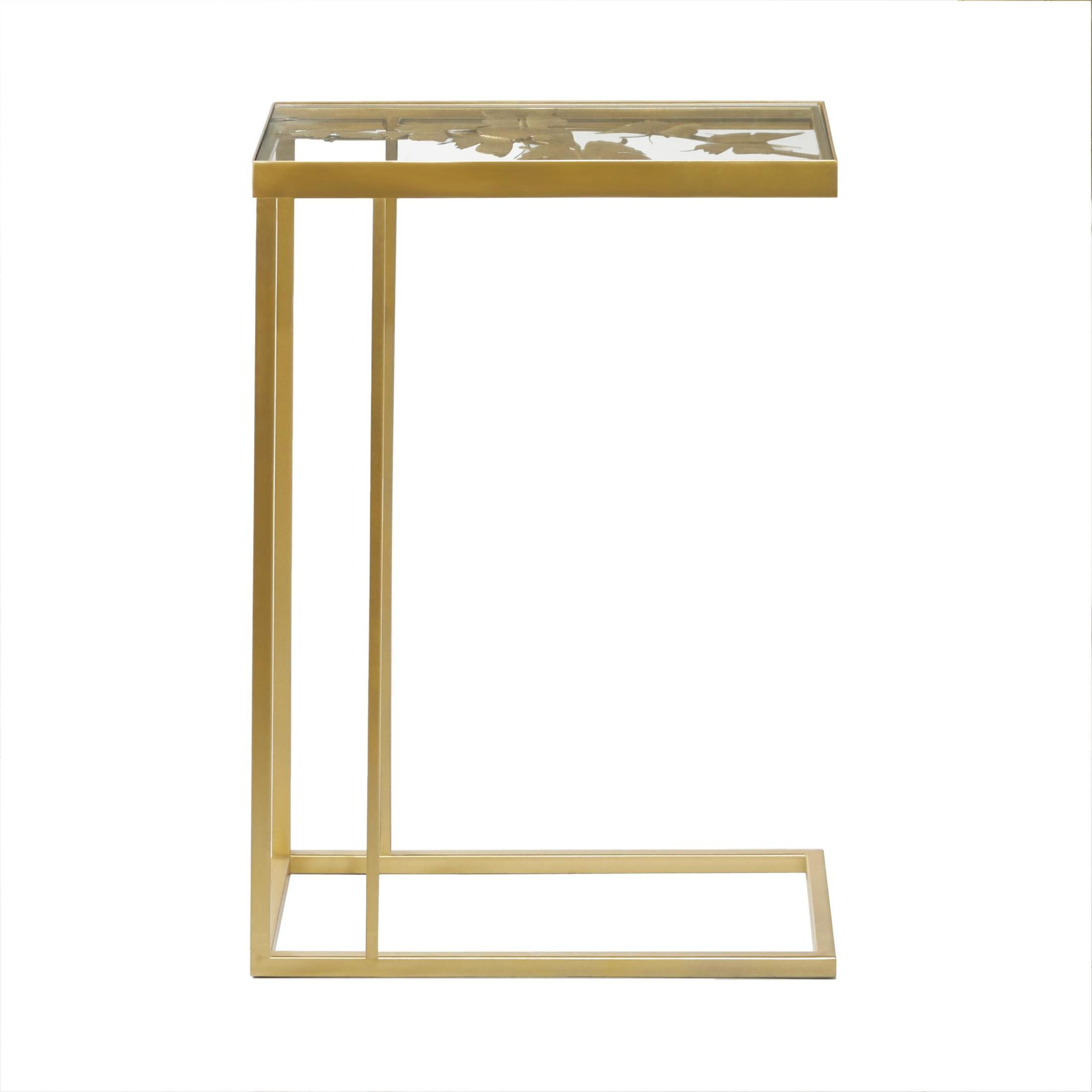 Embrace artistic expression with a style that highlights bold designs with sleek lines, neutral elements, and a minimalist aesthetic Made from fine iron and glass materials, this gold side end accent table manifests an enchanting golden butterfly design Rectangle table is a striking blend of a clear glass finish and a polished, gold-toned body that enhances its intricate iron metal butterfly accents Iron accent table features a unique surface adorned with butterfly motifs, adding to its charm The gold metal accent table measures 18L x 11W x 25H inches, and weighs 11 lbs Polished gold living room table boasts an elegant C-shaped design with a clear glass body supported by open style iron legs, highlighting its unique shape Wipe clean with a dry cloth Crafted meticulously, each metal butterfly embellishment on this contemporary large table is firmly placed in the bottom of the glass top Contemporary style DecMode 18″ x 25″ Gold Metal Accent Table with Clear Glass Top, 1-Piece makes a perfect addition to any home