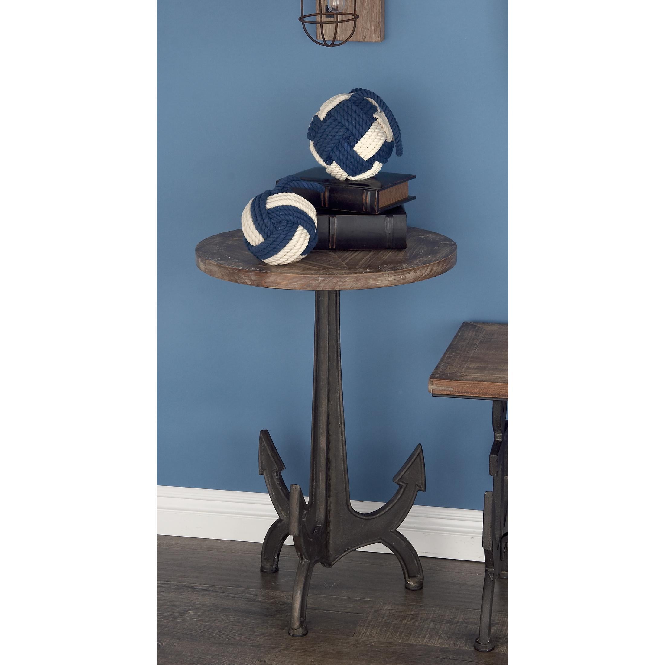 Inspired by blissful serenity and the allure of the sea, where the harmonious balance of brass and natural textures bring the desired essence of boat life to the home This black side end accent table is crafted from solid wood and robust metal, ensuring durability Round table showcases a distressed brown top and a black metal anchor stand, providing an appealing contrast This iron accent table stands out with its unique features such as a round top and a metal anchor-shaped body supported by a sturdy tripod base The black metal accent table measures 18L x 18W x 26H inches, and weighs 23.45 lbs Distressed black living room table retains its charm with its round top and metal anchor shaped body resting on a tripod base Wipe clean with a dry cloth Each component of the nautical large table is meticulously crafted with the wood material being mounted on a welded metal stand that flaunts an exclusive anchor design Nautical style DecMode 18″ x 26″ Black Metal Anchor Accent Table with Brown Wood Top, 1-Piece makes a perfect addition to any home