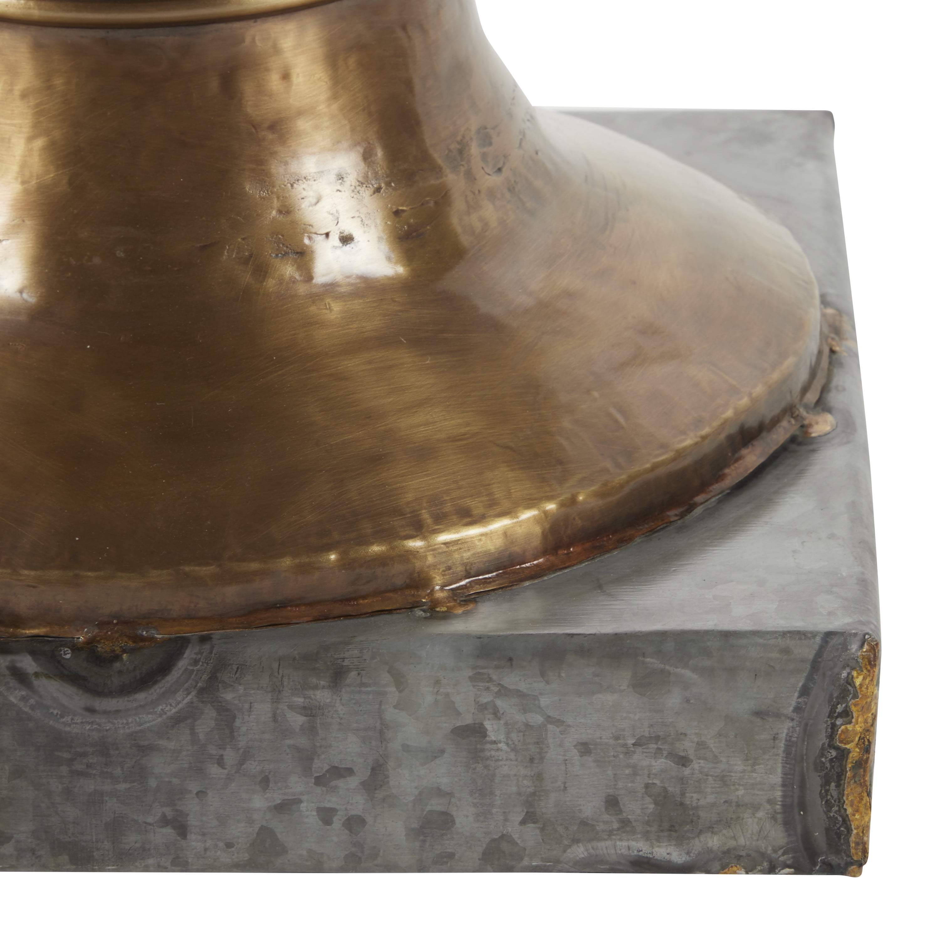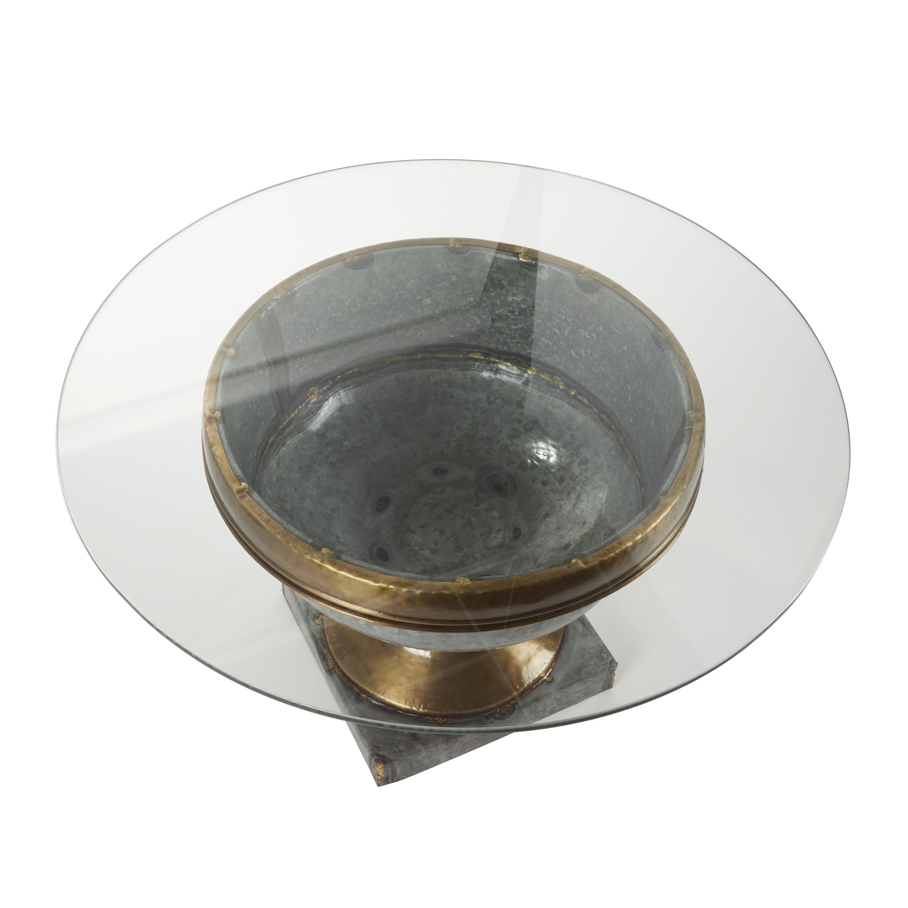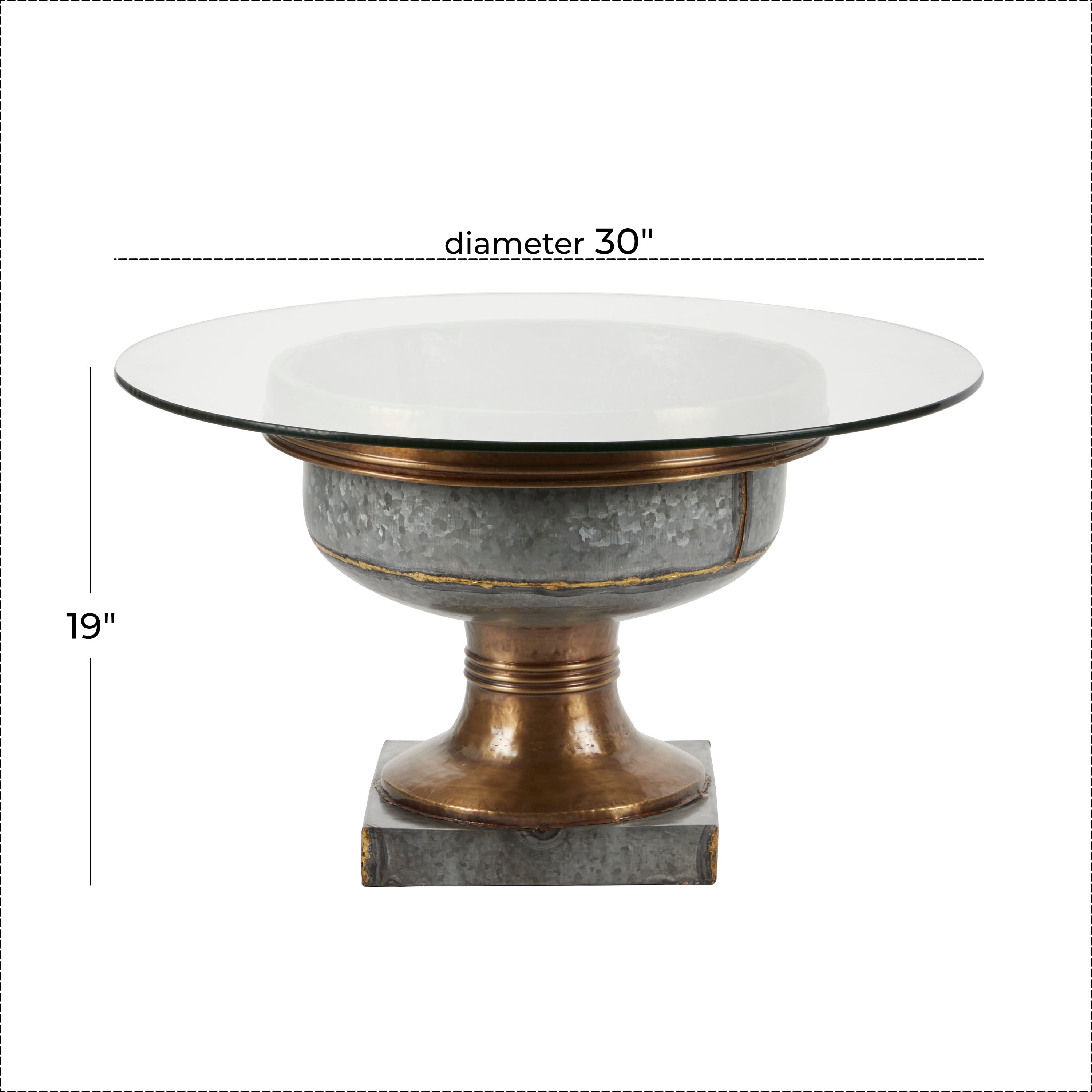 Designed with a farmhouse inspired theme for an inviting and wholesome aesthetic This round glass coffee table is made from metal and glass Galvanized grey exterior with a matte bronze accent and a clear tempered glass This metal coffee table with glass top features a round glass table top designed with deep gold banding and details along its body Mirror coffee table measures 30″ L x 30″W x 19″H and weighs 36 lbs A round coffee table with cup like body structure on a square base stand Wipe clean with a dry cloth Round coffee table features welded metal frame to form cup like structure with securely attached tempered glass top Farmhouse theme DecMode 19″ x 30″ Grey Glass Farmhouse Coffee Table makes a perfect addition to any home