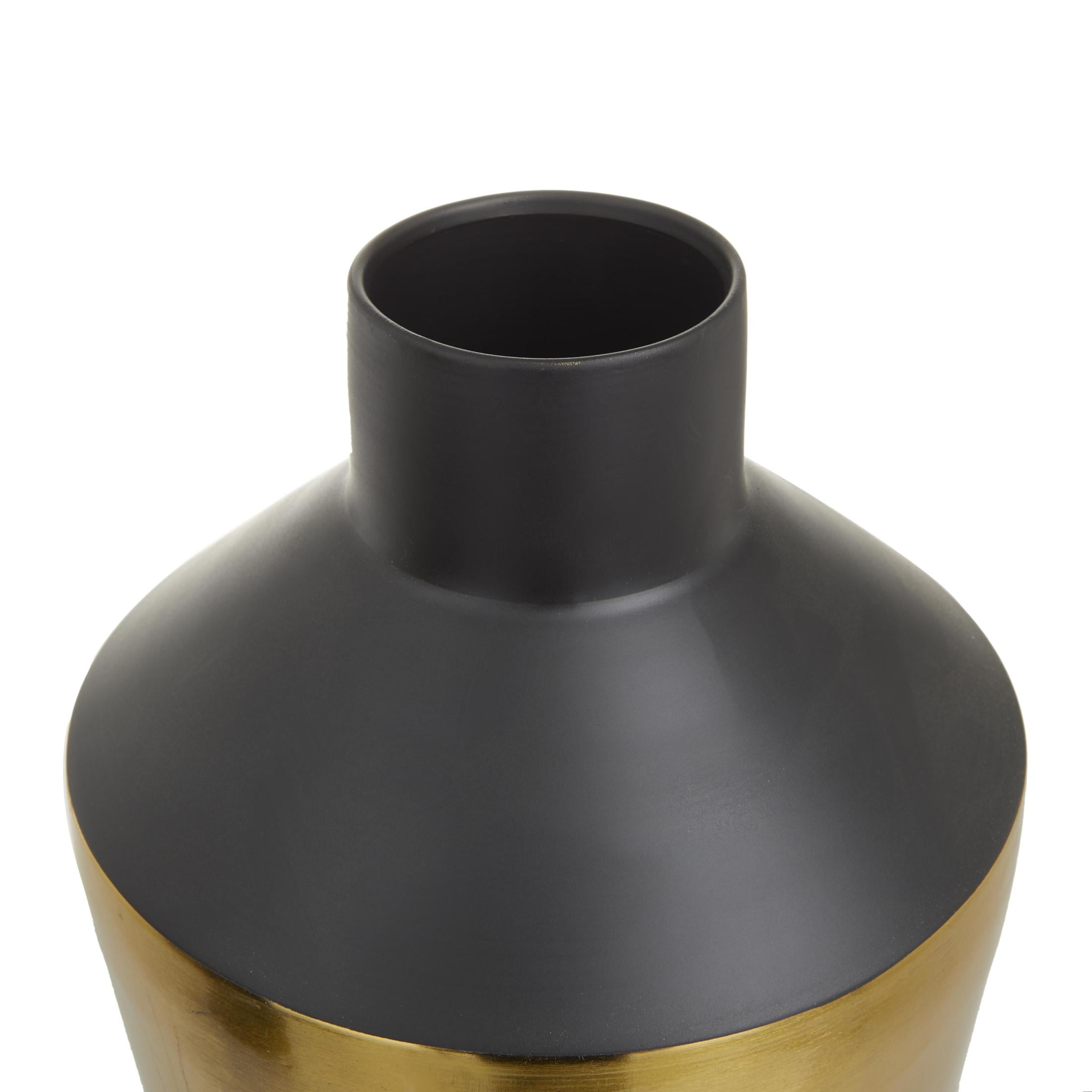 Inspired by sleek elegance and clean lines, a minimalistic design offers effortless luxury with monochromatic tones and bold, angular structures The black decorative vase set is made from high-quality iron The round home decor vases set features a matte black finish complemented by a gold band The iron set of 2 vases includes a gold detail against the matte finish Each black metal vase measures 7.50L x 7.55W x 20.30H , 6.50L x 6.55W x 15.70H inches, and collectively weighs 6.5 lbs The matte black vases for dried flowers boast an elegant round shape with a gold band design that enhances any space Wipe clean with a dry cloth Each piece in the modern set of 2 vases for home decor is welded from iron to ensure longevity Modern style DecMode 20″, 16″H Black Metal Vase with Gold Band, Set of 2 makes a perfect addition to any home