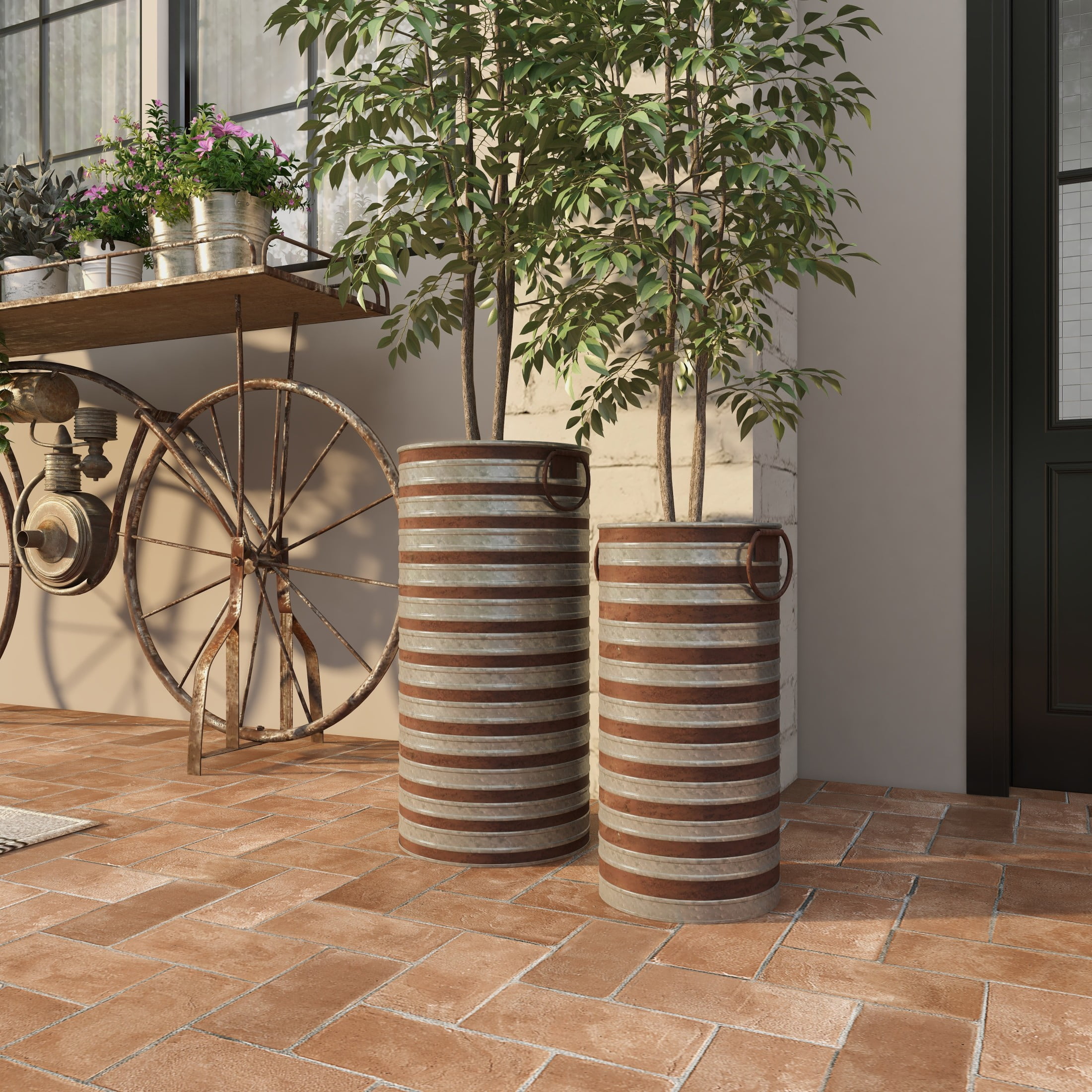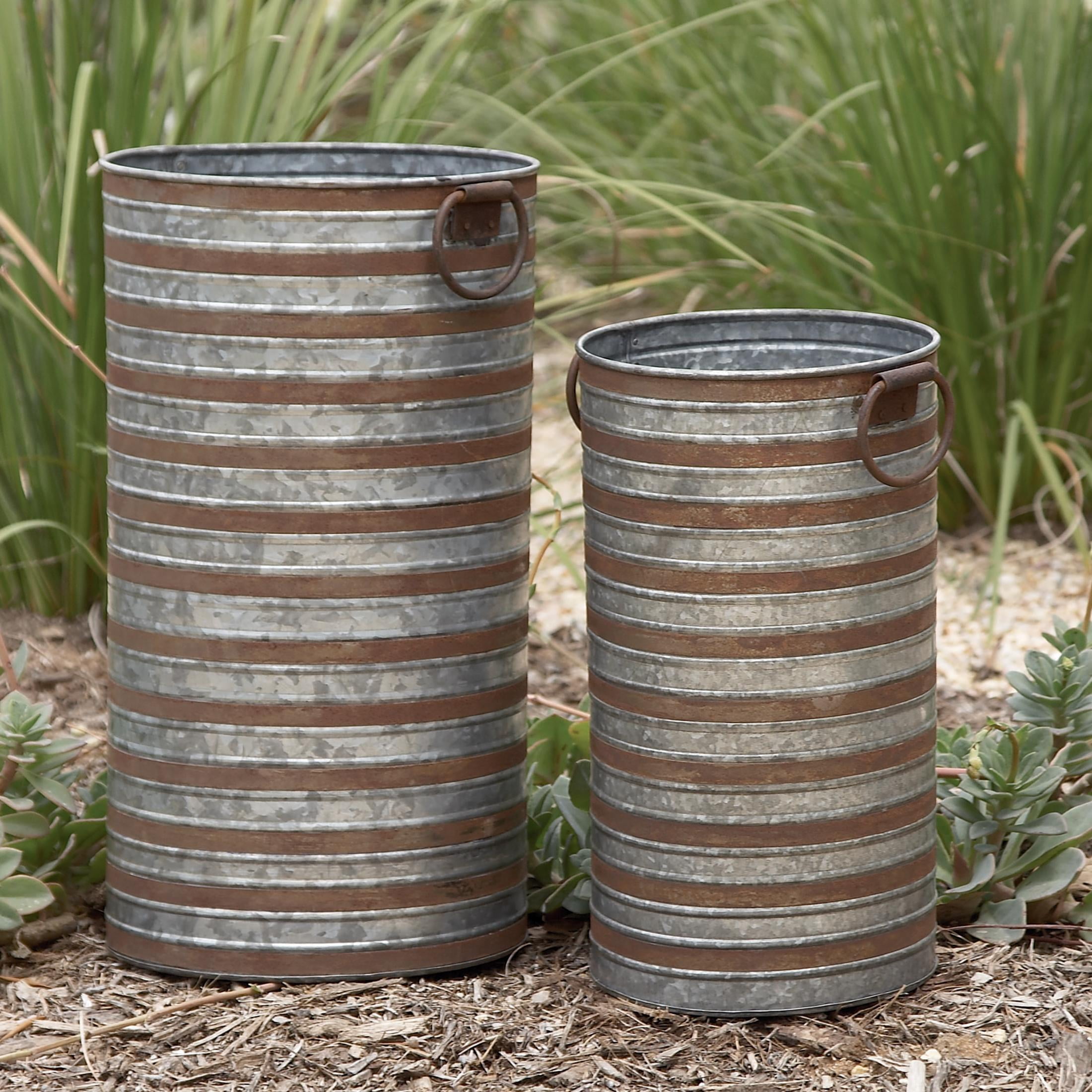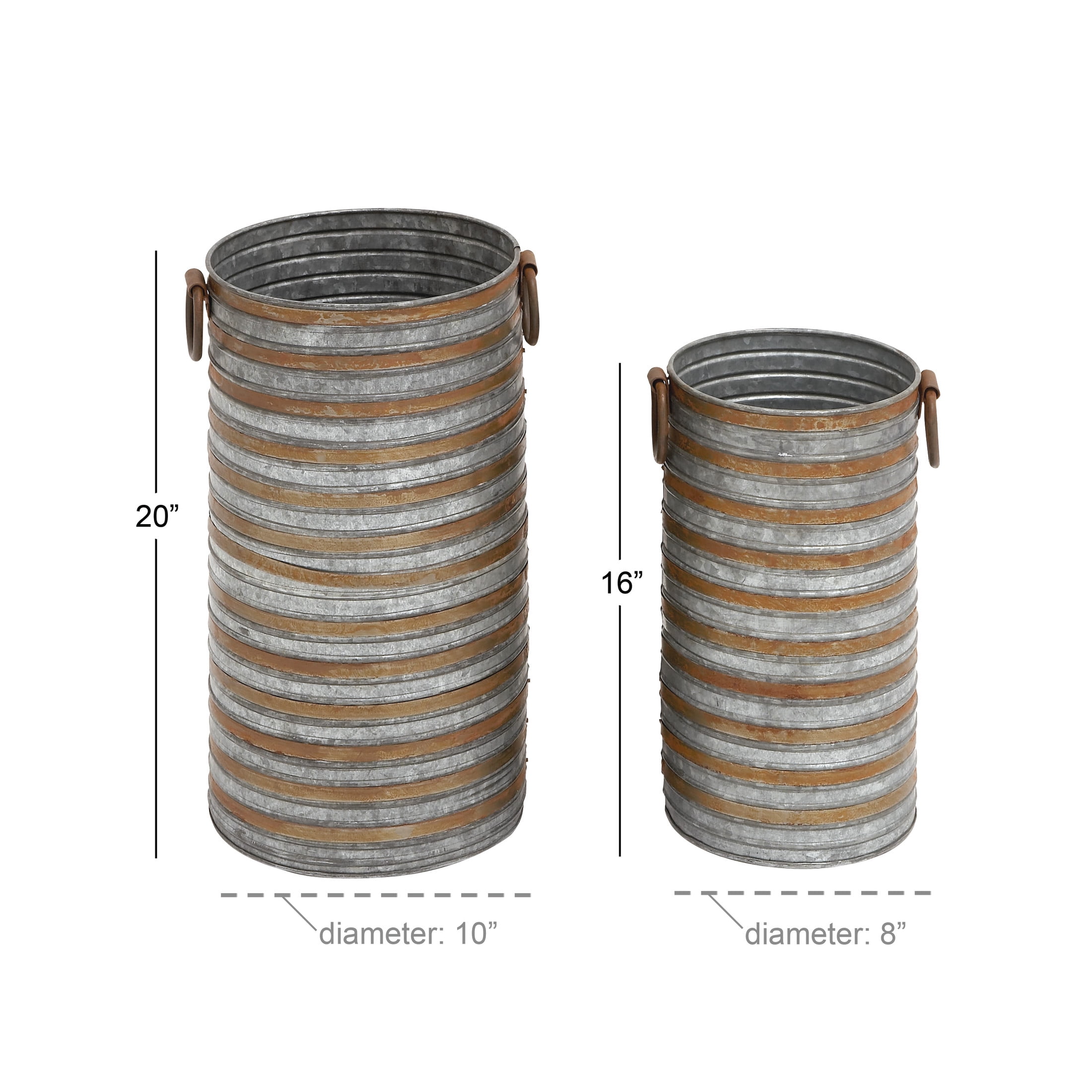 Infuse your home with cozy charm, where weathered textures, rustic finishes, and warm earthy tones create a wholesome atmosphere Crafted from robust metal, this gray indoor outdoor planter set ensures durability and longevity A cylinder plant pot set of 2 that showcases a galvanized gray hue with weathered brown stripes and handles, giving them a rustic charm This metal set of 2 planters feature dynamic striped panels and practical handles, making them easy to move around according to your needs Each gray metal planter measures 10L x 10W x 20H , 8L x 8W x 16H inches, and collectively weighs 7.5 lbs This planter set has tall cylindrical bodies with horizontal ribbing patterns Wipe clean with a dry cloth The metal iron material in this farmhouse set of 2 planters for outdoor plants is meticulously shaped and treated to achieve its distinctive galvanized look Farmhouse style DecMode 20″, 16″H Gray Metal Planter with Handles (2 Count) makes a perfect addition to any home