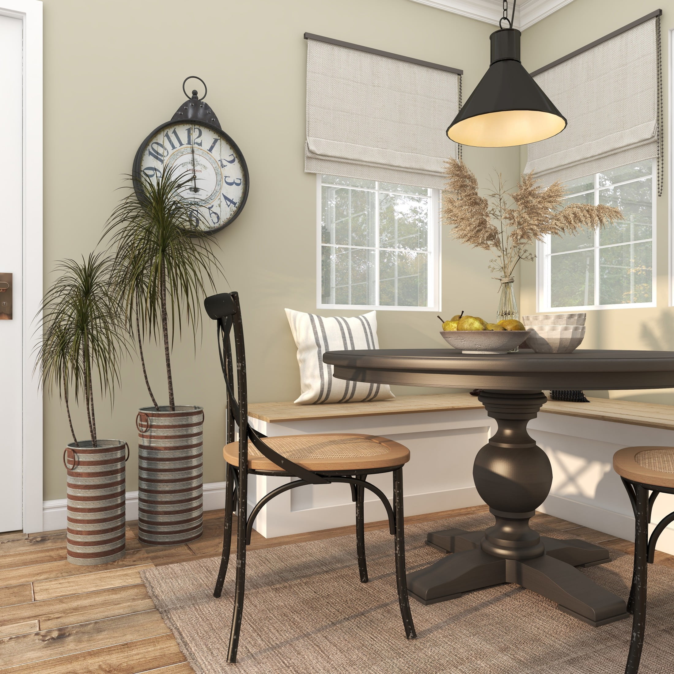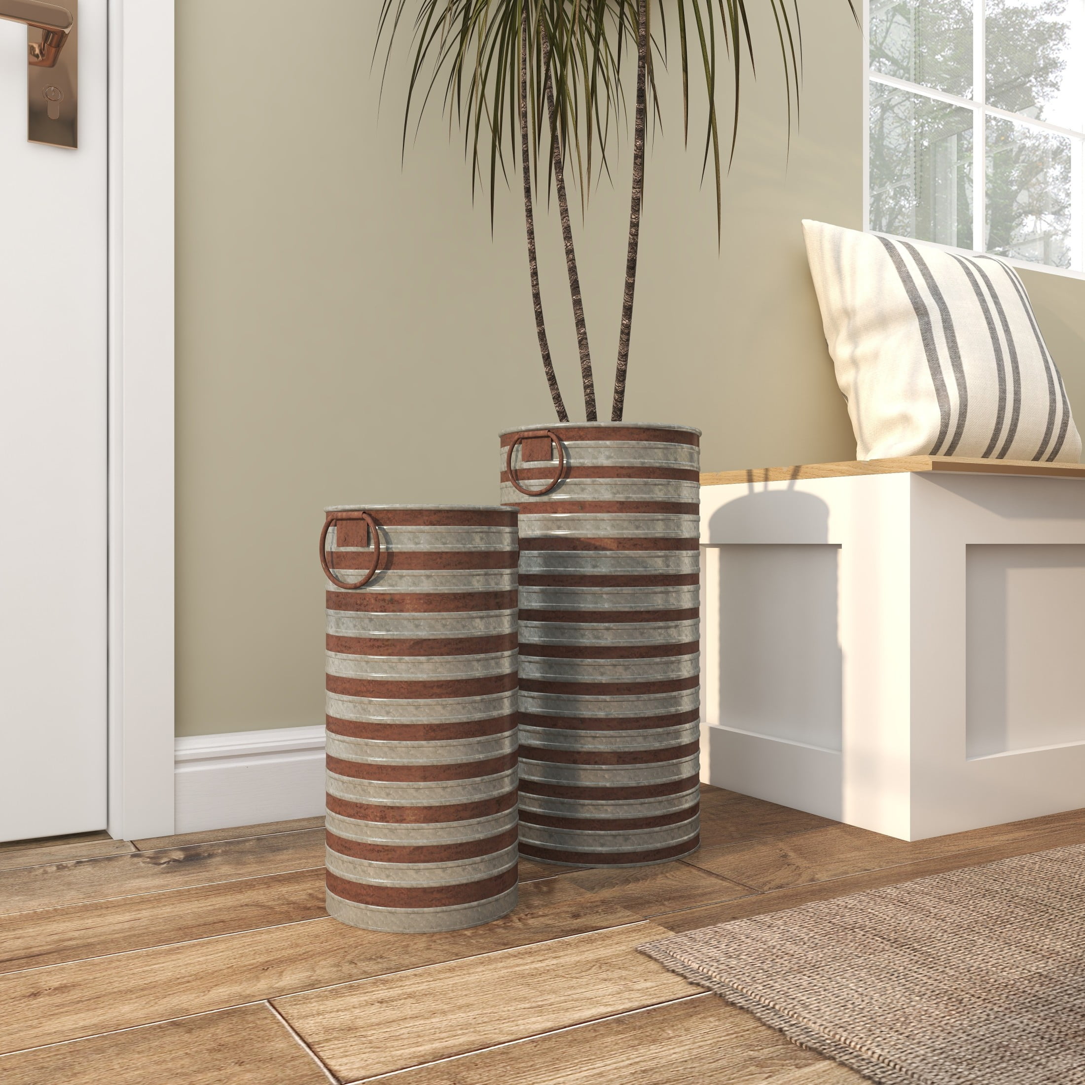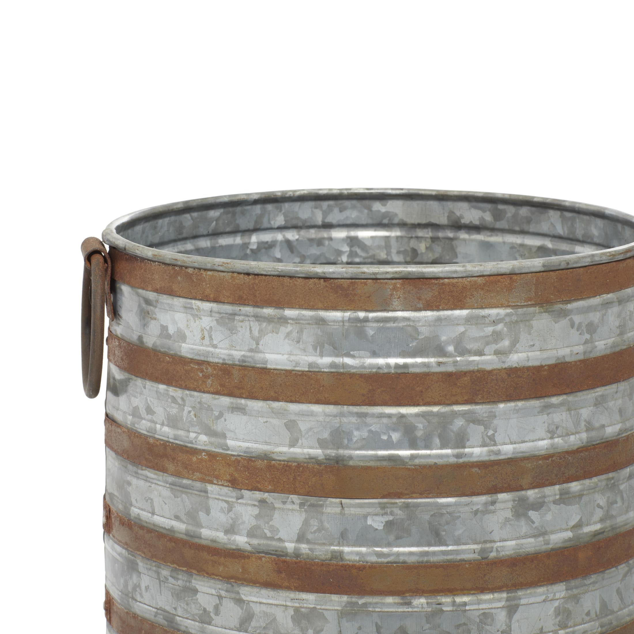 Infuse your home with cozy charm, where weathered textures, rustic finishes, and warm earthy tones create a wholesome atmosphere Crafted from robust metal, this gray indoor outdoor planter set ensures durability and longevity A cylinder plant pot set of 2 that showcases a galvanized gray hue with weathered brown stripes and handles, giving them a rustic charm This metal set of 2 planters feature dynamic striped panels and practical handles, making them easy to move around according to your needs Each gray metal planter measures 10L x 10W x 20H , 8L x 8W x 16H inches, and collectively weighs 7.5 lbs This planter set has tall cylindrical bodies with horizontal ribbing patterns Wipe clean with a dry cloth The metal iron material in this farmhouse set of 2 planters for outdoor plants is meticulously shaped and treated to achieve its distinctive galvanized look Farmhouse style DecMode 20″, 16″H Gray Metal Planter with Handles (2 Count) makes a perfect addition to any home