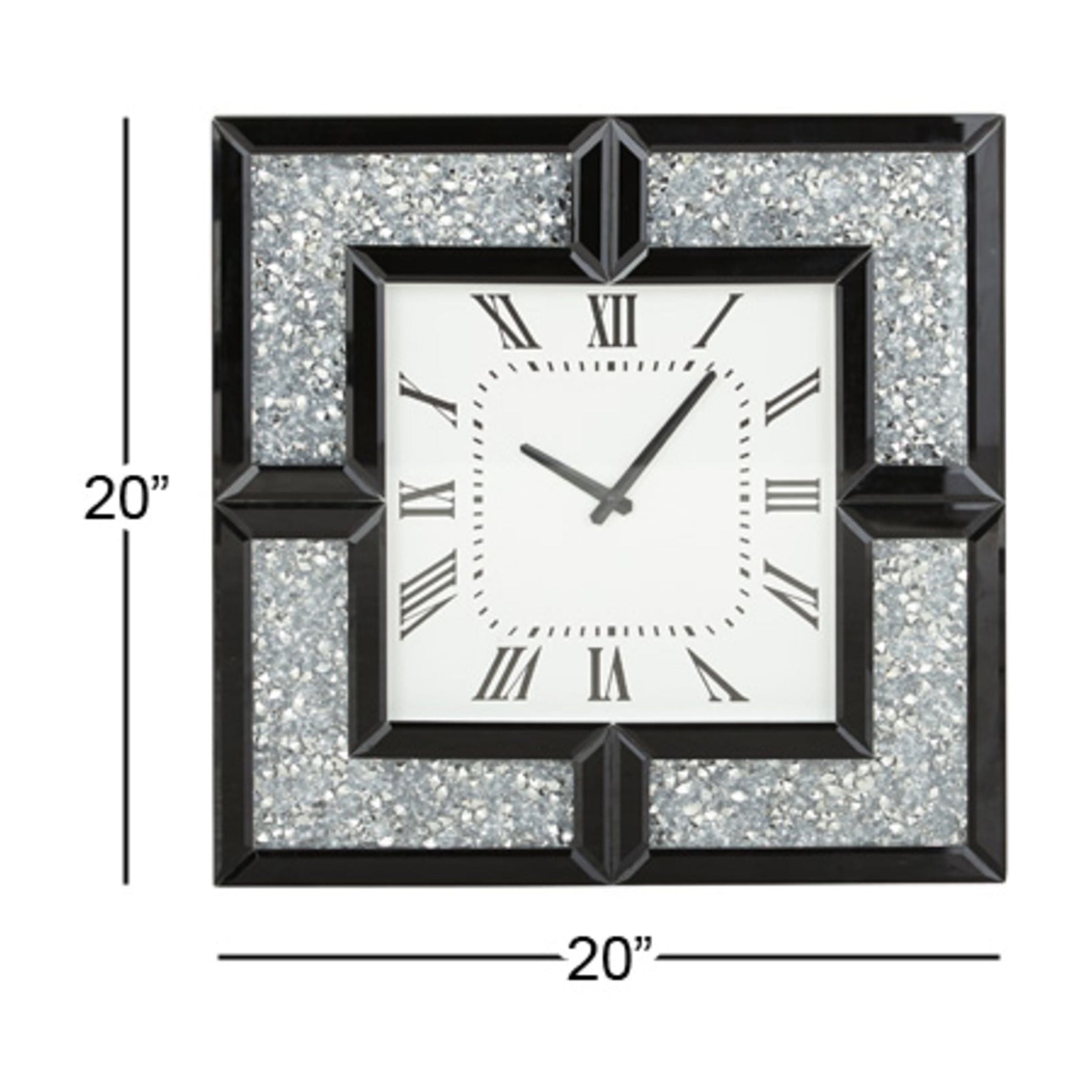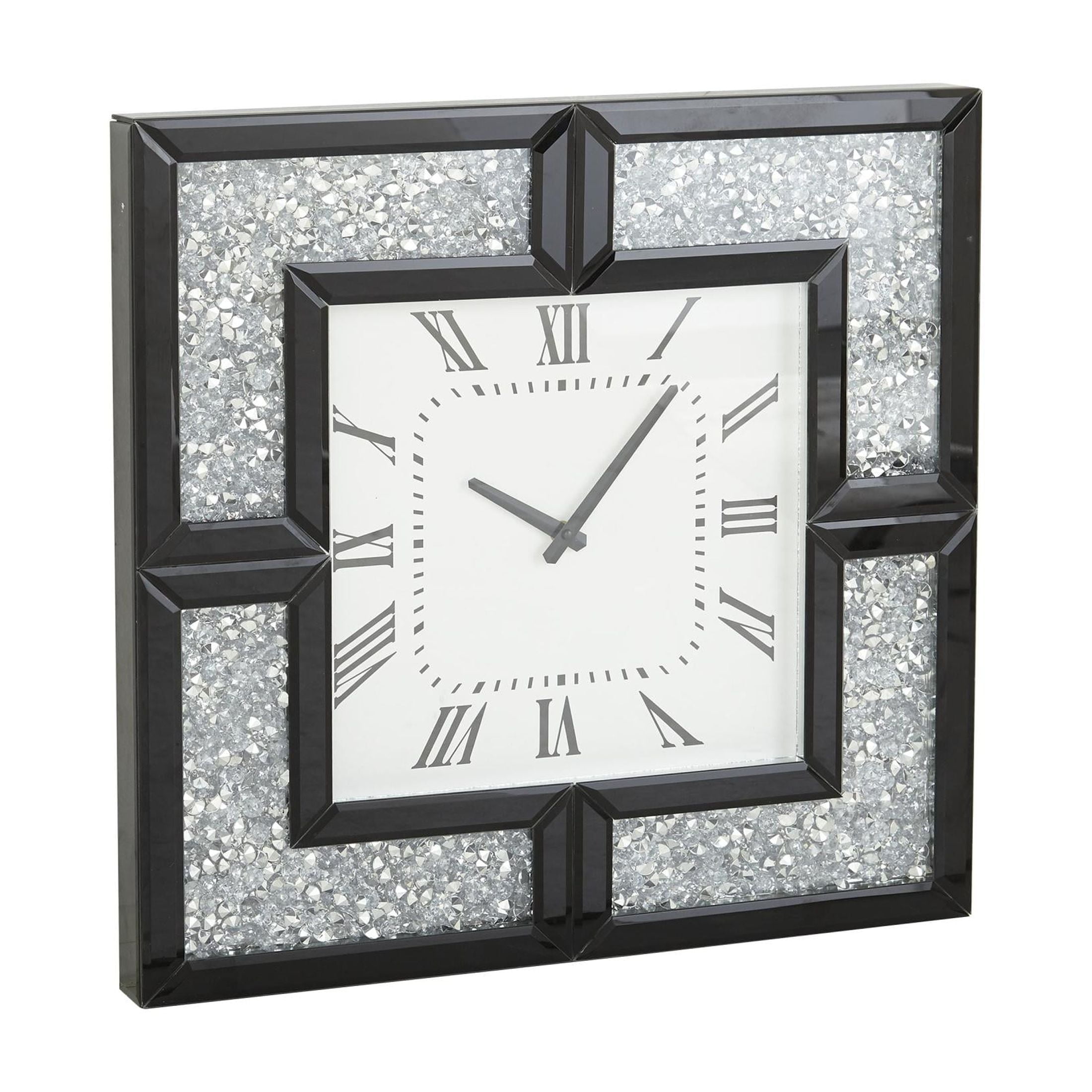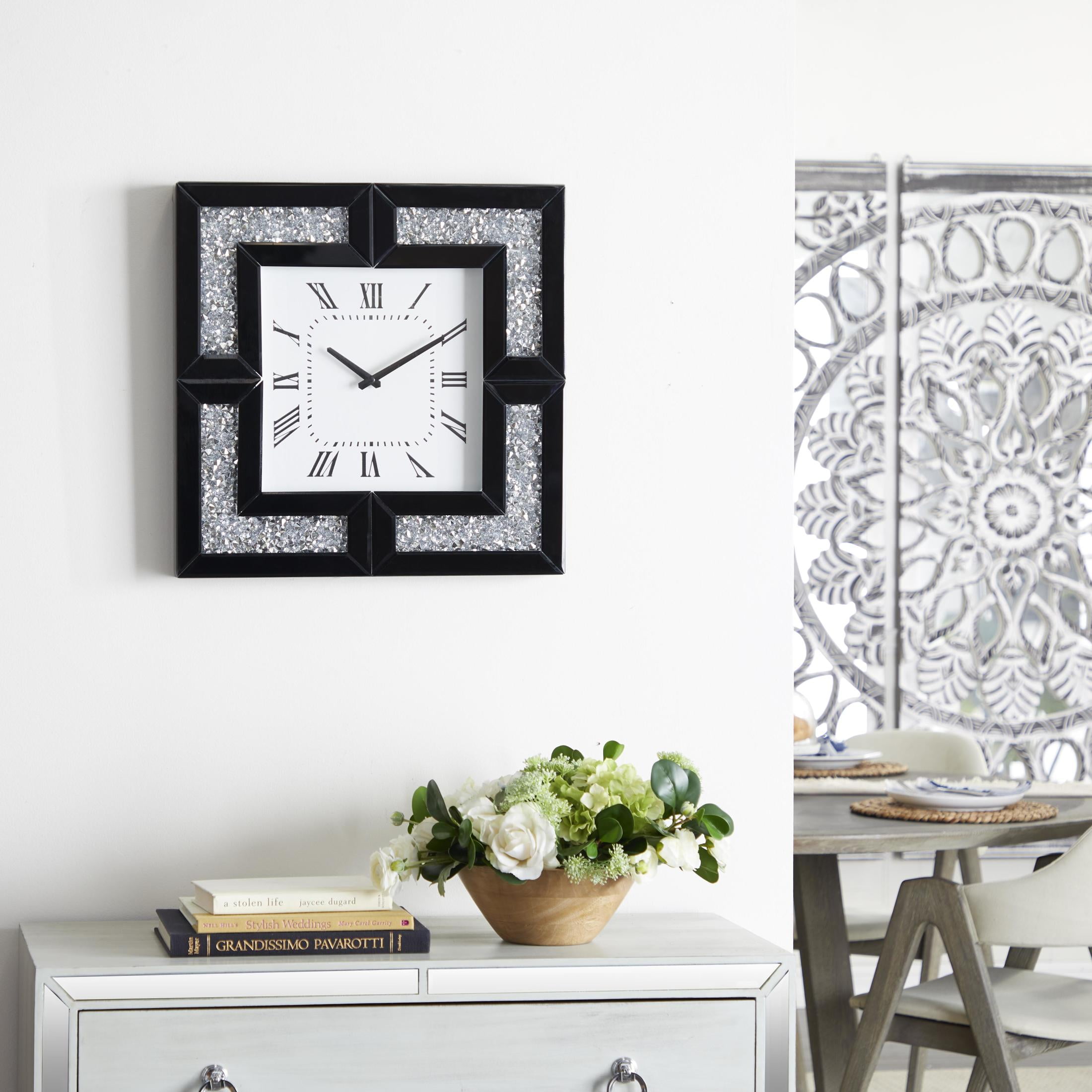 Indulge in the glamorous luxury of plush textures, dazzling details, and sleek finishes to elevate your home and add a sophisticated flair The black decorative wall clock is crafted with mirror and MDF materials This square wall clock for decoration showcases a glossy-finished frame with black and gray colors with a white face This glass wall clock features a square-shaped design with thick framing and elegant floating crystals The black glass wall clock measures 20L x 2W x 20H inches, and weighs 6 lbs The glossy black oversized wall clock boasts round crystal accents that enhance its square frame, while the clock face has Roman numerals Wipe clean with a dry cloth The glam wall clock for kitchen features a carved MDF frame furnished with crystal accents Glam style DecMode 20″ Black Glass Mirrored Wall Clock with Floating Crystals makes a perfect addition to any home