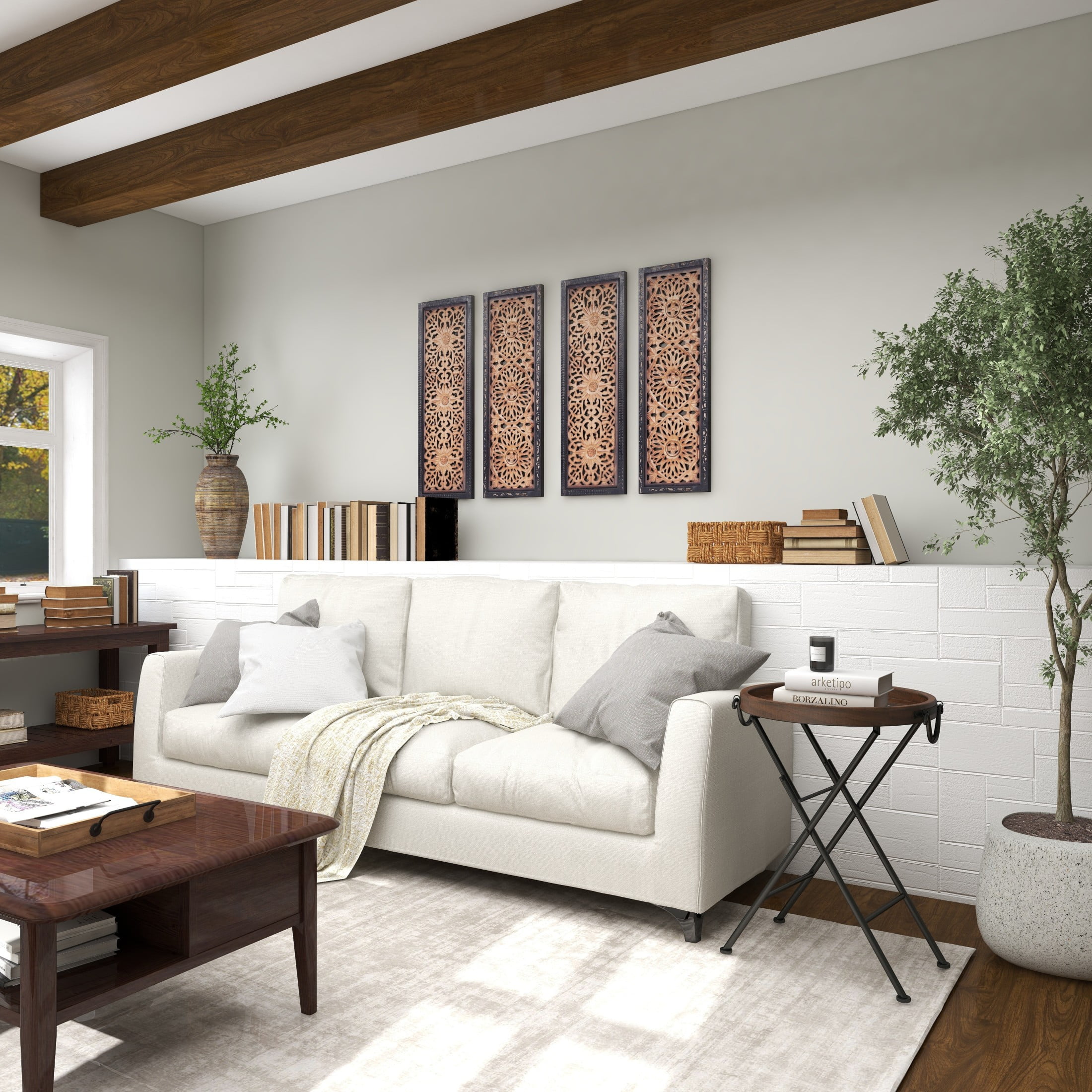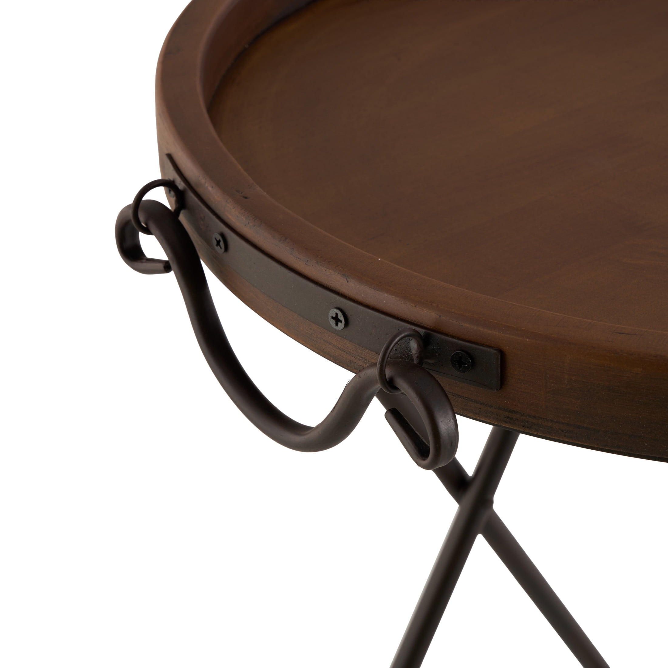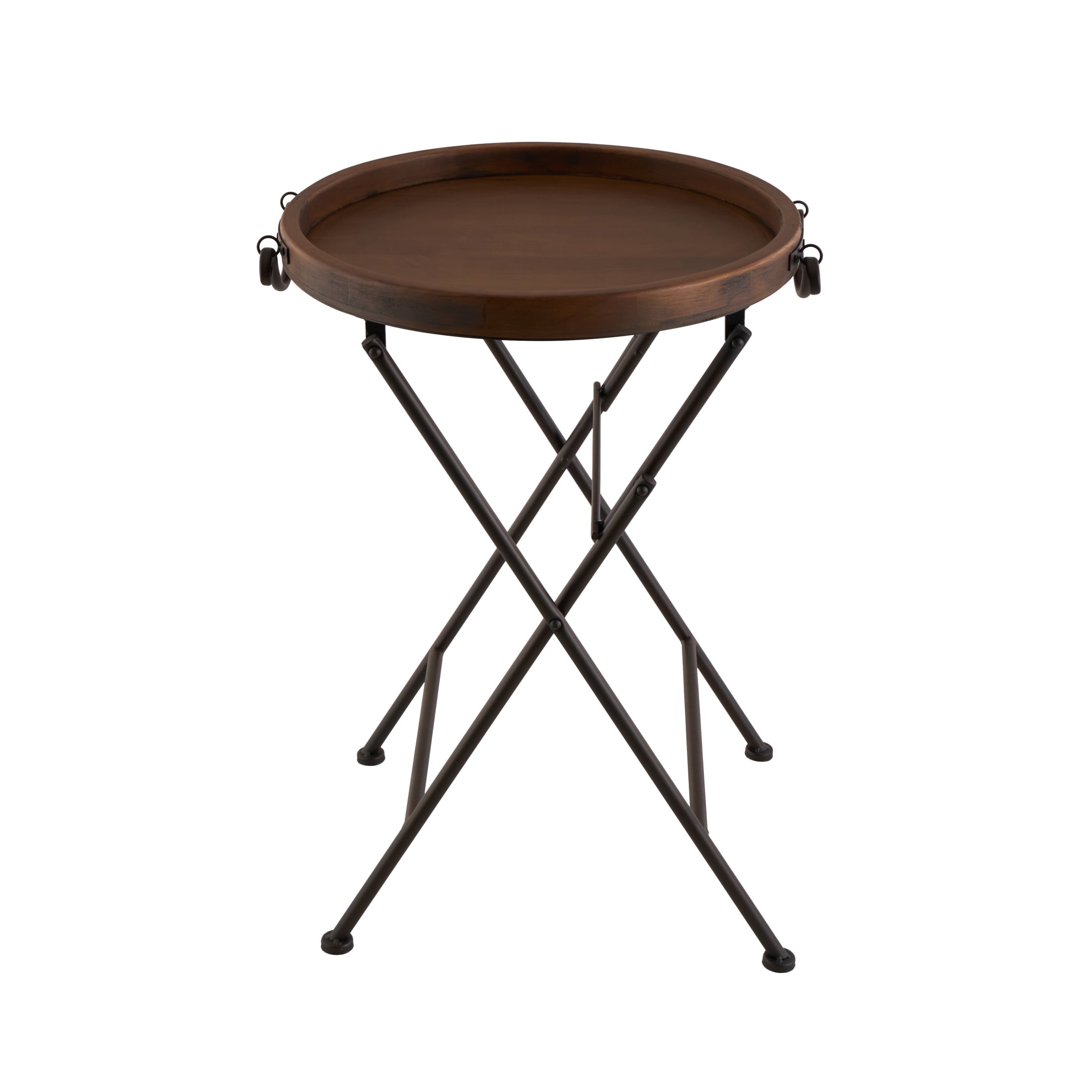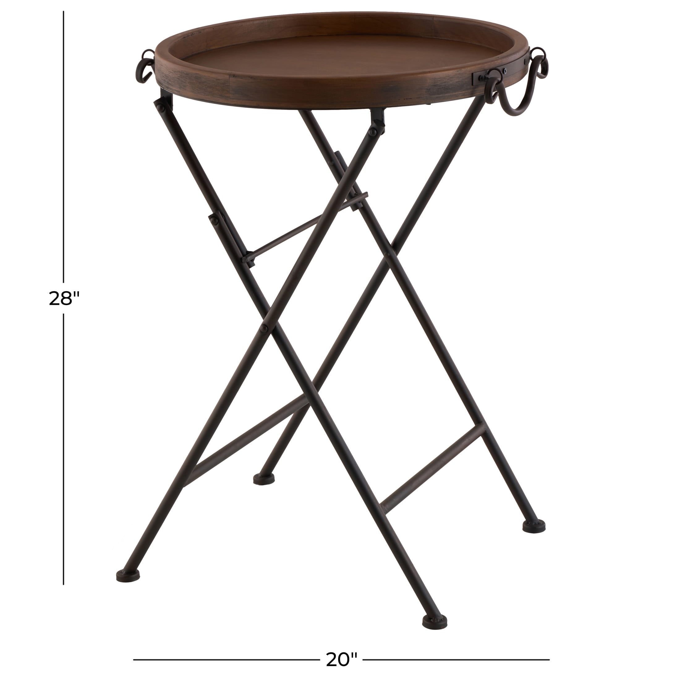 Designed with the essence of timeless sophistication, where rich old-world textures and warm hues come together for a refined classic taste of understated luxury Tray style folding table is made of pine wood and supported by an iron frame Metal and wood tray side table carries a natural dark brown wood finish and black iron frames Round accent table carries an round tray top with curved handles on each side, and supported by an X-shaped frame in a folding style structure for a convenient storage The accent table measures 20L x 20W x 28H inches, and weighs 11.0 lbs This metal and wood tray table features a round surface with raised edges and an “X” figure formed by the metal frame Wipe clean with a dry cloth This tray table is shaped and welded metal and wood materials Traditional style DecMode 20″ x 28″ Black Metal Accent Table with Brown Wood Top, 1-Piece makes a perfect addition to any home