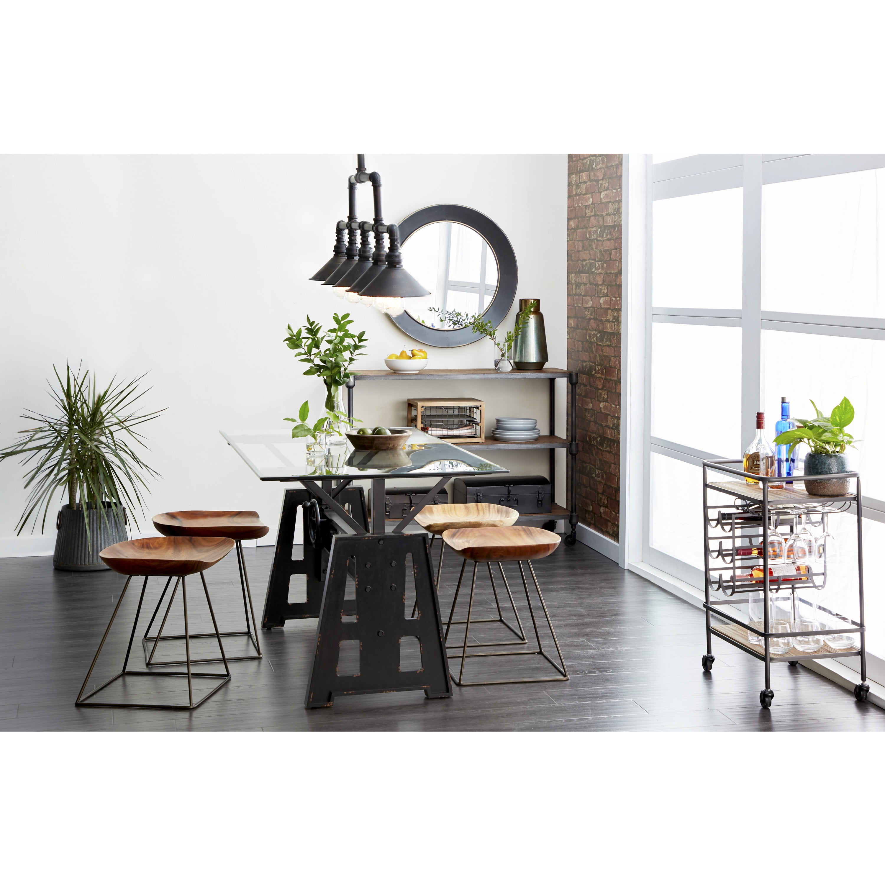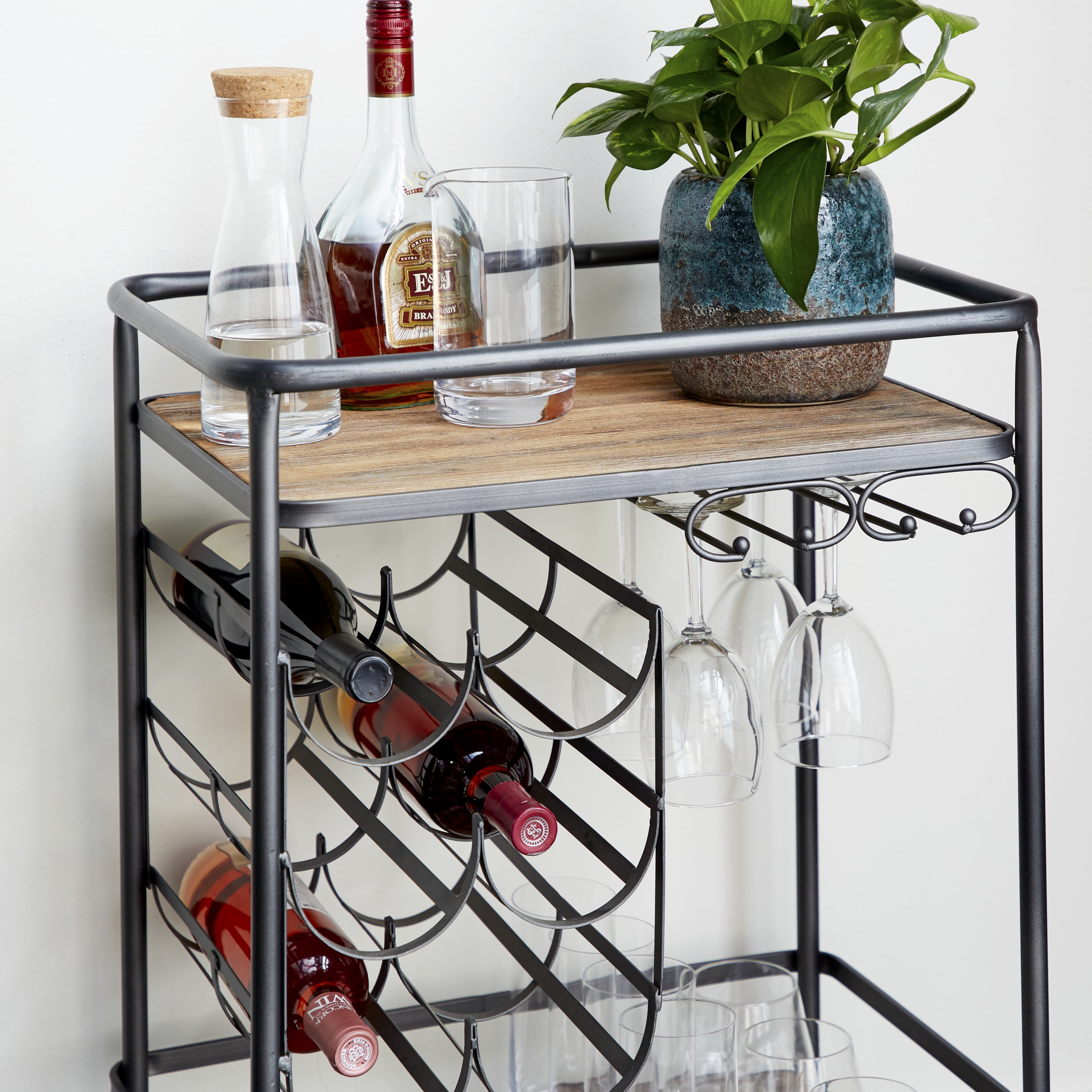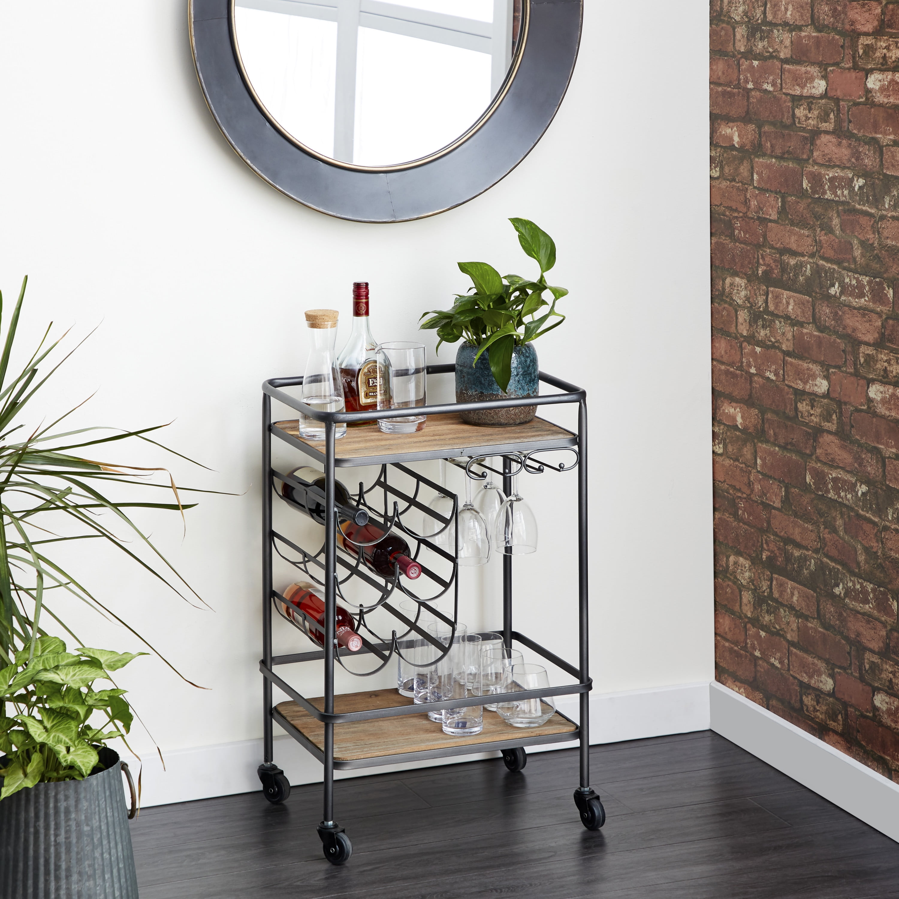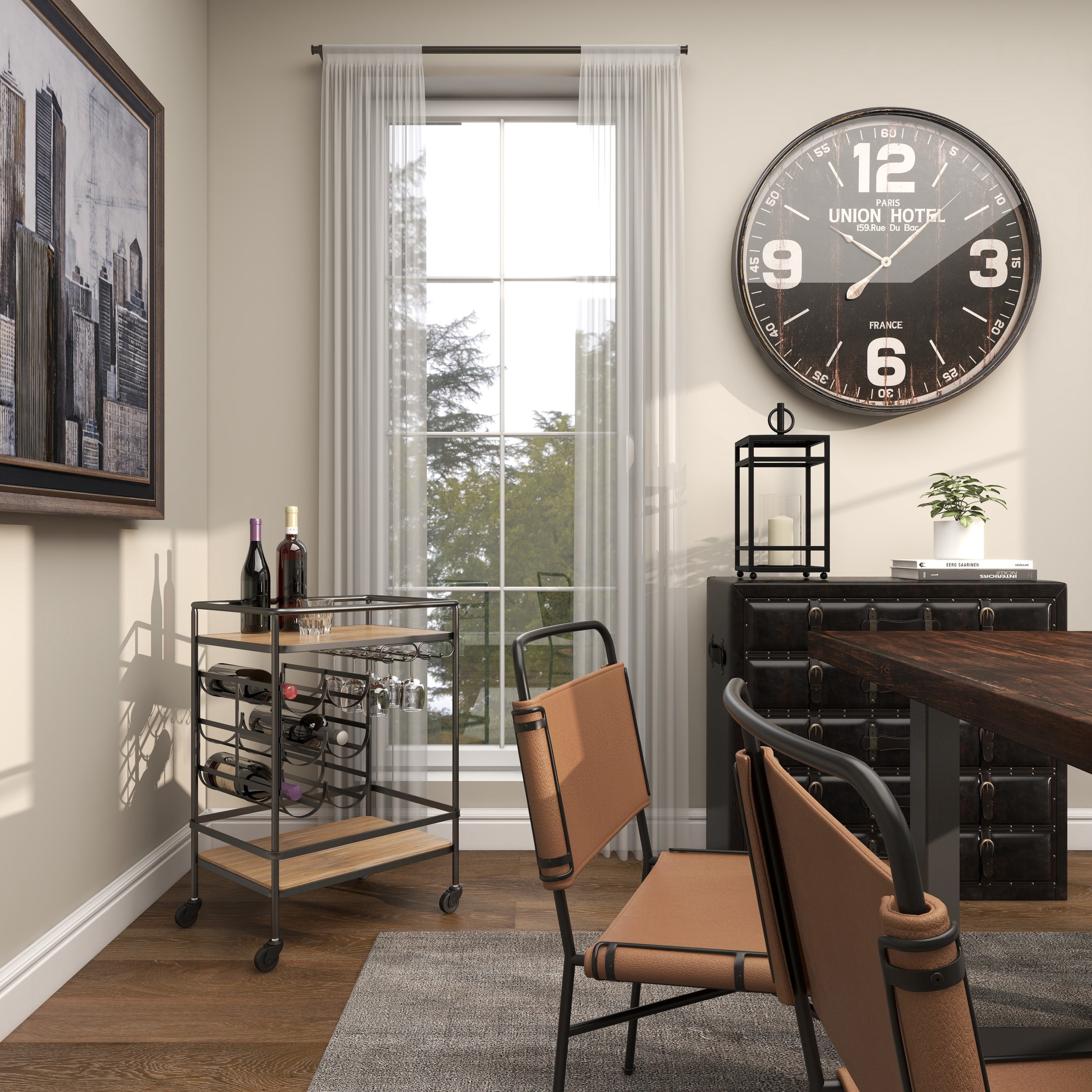 Designed with rugged charm and edgy allure, where metal finishes and raw materials unite to create an urban aesthetic that showcases your artistic expression Black industrial bar cart is crafted with fir wood and iron material Bar cart with wheels highlights a natural wood brown finish with black obsidian frame Rolling push cart is crafted with 2 wooden shelves and features 3 levels of wine racks, and 2 rows of glass holders with smooth caster wheels for optimal mobility The bar cart measures 20.13L x 14.63W x 29.63H inches, and weighs 14 lbs This bar cart on wheels accentuates a rectangular form Wipe clean with a dry cloth Wooden shelves are held by welded metal frame with wine and glass racks and wheels as leg stands Industrial style DecMode 20″ x 30″ Brown Wood Rolling 2 Shelves Bar Cart, 1-Piece makes a perfect addition to any home