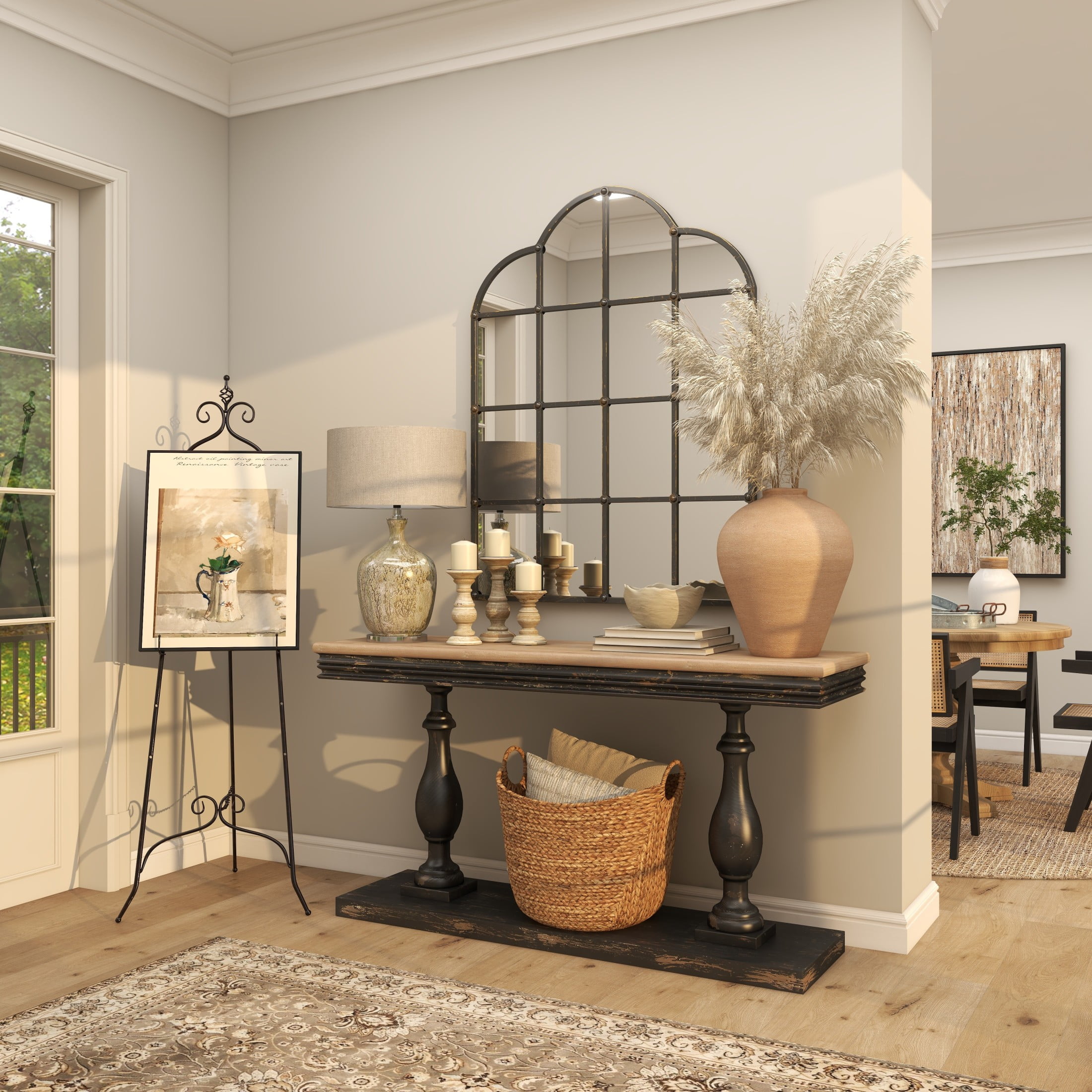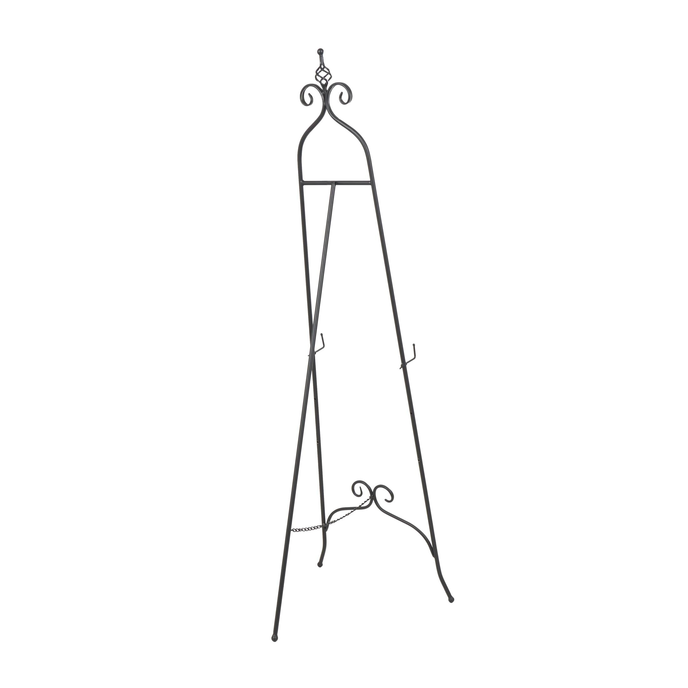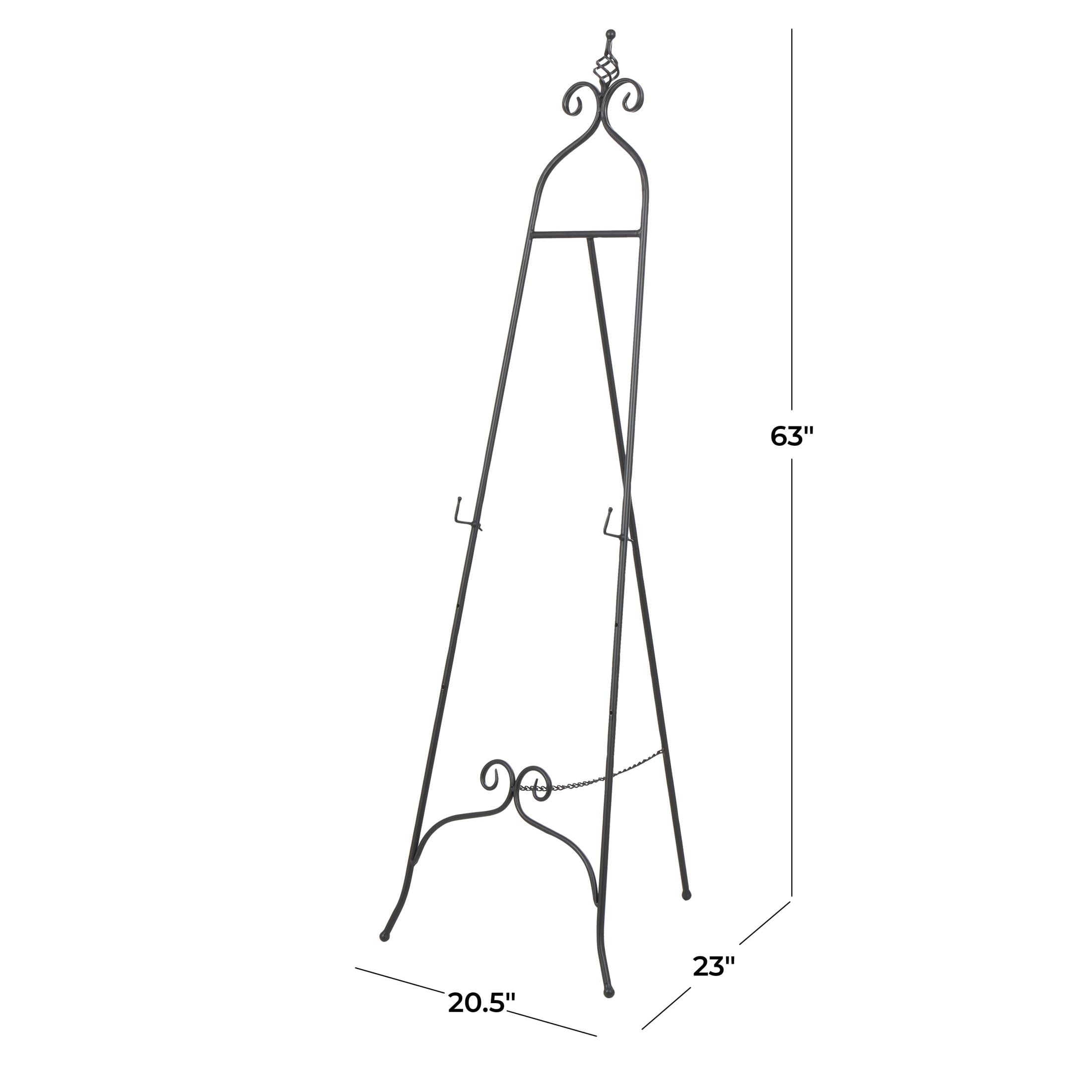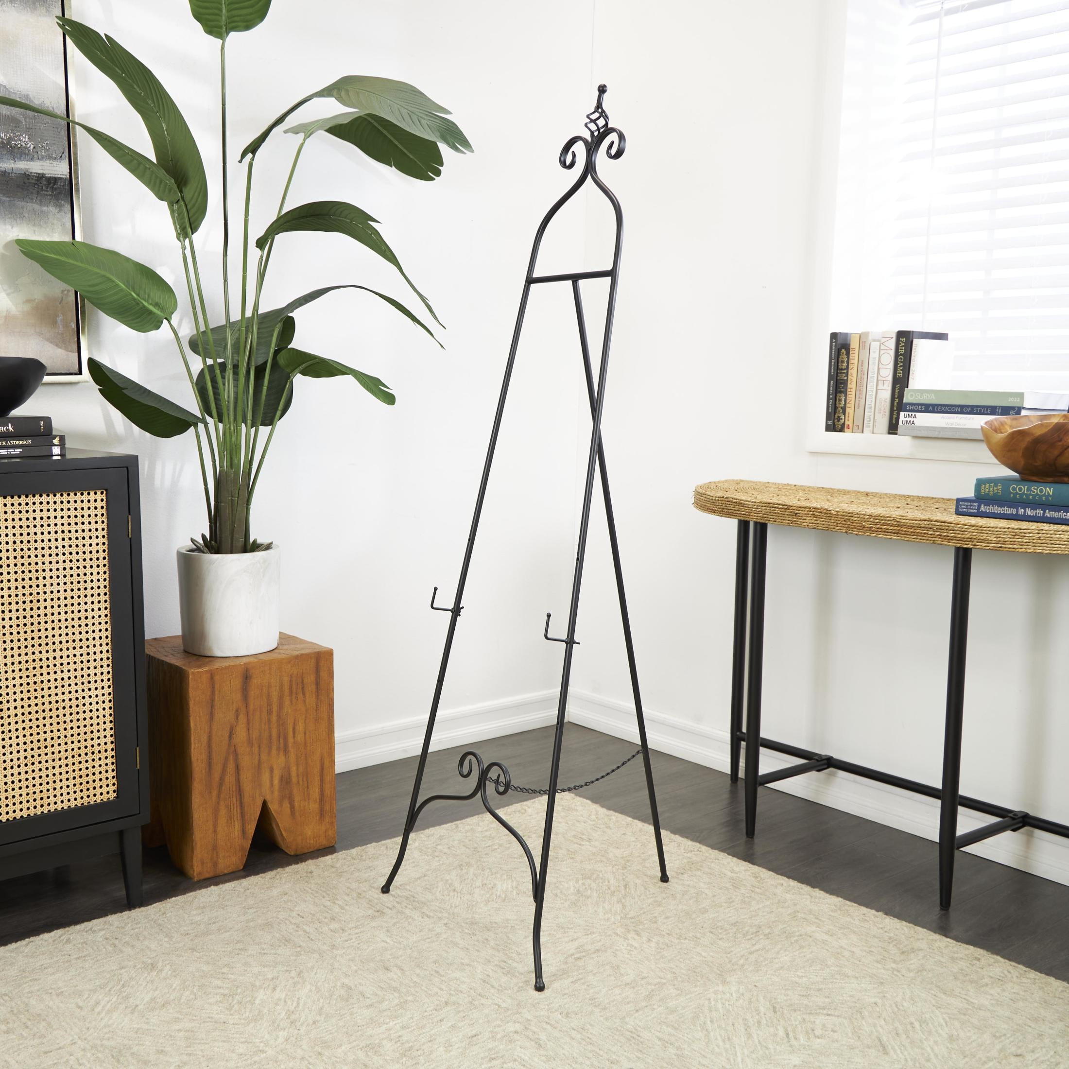 Designed with timeless sophistication, rich old-world textures and warm hues come together for a refined classic taste of luxury The black display easel is crafted from solid metal for a durable and lightweight structure The triangle easel stand features a satin black finish with scroll accents for a sleek and elegant display This metal easel boasts a tripod design for easy storage, with three adjustable height levels for versatile decor displays and elegant scrollwork details The black metal easel measures 20.5L x 23W x 63H inches, and weighs 3.8 lbs The satin black decorative easel features a triangular structure with intricate scrollwork details at both the top and bottom, crowned by a spiral finial Wipe clean with a dry cloth The traditional easel for decoration is crafted from solid metal rods welded together with a retractable chain at the base for support and arms screwed into the openings at the back Traditional style DecMode 21″ x 63″ Black Metal Adjustable 3 Level Scroll Easel with Chain Support, 1-Piece makes a perfect addition to any home
