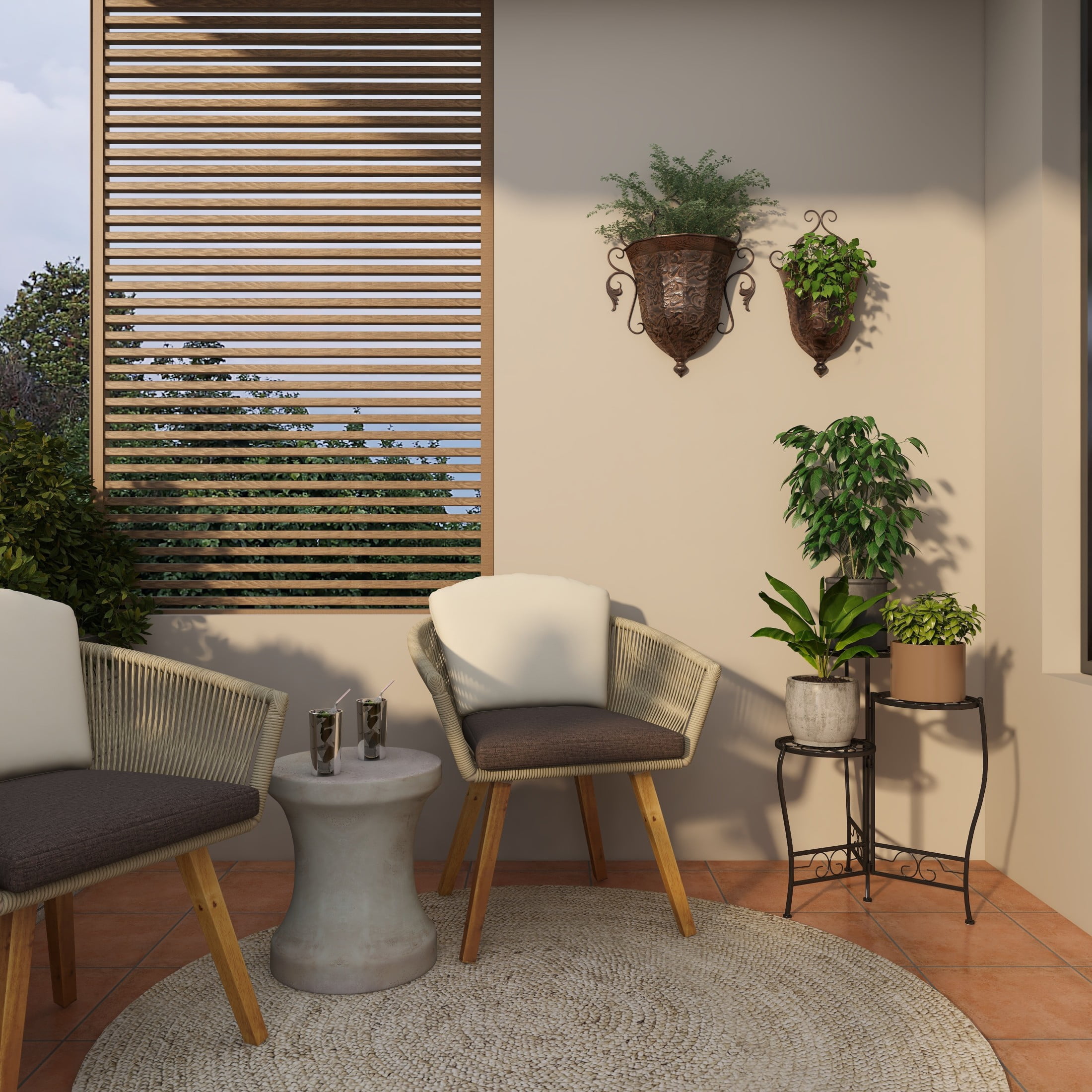 Designed with timeless sophistication, rich old-world textures and warm hues come together for a refined classic taste of luxury Brown indoor outdoor wall planter set is crafted from durable iron, ensuring longevity and resistance to the elements Bell hanging plant holder set features a weathered brown finish, providing a traditional and rustic charm The unique features of this set of 2 metal hanging planters include its bell shape and intricate scrollwork, making it stand out in any home space Each brown metal wall planter measures 11L x 5W x 18H , 16L x 6W x 22H inches, and collectively weighs 3.43 lbs Weathered brown hanging pot for plants is bell shaped with a scroll pattern, offering an aesthetic appeal that complements their practical function Wipe clean with a dry cloth Every detail of this rustic set of 2 hanging plant pots has been meticulously welded and shaped with iron Traditional style DecMode 22″, 18″H Bell Brown Metal Hanging Vintage Scroll Wall Planter with Vine Accents (2 Count) makes a perfect addition to any home