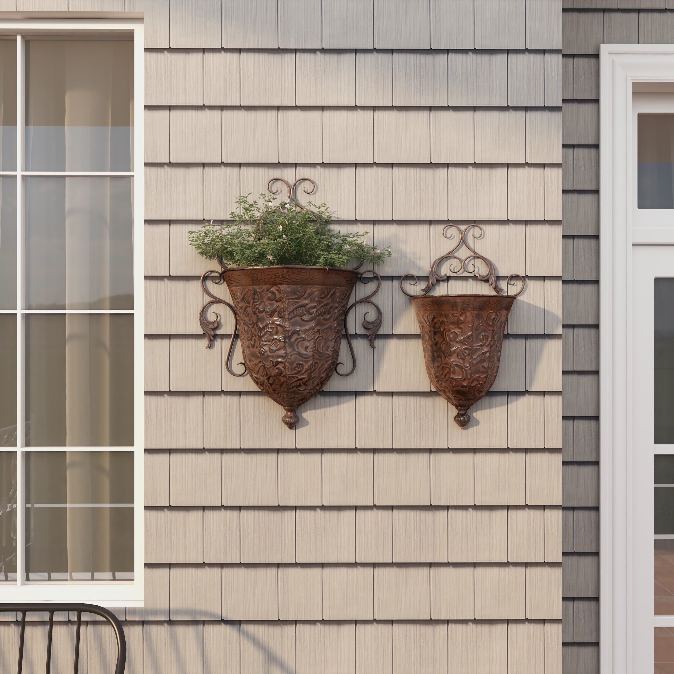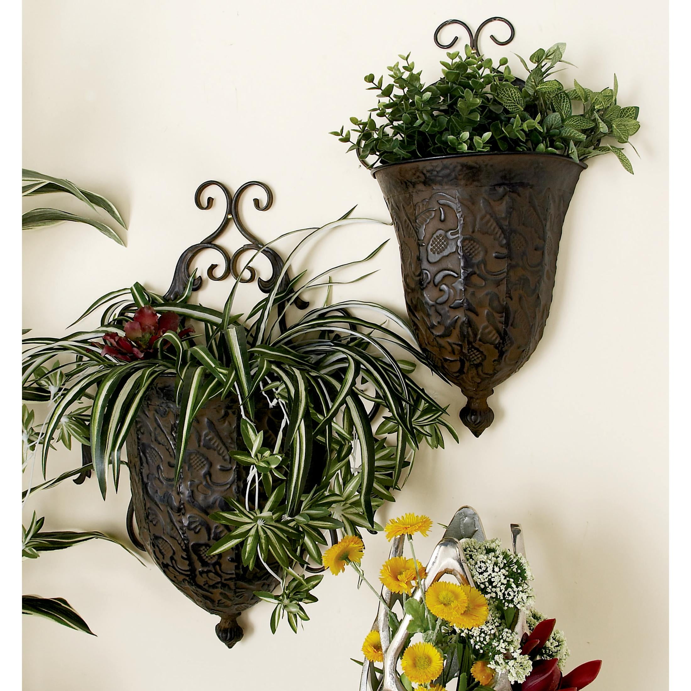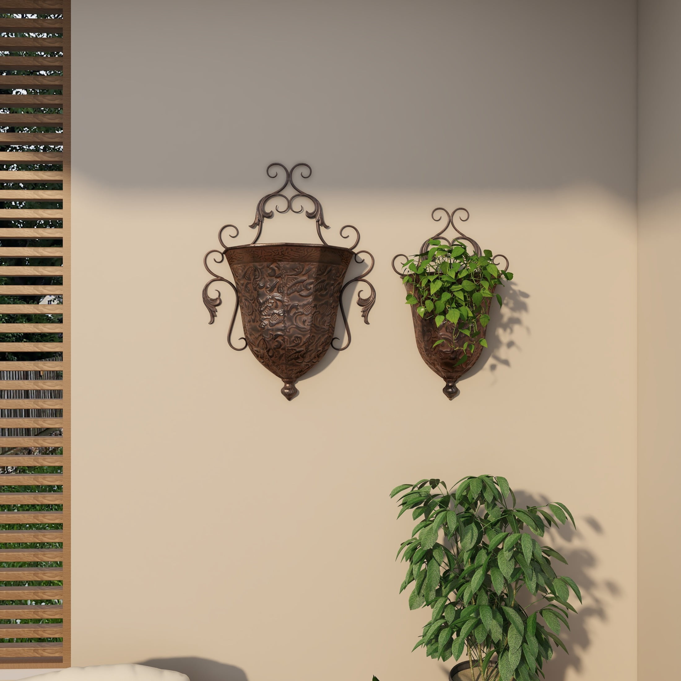 DecMode Brown Metal Scroll Hanging Vintage Indoor Outdoor Wall Planter with Vine Accents, Set of 2 22″, 18″H