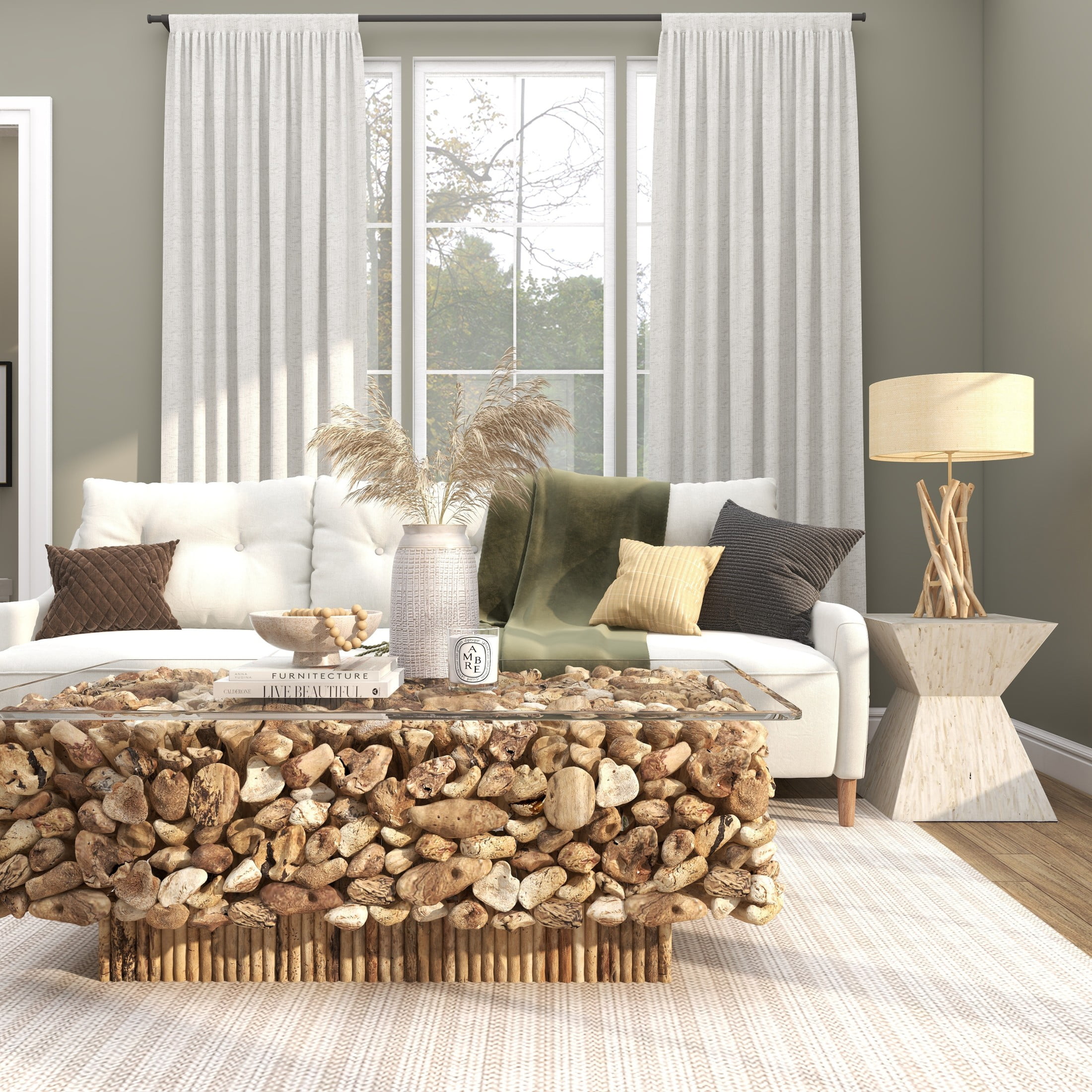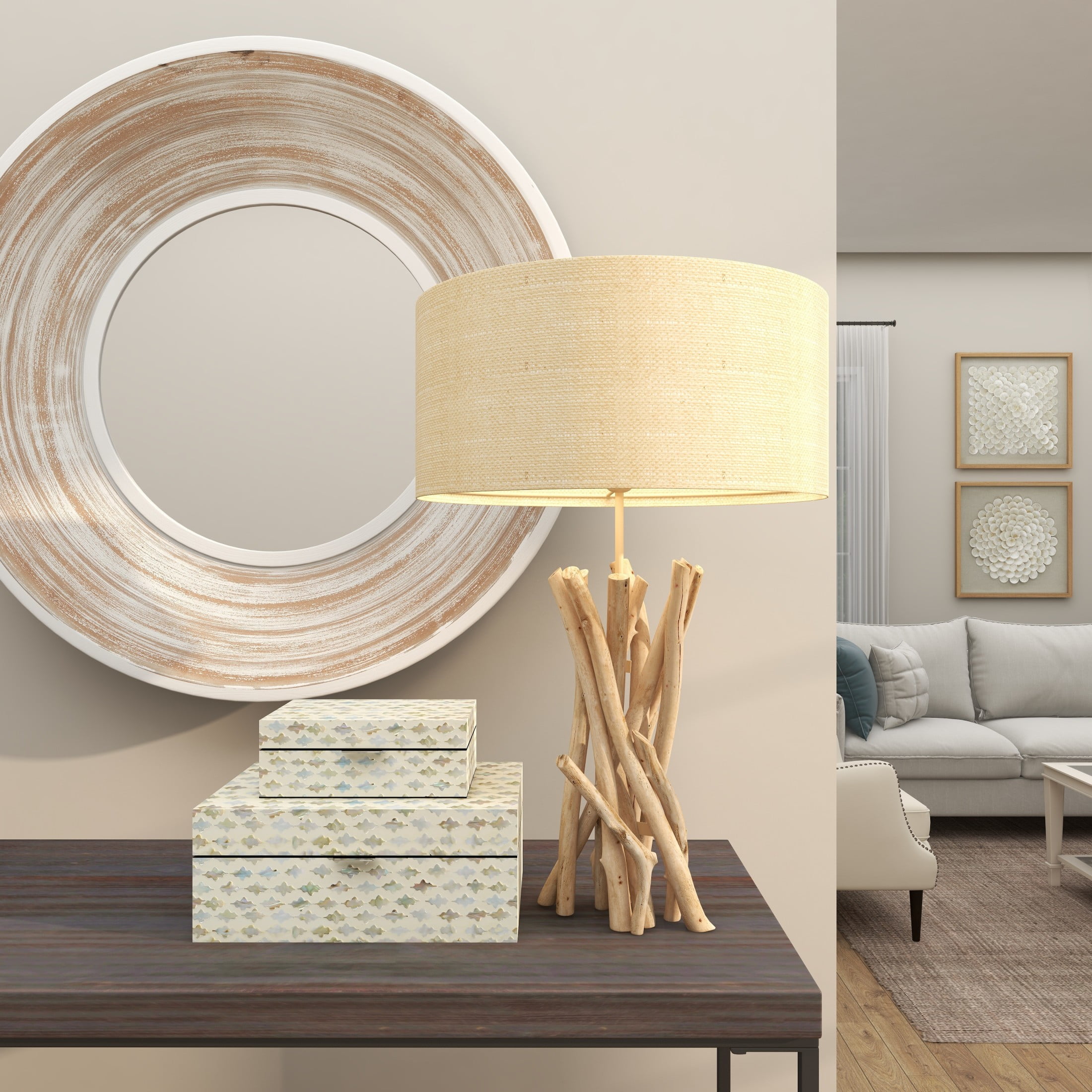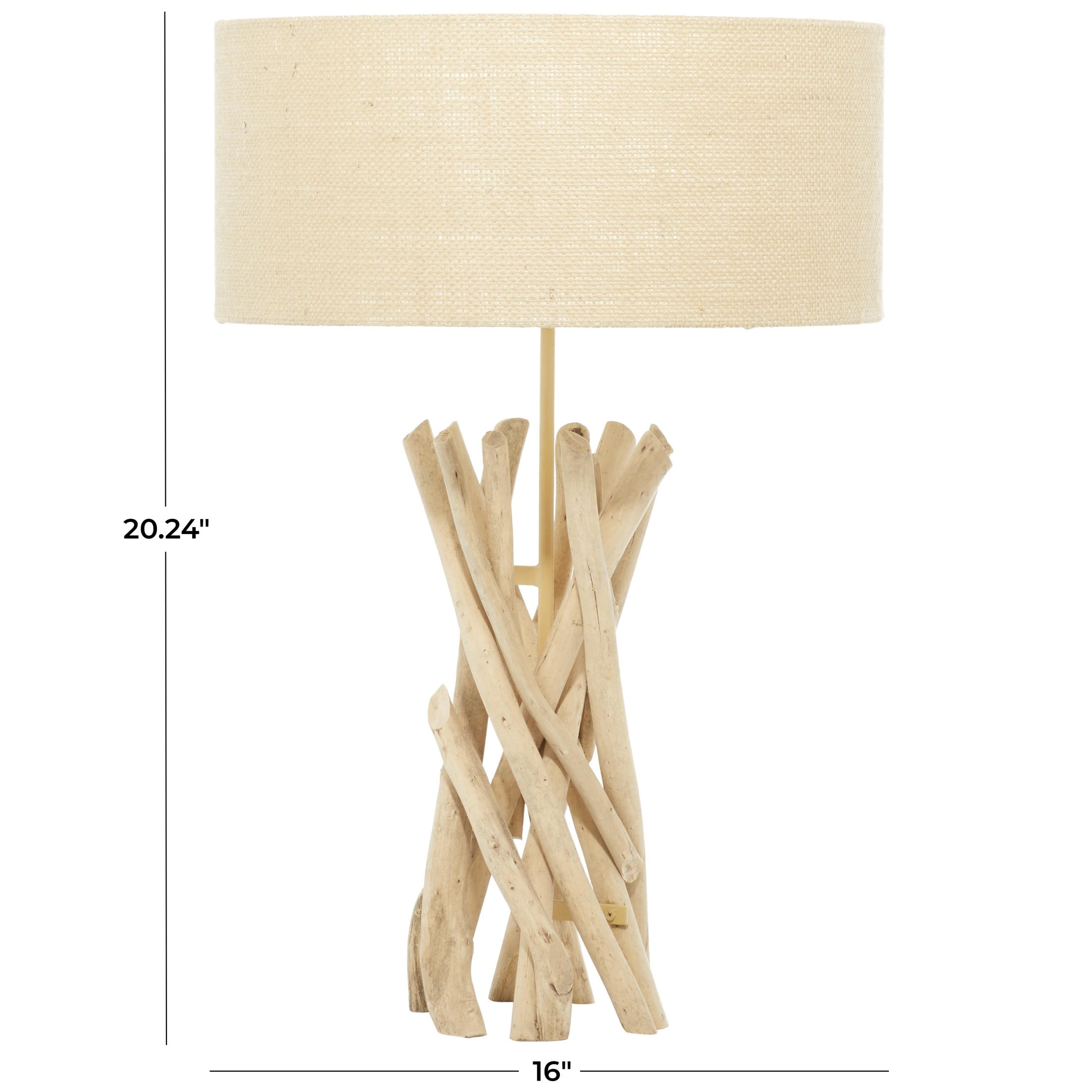 Designed with rugged beauty and an earthy charm, where natural simplicity, warmth, and organic materials create a wholesome atmosphere Made of wood, metal, cloth, and plastic, the light brown room table lamp showcases durability and lasting craftsmanship The cylinder table lamp for living room sports a light brown wood finish and a beige shade with an oiled texture The driftwood table lamp is equipped with a hardback drum shade and features a slender post along with a base inspired by natural branches The light brown driftwood table lamp measures 16L x 16W x 24.20H inches, and weighs 2.86 lbs The oiled light brown accent lamp for table features a drum-shaped shade paired with an exceptional wood-inspired body that forms a cylinder Wipe clean with a dry cloth The rustic living room table lamp is crafted with an intricate arrangement of driftwood branches forming its body, and topped off with a linen shade Rustic style DecMode 24″ Handmade Light Brown Table Lamp with Cream Fabric Shade makes a perfect addition to any home