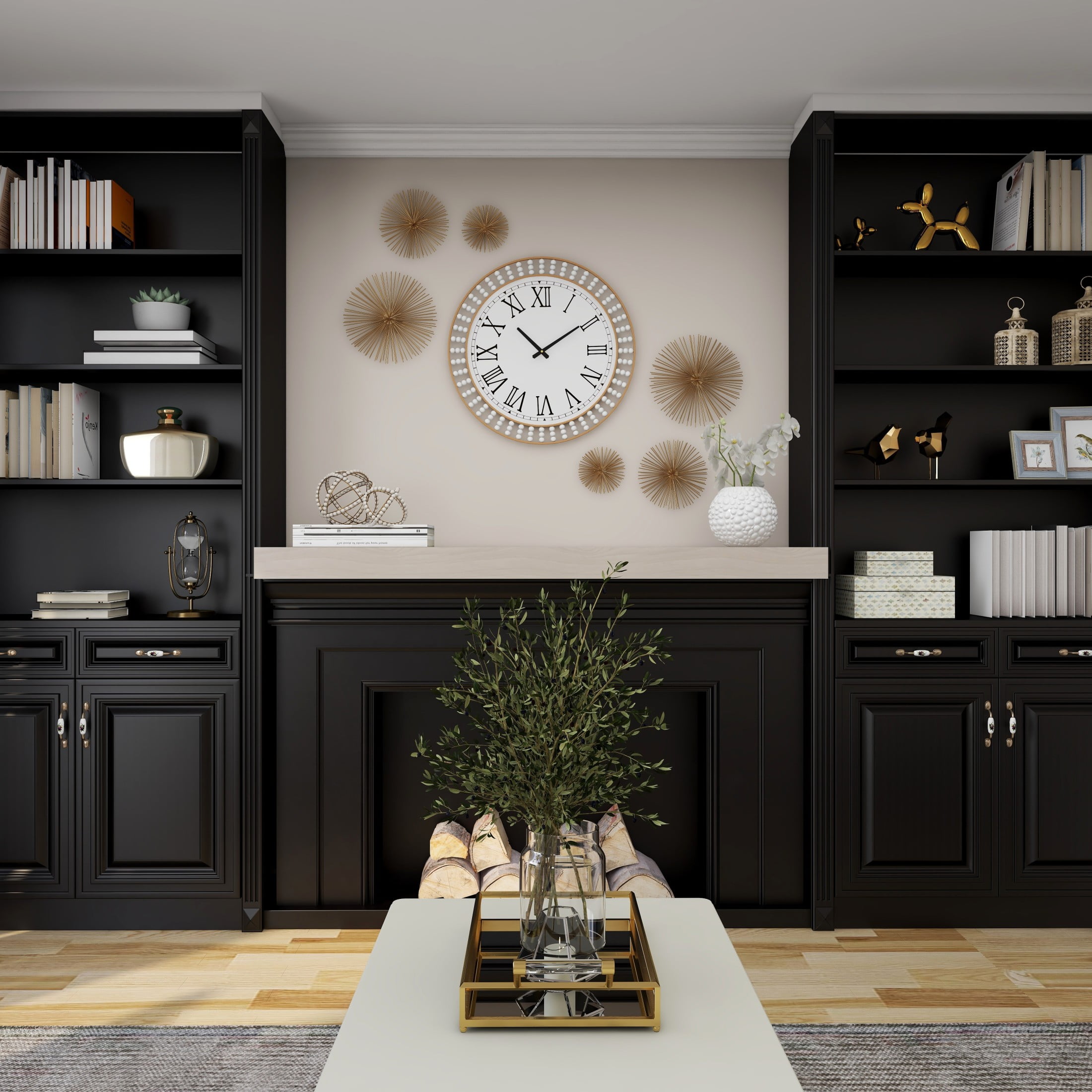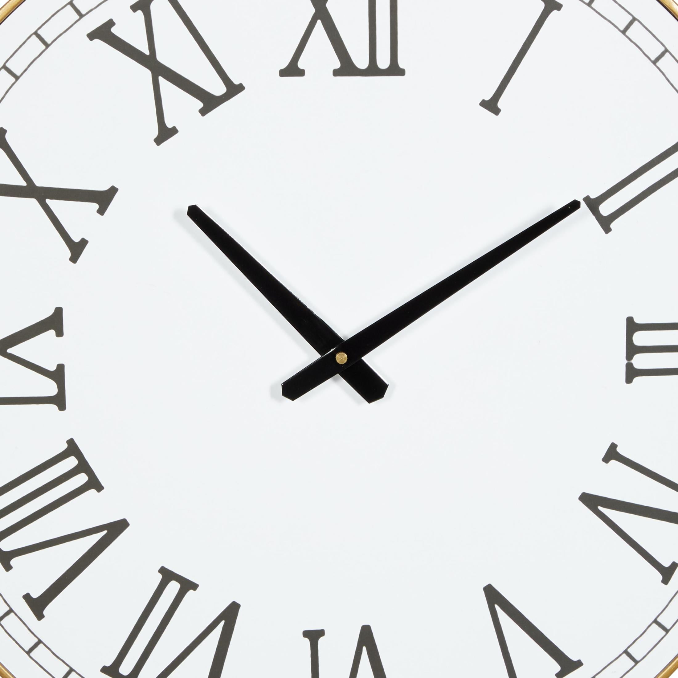Embrace artistic expression with a style that highlights bold designs with sleek lines, neutral elements, and a minimalist aesthetic White decorative wall clock is crafted from premium wood and sturdy metal materials, ensuring both durability and elegance Round wall clock for decoration comes with an oiled white finish face, black numerals, and clock hands, adorned with gold metal frame and white beads The wood wall clock features Roman numerals, and two outer gold ring frames adorned with white beads that create a textured and eye-catching effect The white wood wall clock measures 23.90L x 1.90W x 24H inches, and weighs 6.27 lbs With its round shape, roman numerals, and intricate beaded details, this oiled white oversized wall clock is both functional and visually stunning Wipe clean with a dry cloth Contemporary wall clock for kitchen boasts a welded metal frame and wood frame with attached metal backing hardware for secure mounting Contemporary style DecMode 24″ White Wood Beaded Wall Clock with Gold Metal Frame and Black Accents makes a perfect addition to any home