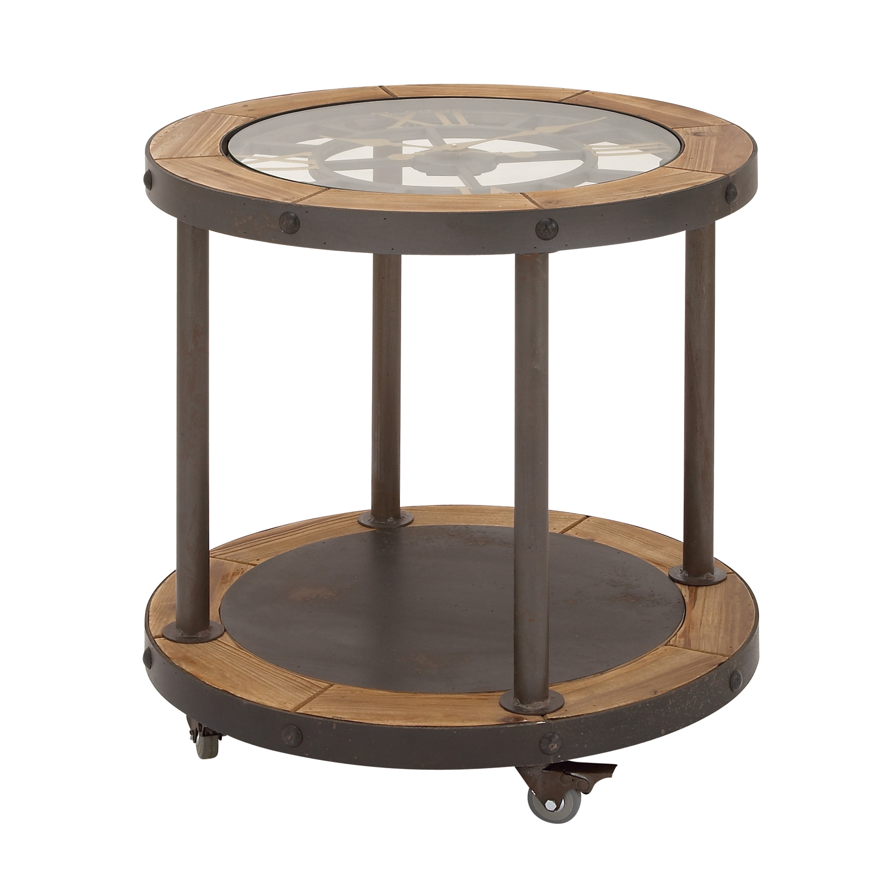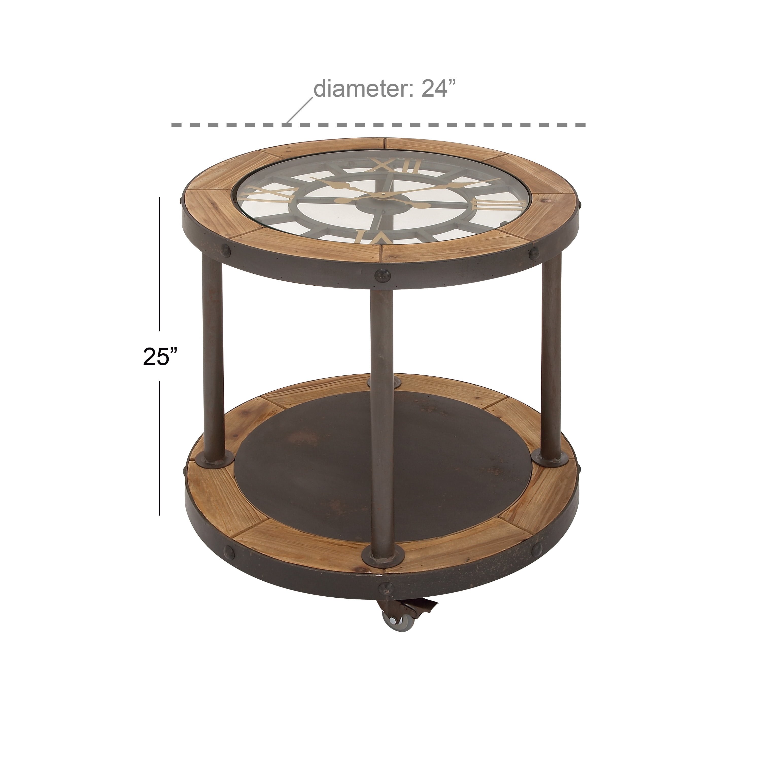 Designed with rugged charm and edgy allure, where metal finishes and raw materials unite to create an urban aesthetic that showcases your artistic expression Accent table with clock top is made of clear tempered glass, metal and wood and mdf Round wooden accent table features clear glass top, brown wood panels, black frames with gold metal accent Industrial side table features a functional clock tabletop with spacious bottom shelf and supported by 4 caster wheels with lock mechanism for optimal display and mobility The accent table measures 24L x 24W x 25H inches, and weighs 30.8 lbs A metal and glass accent table highlighting circular glass top with clock embellishment and round lower shelf with wheels Wipe clean with a dry cloth The caster wheels of this round metal side table are securely installed and attached to the bottom shelf for portability Industrial style DecMode 24″ x 25″ Brown Metal 1 Shelf Accent Table with Clock Top, 1-Piece makes a perfect addition to any home