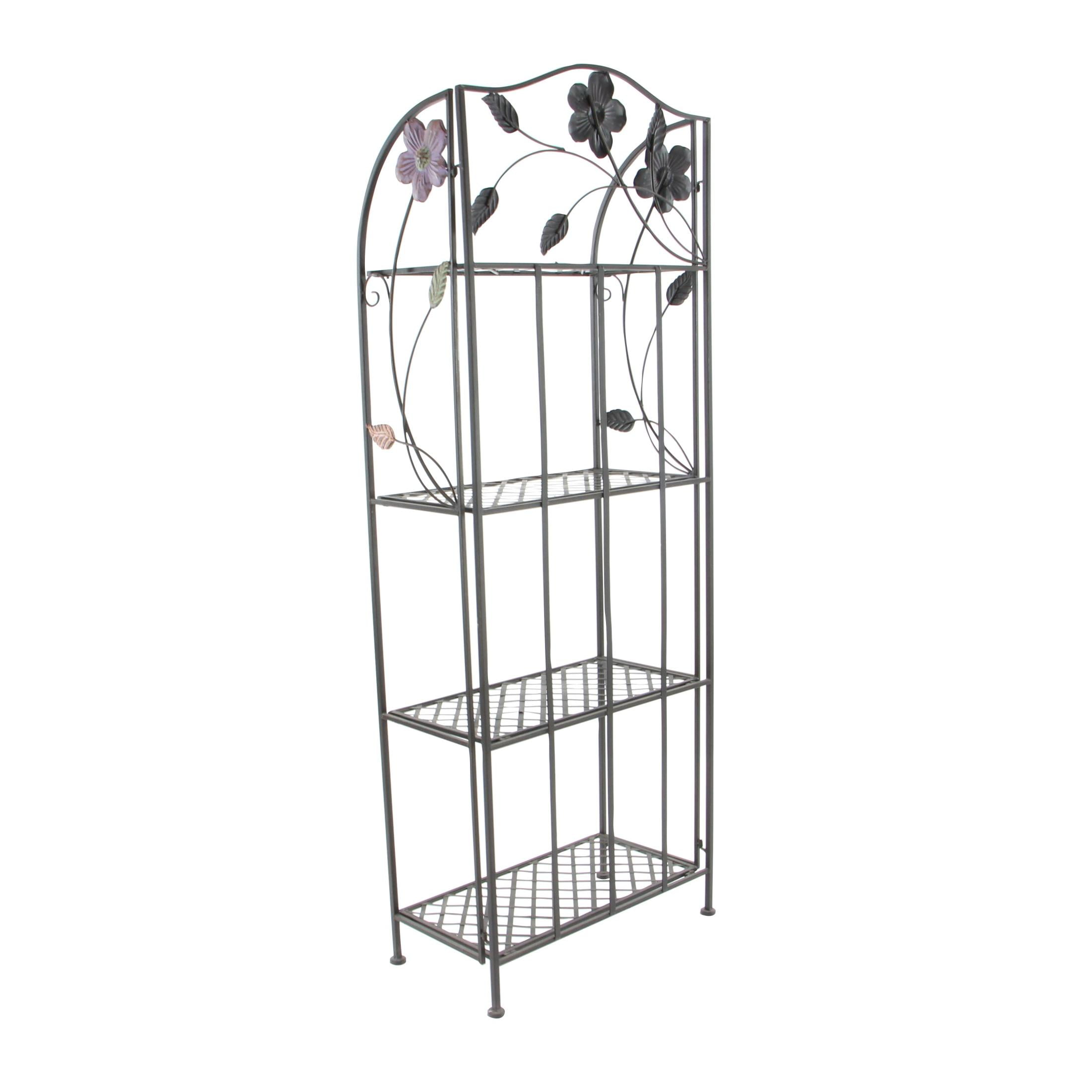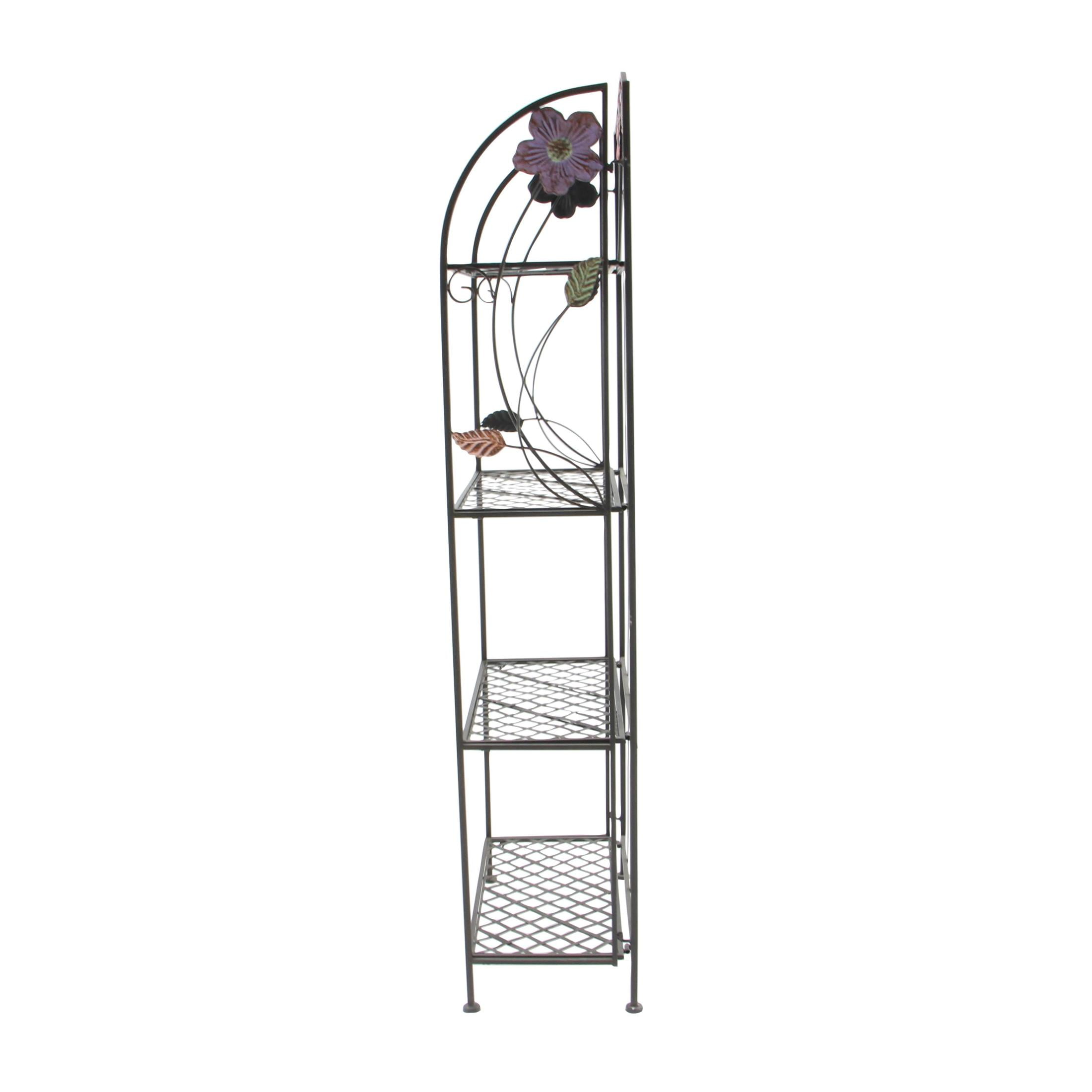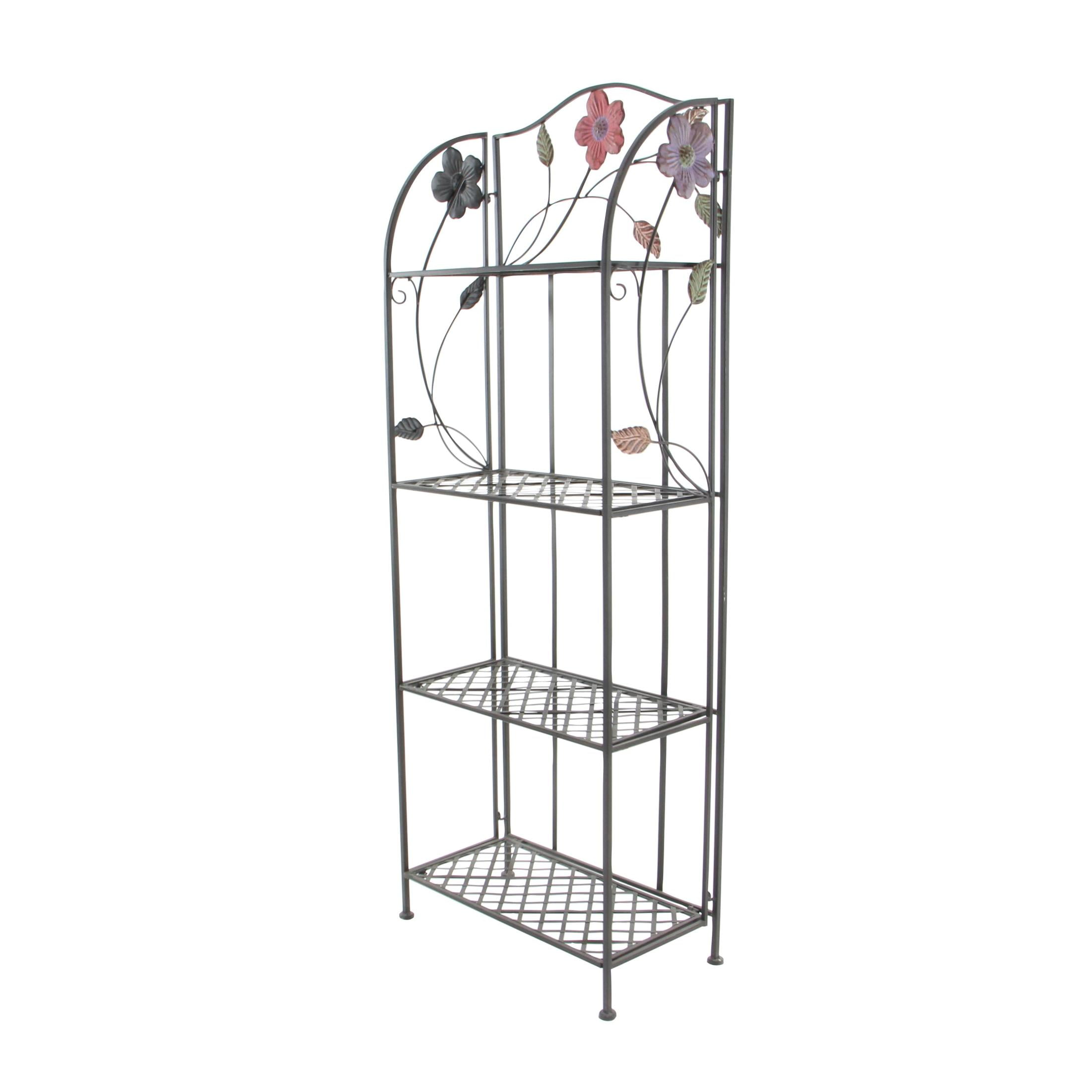 DecMode 25″ x 68″ Black Metal Floral Indoor Outdoor Tall Folding 4 Shelves Bakers Rack, 1-Piece is a unique addition to your stylish home. A storage piece that is spacious to keep your valuable organized and safe. Appreciate their design best against solid-colored backgrounds. Display this traditional shelving rack inside or out and filled with bright-colored potted cacti and flowers. Designed with felt or rubber stoppers at the base that prevent scratching furniture and table tops, as well as sliding around. This item ships in 1 carton. Large, decorative metal indoor and outdoor storage unit with 4 rack shelves. A great versatile decor for indoor or outdoor display but are not rust or weather resistant. This item ships fully assembled in one piece. Maximum weight limit is 40 lbs. This is a single black colored display shelf. Iron bakers rack features 4 shelves. Traditional style.