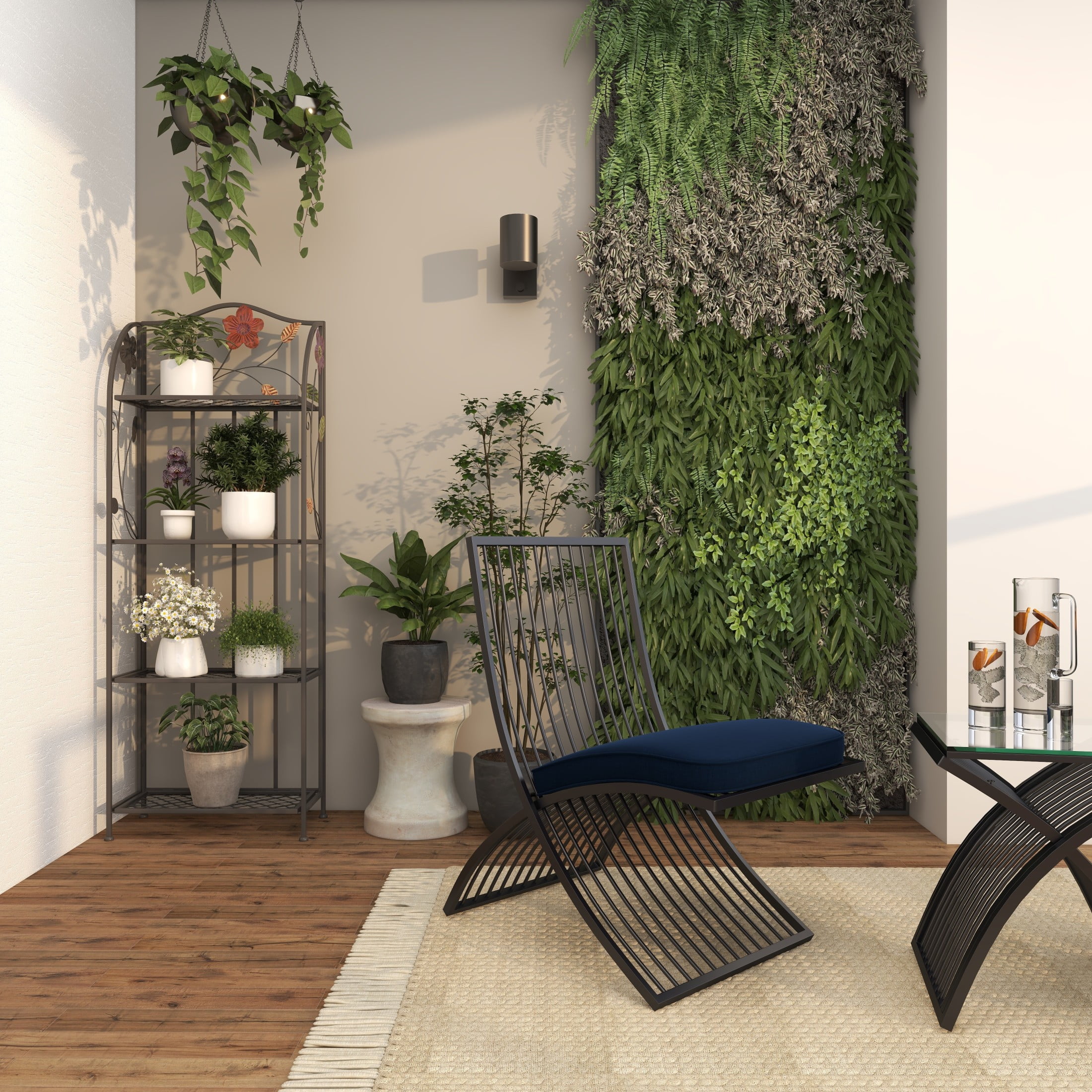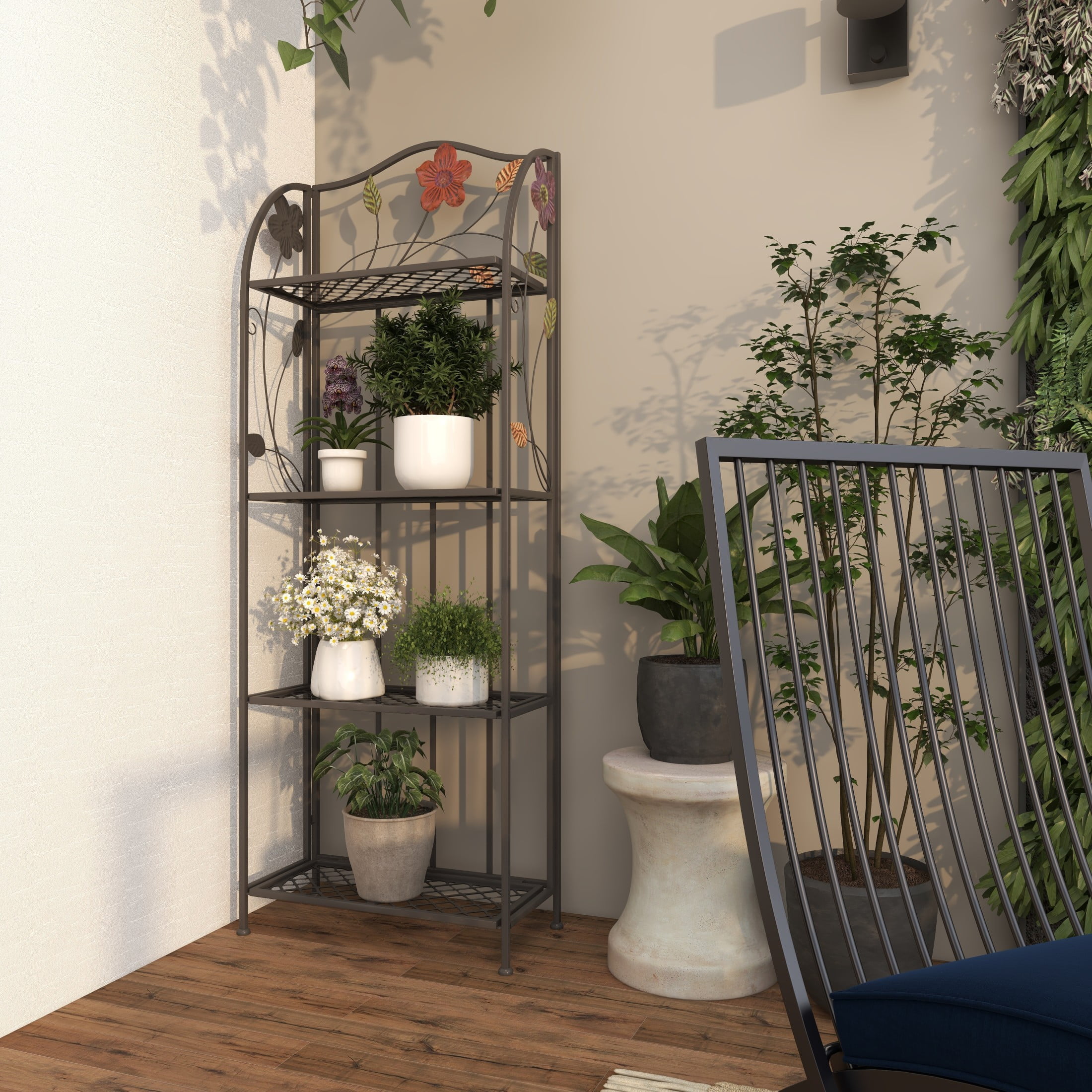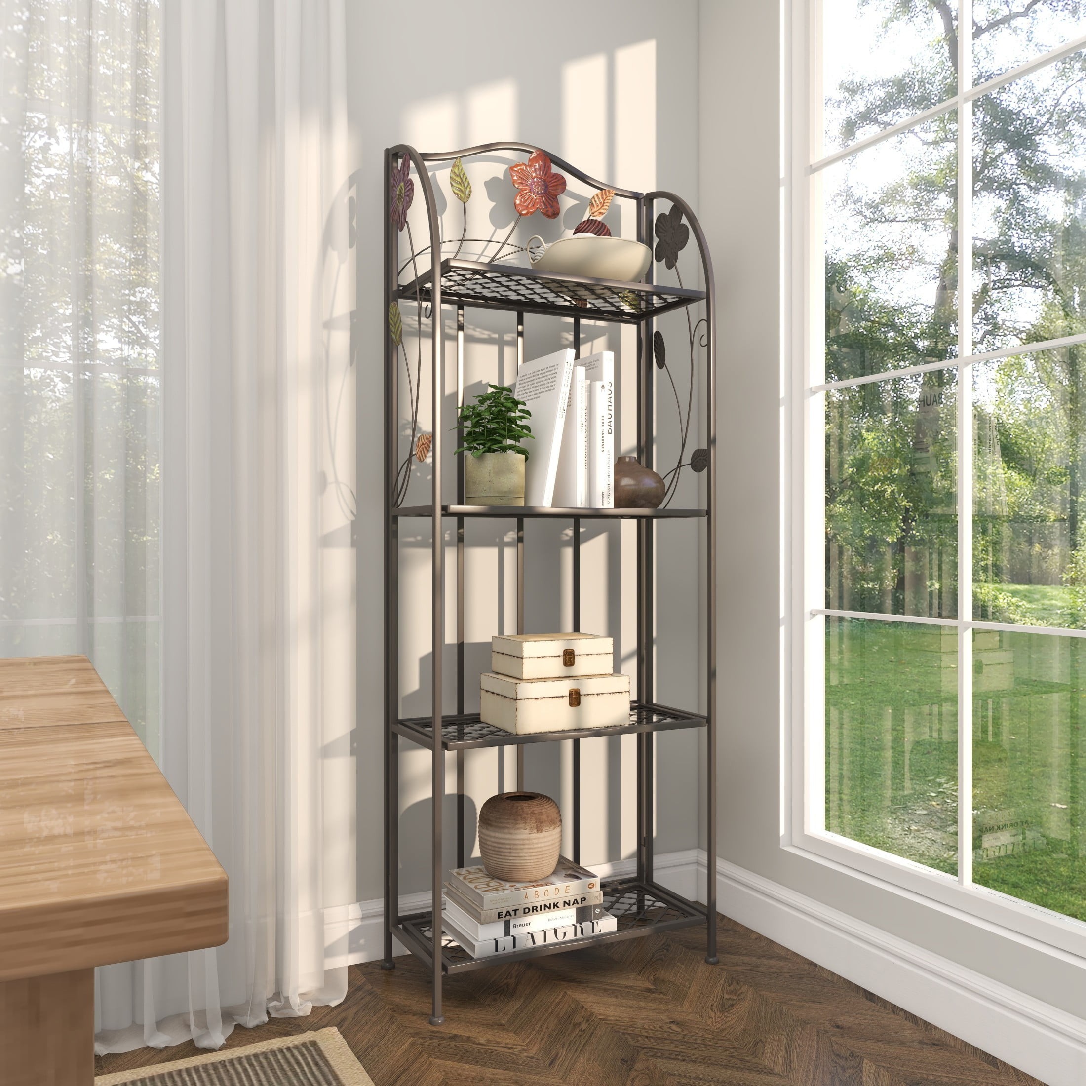 DecMode 25″ x 68″ Black Metal Floral Indoor Outdoor Tall Folding 4 Shelves Bakers Rack, 1-Piece is a unique addition to your stylish home. A storage piece that is spacious to keep your valuable organized and safe. Appreciate their design best against solid-colored backgrounds. Display this traditional shelving rack inside or out and filled with bright-colored potted cacti and flowers. Designed with felt or rubber stoppers at the base that prevent scratching furniture and table tops, as well as sliding around. This item ships in 1 carton. Large, decorative metal indoor and outdoor storage unit with 4 rack shelves. A great versatile decor for indoor or outdoor display but are not rust or weather resistant. This item ships fully assembled in one piece. Maximum weight limit is 40 lbs. This is a single black colored display shelf. Iron bakers rack features 4 shelves. Traditional style.