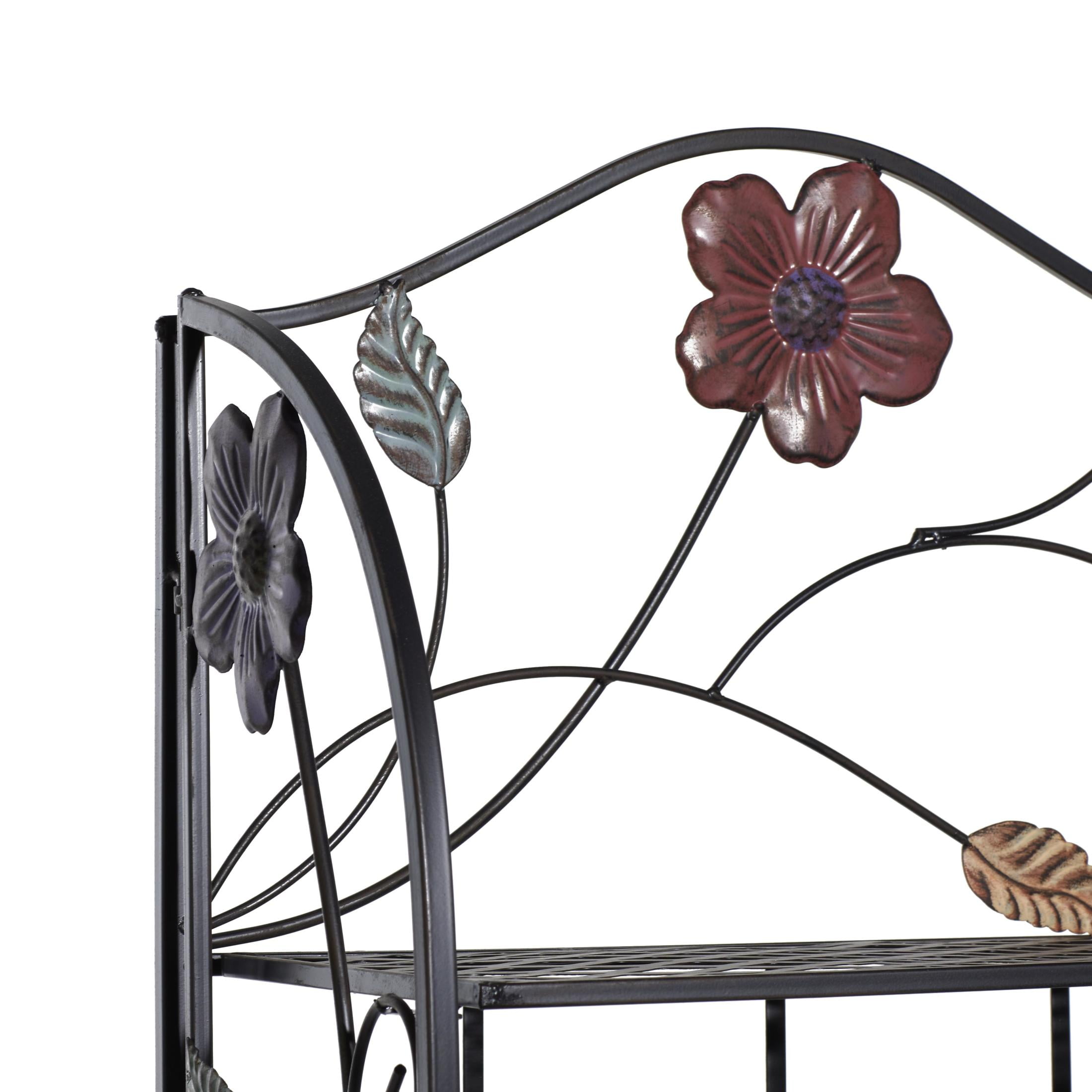 Designed with timeless sophistication, rich old-world textures and warm hues come together for a refined classic taste of luxury Traditional standing shelves are crafted of a solid metal frame structure Rectangular storage unit carries black frames with muted embossed floral of green, blue, red and pink Metal shelving storage unit features vibrant metal flower sculptures with spacious grid style shelves in a slender structure for a sleek and secure display The black metal bakers rack measures 25L x 12W x 68H inches, and weighs 23.0 lbs Tall vertical display unit designed with grid-style shelves crafted with floral and scrollwork embellishments Wipe clean with a dry cloth Molded floral embellishments are welded to the frame for a refreshing and robust design Traditional style DecMode 25″ x 68″ Black Metal Floral Indoor Outdoor Tall Folding 4 Shelves Bakers Rack, 1-Piece makes a perfect addition to any home