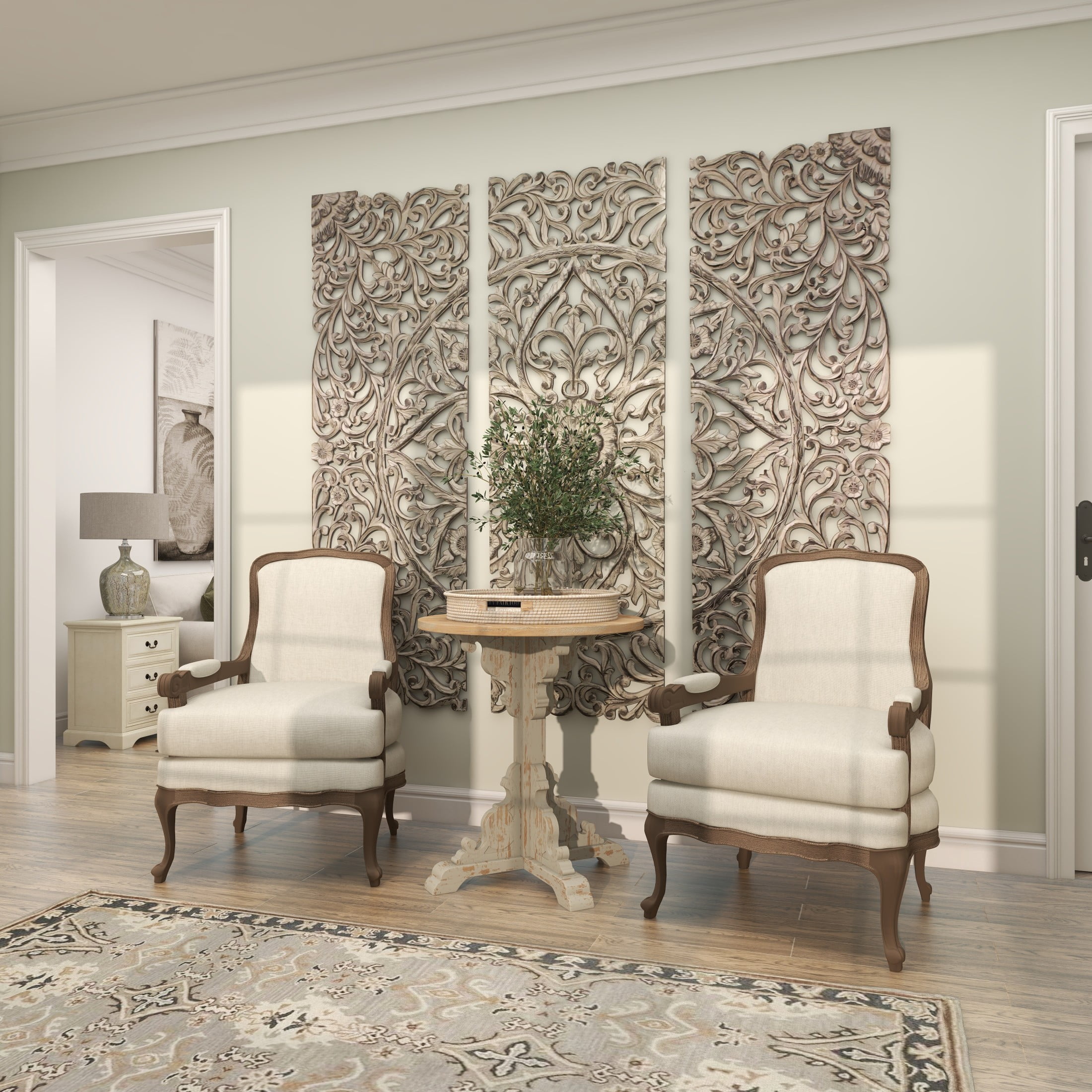 | Color | Cream Distressed Carved Solid Scroll Round 26" x 26" x 29" |
